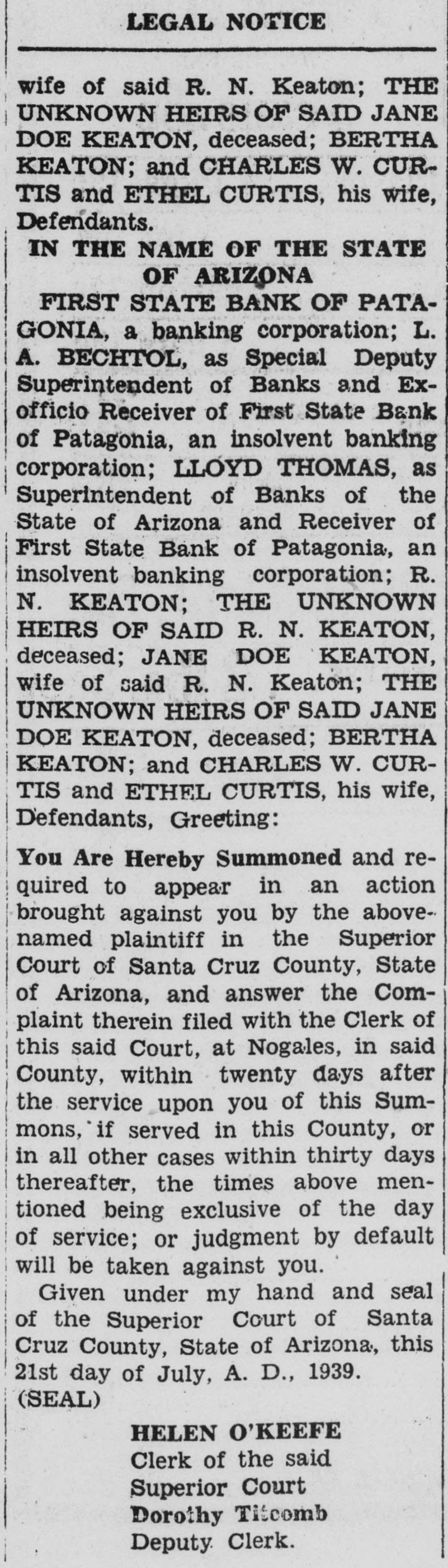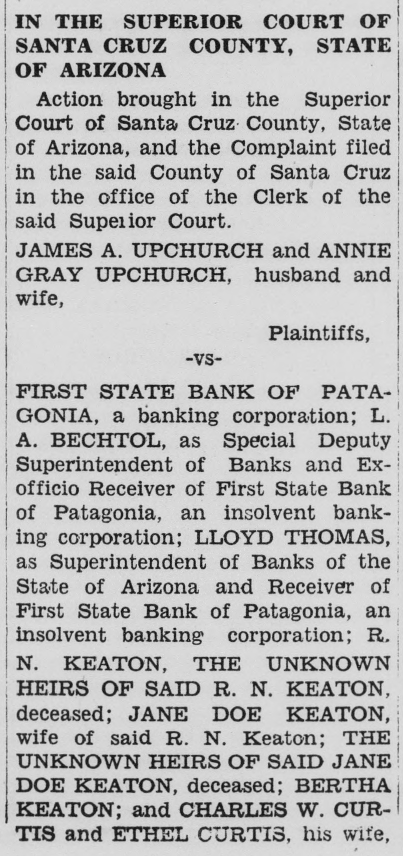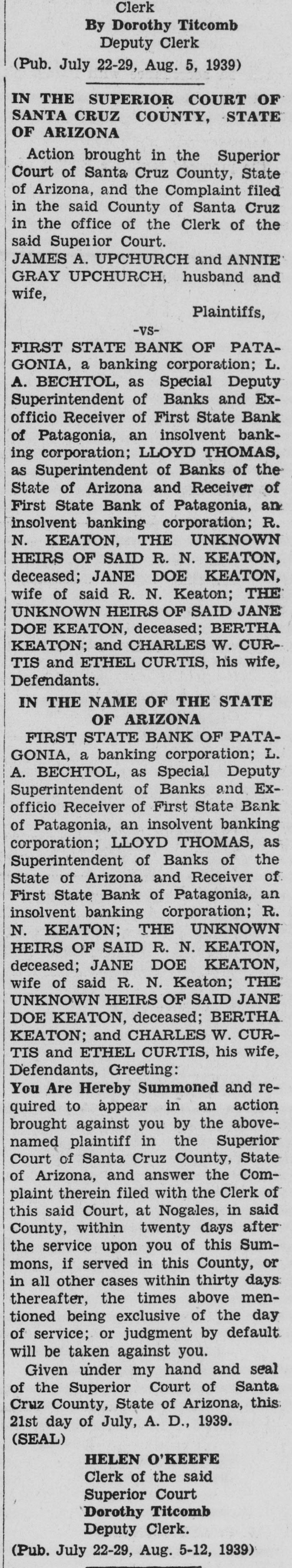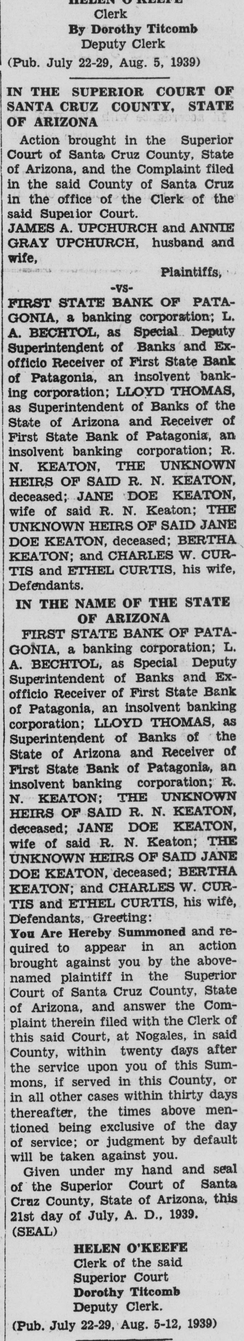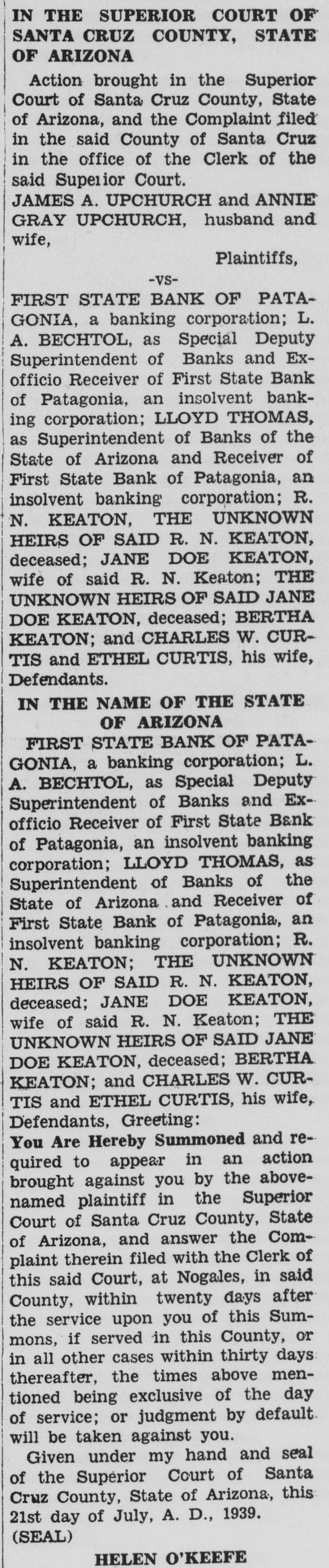 IN THE SUPERIOR COURT OF SANTA CRUZ COUNTY, STATE OF ARIZONA Action brought in the Superior Court of Santa Cruz County, State of Arizona, and the Complaint filed in the said County of Santa Cruz in the office of the Clerk of the said Superior Court. JAMES A. UPCHURCH and ANNIE GRAY UPCHURCH, husband and wife, Plaintiffs, -VSFIRST STATE BANK OF PATAGONIA, a banking corporation; L. A. BECHTOL, as Special Deputy Superintendent of Banks and Exofficio Receiver of First State Bank of Patagonia, an insolvent banking corporation; LLOYD THOMAS, as Superintendent of Banks of the State of Arizona and Receiver of First State Bank of Patagonia, an insolvent banking corporation; R. N. KEATON, THE UNKNOWN HEIRS OF SAID R. N. KEATON, deceased; JANE DOE KEATON, wife of said R. N. Keaton; THE UNKNOWN HEIRS OF SAID JANE DOE KEATON, deceased; BERTHA KEATON; and CHARLES W. CURTIS and ETHEL CURTIS, his wife, Defendants. IN THE NAME OF THE STATE OF ARIZONA FIRST STATE BANK OF PATAGONIA, a banking corporation; L. A. BECHTOL, as Special Deputy Superintendent of Banks and Exofficio Receiver of First State Bank of Patagonia, an insolvent banking corporation; LLOYD THOMAS, as Superintendent of Banks of the State of Arizona and Receiver of First State Bank of Patagonia, an insolvent banking corporation; R. N. KEATON; THE UNKNOWN HEIRS OF SAID R. N. KEATON, deceased; JANE DOE KEATON, wife of said R. N. Keaton; THE UNKNOWN HEIRS OF SAID JANE DOE KEATON, deceased; BERTHA KEATON; and CHARLES W. CURTIS and ETHEL CURTIS, his wife, Defendants, Greeting: You Are Hereby Summoned and required to appear in an action brought against you by the abovenamed plaintiff in the Superior Court of Santa Cruz County, State of Arizona, and answer the Complaint therein filed with the Clerk of this said Court, at Nogales, in said County, within twenty days after the service upon you of this Summons, if served in this County, or in all other cases within thirty days: thereafter, the times above mentioned being exclusive of the day of service; or judgment by default will be taken against you. Given under my hand and seal of the Superior Court of Santa Cruz County, State of Arizona, this 21st day of July, A. D., 1939. (SEAL) O'KEEFF