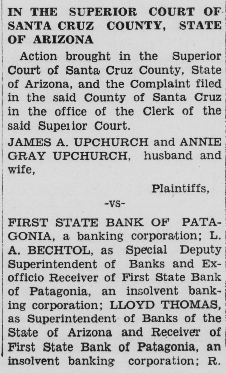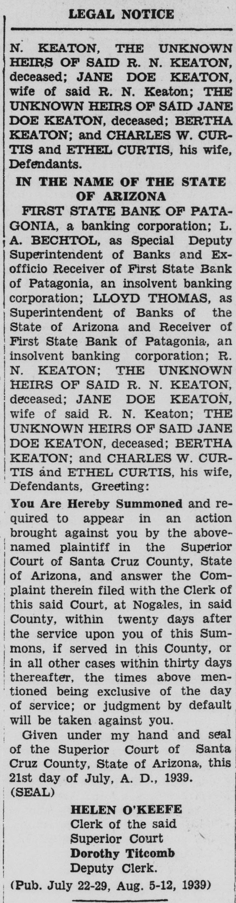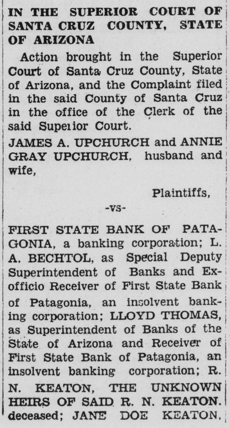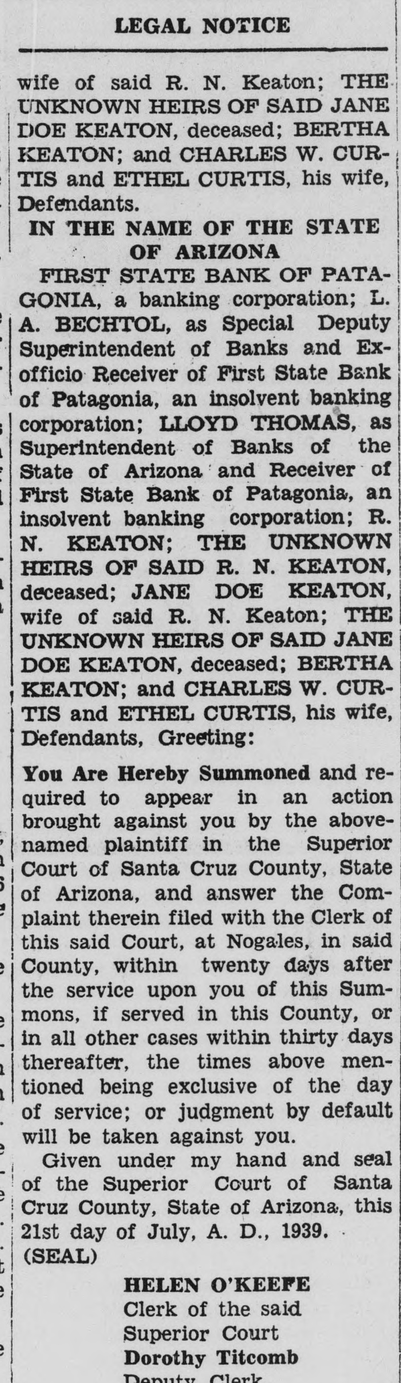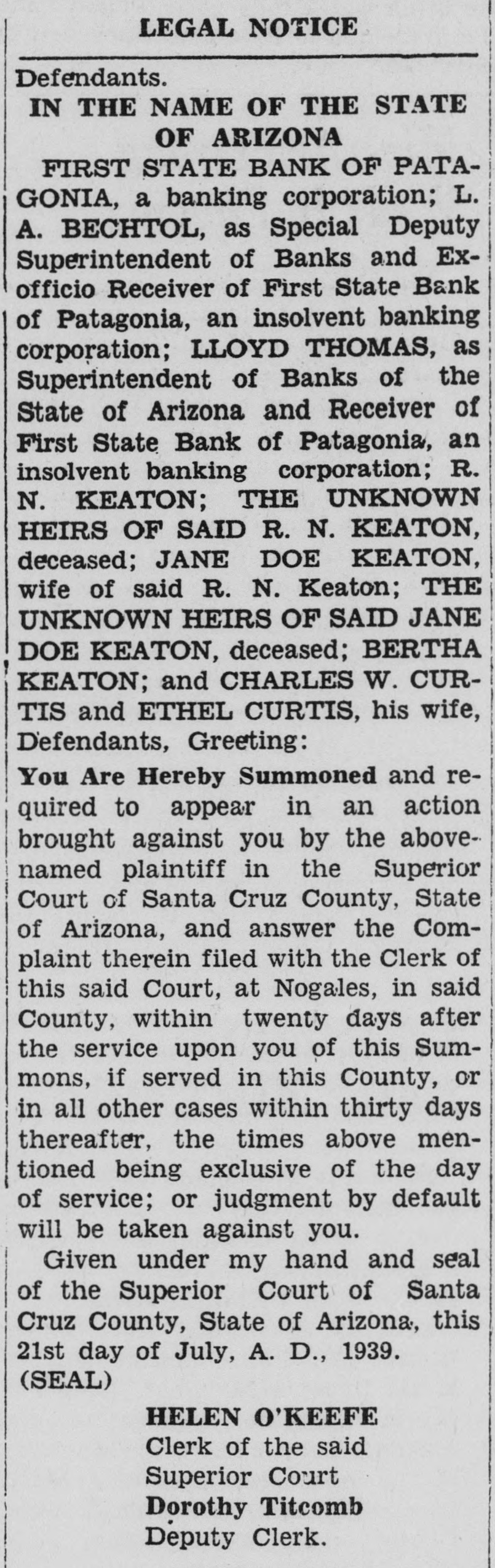 IN THE SUPERIOR COURT OF SANTA CRUZ COUNTY, STATE OF ARIZONA Action brought in the Superior Court of Santa Cruz County, State of Arizona, and the Complaint filed in the said County of Santa Cruz in the office of the Clerk of the said Superior Court. JAMES A. UPCHURCH and ANNIE GRAY UPCHURCH, husband and wife, Plaintiffs, -VSFIRST STATE BANK OF PATAGONIA, a banking corporation; L. A. BECHTOL, as Special Deputy Superintendent of Banks and Exofficio Receiver of First State Bank of Patagonia, an insolvent banking corporation; LLOYD THOMAS, as Superintendent of Banks of the State of Arizona and Receiver of First State Bank of Patagonia, an insolvent banking corporation; R. N. KEATON, THE UNKNOWN HEIRS OF SAID R. N. KEATON, deceased; JANE DOE KEATON, wife of said R. N. Keaton; THE UNKNOWN HEIRS OF SAID JANE DOE KEATON, deceased; BERTHA KEATON; and CHARLES W. CURTIS and ETHEL CURTIS, his wife, Defendants. IN THE NAME OF THE STATE OF ARIZONA FIRST STATE BANK OF PATAGONIA, a banking corporation; L. A. BECHTOL, as Special Deputy Superintendent of Banks and Exofficio Receiver of First State Bank of Patagonia, an insolvent banking corporation; LLOYD THOMAS, as Superintendent of Banks of the State of Arizona and Receiver of First State Bank of Patagonia, an insolvent banking corporation; R. N. KEATON; THE UNKNOWN HEIRS OF SAID R. N. KEATON, deceased; JANE DOE KEATON, wife of said R. N. Keaton; THE UNKNOWN HEIRS OF SAID JANE DOE KEATON, deceased; BERTHA KEATON; and CHARLES W. CURTIS and ETHEL CURTIS, his wife, Defendants, Greeting: You Are Hereby Summoned and required to appear in an action brought against you by the abovenamed plaintiff in the Superior Court of Santa Cruz County, State of Arizona, and answer the Complaint therein filed with the Clerk of this said Court, at Nogales, in said County, within twenty days after the service upon you of this Summons, if served in this County, or in all other cases within thirty days: thereafter, the times above mentioned being exclusive of the day of service; or judgment by default will be taken against you. Given under my hand and seal of the Superior Court of Santa Cruz County, State of Arizona, this 21st day of July, A. D., 1939. (SEAL) O'KEEFF
