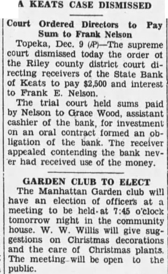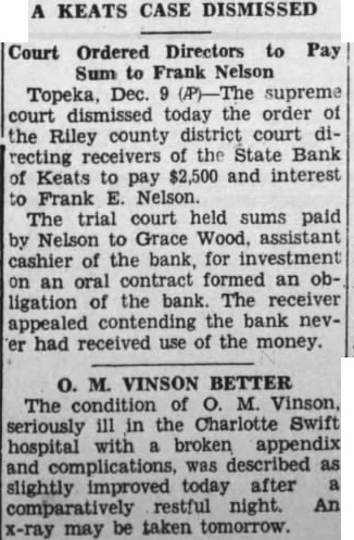 Court Ordered Directors to Sum Frank Nelson Topeka, Dec. supreme today order the Riley county district court recting receivers the State Bank Keats pay $2,500 and interest Frank Nelson. The trial court held sums paid Nelson Grace assistant cashier of the bank, for formed an obligation of the bank The receiver appealed the bank had received use the money.