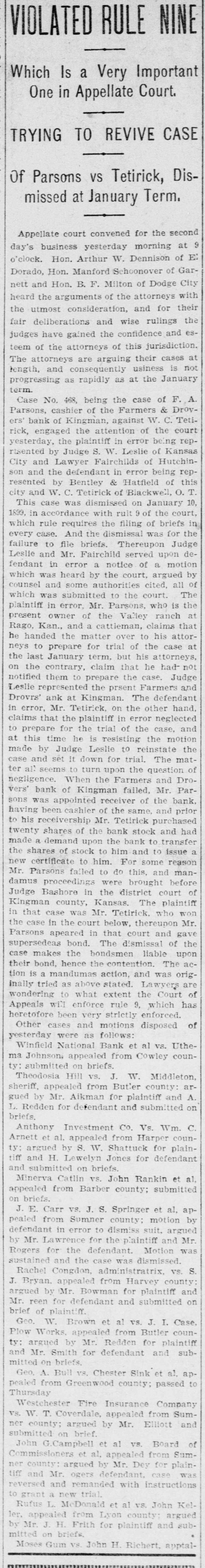 # VIOLATED RULE NINE Which Is a Very Important One in Appellate Court. # TRYING TO REVIVE CASE Of Parsons vs Tetirick, Dismissed at January Term. Appellate court convened for the second day's business yesterday morning at 9 o'clock. Hon. Arthur W. Dennison of El Dorado, Hon. Manford Schoonover of Garnett and Hon. B. F. Milton of Dodge City heard the arguments of the attorneys with the utmost consideration, and for their fair deliberations and wise rulings the judges have gained the confidence and esteem of the attorneys of this jurisdiction. The attorneys are arguing their cases at length, and consequently usiness is not progressing as rapidly as at the January term. Case No. 468, being the case of F. A. Parsons, cashier of the Farmers & Drov-ers' bank of Kingman, against W. C. Tetirick, engaged the attention of the court yesterday, the plaintiff in error being reprisented by Judge S. W. Leslie of Kansas City and Lawyer Fairchilds of Hutchinson and the defendant in error being represented by Bentley & Hatfield of this city and W. C. Tetirick of Blackwell, O. T. This case was dismissed on January 10, 1899, in accordance with rult 9 of the court, which rule requires the filing of briefs in every case. And the dismissal was for the failure to file briefs. Thereupon Judge Leslie and Mr. Fairchild served upon defendant in error a notice of a motion which was heard by the court, argued by counsel and some authorities cited, all of which was submitted to the court. The plaintiff in error, Mr. Parsons, who is the present owner of the Valley ranch at Rago, Kan., and a cattieman, claims that he handed the matter over to his attorneys to prepare for trial of the case at the last January term, but his attorneys, on the contrary, claim that he had not notified them to prepare the case. Judge Leslie represented the prsent Farmers and Drovrs' ank at Kingman. The defendant in error, Mr. Tetirick, on the other hand, claims that the plaintiff in error neglected to prepare for the trial of the case, and at this time he is resisting the motion made by Judge Leslie to reinstate the case and set it down for trial. The matter all seems to turn upon the question of negligence. When the Farmers and Drovers' bank of Kingman failed, Mr. Parsons was appointed receiver of the bank, having been cashier of the same, and prior to his receivership Mr. Tetirick purchased twenty shares of the bank stock and had made a demand upon the bank to transfer the shares of stock to him and to issue a new certificate to him. For some reason Mr. Parsons failed to do this, and mandamus proceedings were brought before Judge Bashore in the district court of Kingman county, Kansas. The plaintiff in that case was Mr. Tetirick, who won the case in the court below, thereupon Mr. Parsons apeared in that court and gave supersedeas bond. The dismissal of the case makes the bondsmen liable upon their bond, hence the contention. The action is a mandumas action, and was originally tried as above stated. Lawyers are wondering to what extent the Court of Appeals will enforce rule 9, which has heretofore been very strictly enforced. Other cases and motions disposed of yesterday were as follows: Winfield National Bank et al vs. Uthema Johnson, appealed from Cowley county; submitted on briefs. Theodosia Hill vs. J. W. Middleton, sheriff, appealed from Butler county: argued by Mr. Aikman for plaintiff and A. L. Redden for defendant and submitted on briefs. Anthony Investment Co. Vs. Wm. C. Arnett et al, appealed from Harper county; argued by S. W. Shattuck for plaintiff and H. Lewelyn Jones for defendant and submitted on briefs. Minerva Catlin vs. John Rankin et al, appealed from Barber county; submitted on briefs. J. E. Carr vs. J. S. Springer et al, appealed from Sumner county; motion by defendant in error to dismiss suit, argued by Mr. Lawrence for the plaintiff and Mr. Rogers for the defendant. Motion was sustained and the case was dismissed. Rachel Congdon, administratrix, vs. S. J. Bryan, appealed from Harvey county: argued by Mr. Bowman for plaintiff and Mr. reen for defendant and submitted on brief of plaintiff. Geo. W. Brown et al vs. J. I. Case, Plow Works, appealed from Butler county: argued by Mr. Redden for plaintiff and Mr. Smith for defendant and submitted on briefs, Geo. A. Bull vs. Chester Sink et al, appealed from Greenwood county; passed to Thursday Westchester Fire Insurance Company vs. W. T. Coverdale, appealed from Sumner county; argued by Mr. Elliott and submitted on brief. John G.Campbell et al vs. Board of Commissioners et al, appealed from Sumner county: argued by Mr. Dey for plaintiff and Mr. ogers defendant, case was reversed and remanded with instructions to grant a new trial. Rufus L. McDonald et al vs. John Keller, appealed from Lyon county: argued by Mr. J. H. Frith for plaintiff and submitted on briefs. Moses Gum vs. John H. Richert, apptal-