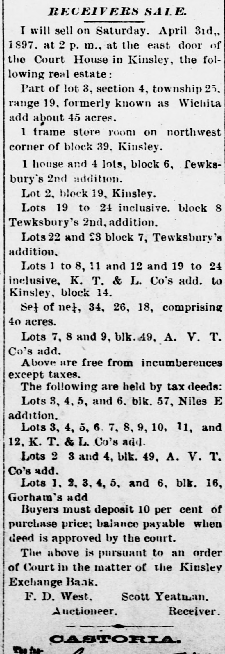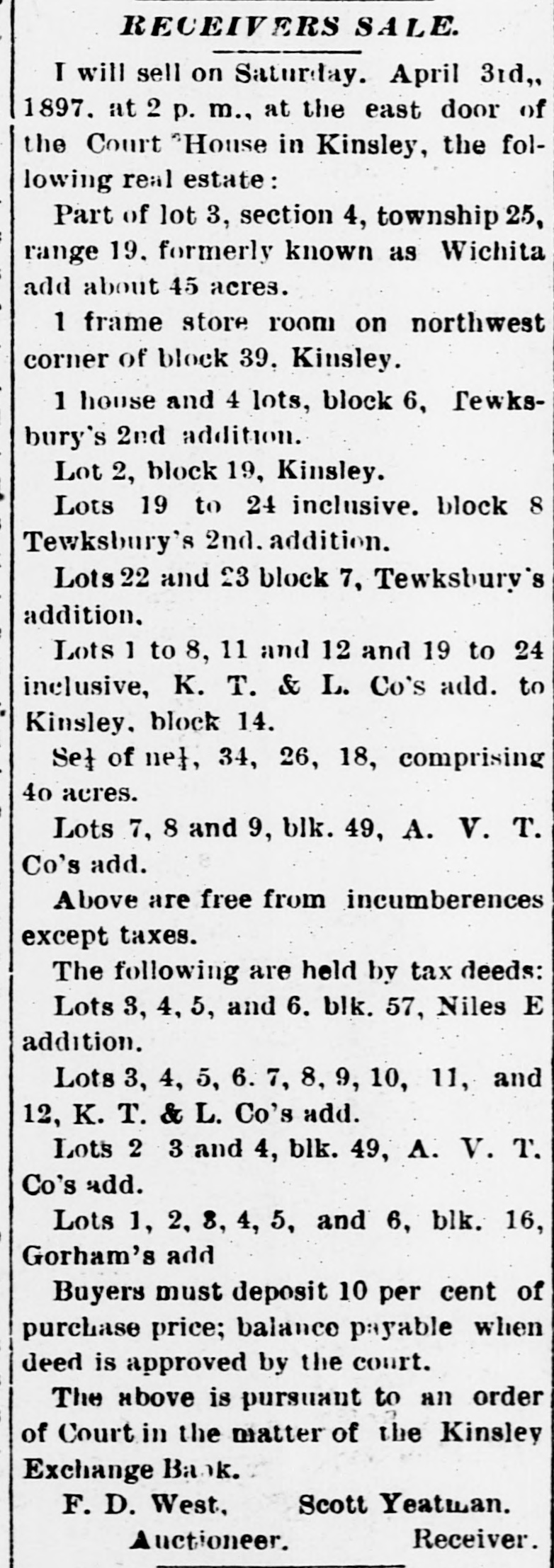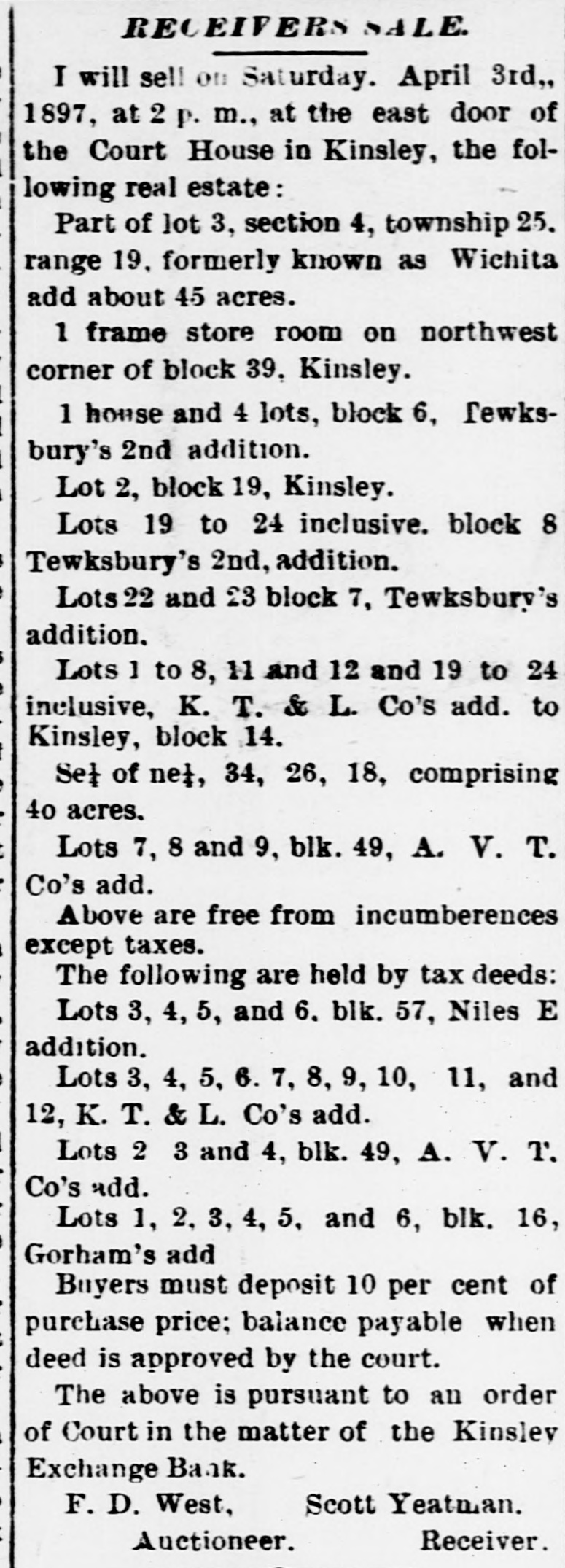 RECEIVERS SALE. I will sell on Saturday. April 31d,, 1897. at 2 p. m., at the east door of the Court "House in Kinsley, the following real estate: Part of lot 3, section 4, township 25, range 19. formerly known as Wichita add about 45 acres. 1 frame store room on northwest corner of block 39. Kinsley. 1 house and 4 lots, block 6, Tewksbury's 2nd addition. Lot 2, block 19, Kinsley. Lots 19 to 24 inclusive. block 8 Tewksbury's 2nd. addition. Lots 22 and 23 block 7, Tewksbury's addition. Lots 1 to 8, 11 and 12 and 19 to 24 inclusive, K. T. & L. Co's add. to Kinsley. block 14. Set of ne}, 34, 26, 18, comprising 40 acres. Lots 7, 8 and 9, blk. 49, A. V. T. Co's add. Above are free from incumberences except taxes. The following are held by tax deeds: Lots 3, 4, 5, and 6. blk. 57, Niles E addition. Lots 3, 4, 5, 6. 7, 8, 9, 10, 11, and 12, K. T. & L. Co's add. Lots 2 3 and 4, blk. 49, A. V. T. Co's add. Lots 1, 2, 8, 4, 5, and 6, blk. 16, Gorham's add Buyers must deposit 10 per cent of purchase price; balance payable when deed is approved by the court. The above is pursuant to an order of Court in the matter of the Kinsley Exchange Bank. Scott Yeatman. F. D. West. Receiver. Auctioneer.