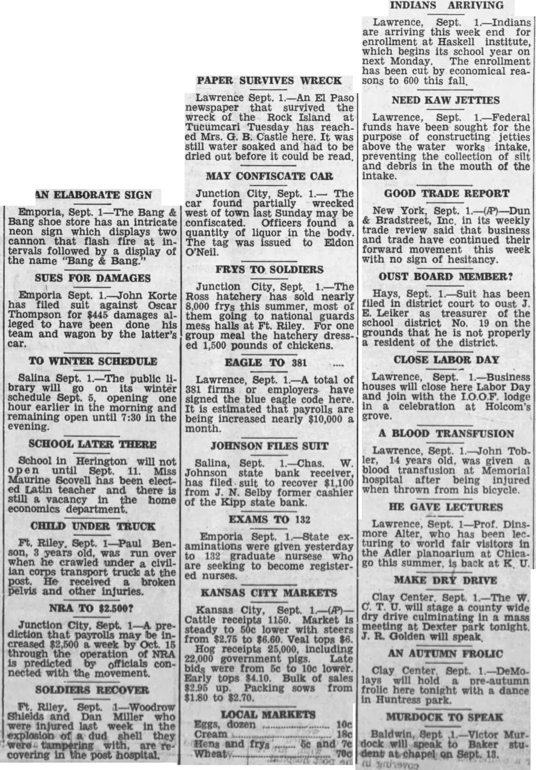 PAPER SURVIVES WRECK AN ELABORATE SIGN Emporia, Sept. Bang Bang shoe store has an neon sign which displays two cannon that flash fire at intervals followed by display of the name "Bang Lawrence Sept. El Paso newspaper that survived the wreck of the Rock Island Tuesday has reached Mrs. Castle here. was still water soaked and had to be dried out before it could be read. MAY CONFISCATE CAR INDIANS ARRIVING Lawrence, Sept. are arriving week end for enrollment at Haskell institute, which begins its school year on next Monday The has been by economical reasons to 600 this fall. NEED KAW JETTIES SUES FOR DAMAGES Emporia Sept. Korte filed against Oscar Thompson for $445 damages leged to have been done his team and wagon by the latter's car. TO WINTER SCHEDULE Junction City, Sept. The car found partially wrecked west of town Sunday may be confiscated. Officers found quantity of liquor the body. The tag was issued to Eldon O'Neil. FRYS TO SOLDIERS Junction City, Sept Ross hatchery has sold nearly 8,000 frys this summer, most them going to national guards mess halls at Riley. For one group meal the dressed pounds of chickens. Salina Sept. public brary go on its winter schedule Sept. opening one hour earlier in morning and remaining open until 7:30 in the evening. EAGLE TO SCHOOL LATER THERE Lawrence, Sept. total of firms employers have signed the blue eagle code here. is estimated that are being increased month. Lawrence, Sept. funds have been sought for the purpose of jetties above the water works intake, the of silt and debris in the mouth of the intake. GOOD TRADE REPORT New York, Sept. Bradstreet, in its weekly trade review said that business and trade have their this week with no sign of hesitancy. OUST BOARD MEMBER? Hays, Sept. has been filed district court to oust Leiker treasurer of school district No 19 on the grounds that he not properly resident of the district. CLOSE LABOR DAY Lawrence, Sept. houses will close here Labor Day and join with lodge celebration at Holcom's grove. School in Herington will not until Sept. 11. Miss Maurine Scovell has been electLatin teacher and there still vacancy in the home economics department. JOHNSON FILES SUIT A BLOOD TRANSFUSION CHILD UNDER TRUCK Salina, Sept. W. Johnson state bank receiver, has filed suit to recover from Selby former cashier of the Kipp state bank. Riley. Sept. Benyears old, was run over when he crawled under civilian transport truck at the received broken pelvis and other injuries. EXAMS TO Emporia Sept. exwere given yesterday 132 graduate nursese who are seeking to become registernurses. Lawrence, Sept. Tobler, 14 years old, was given blood transfusion Memorial hospital after being injured when thrown from his bicycle. HE GAVE LECTURES Lawrence. Sept. Dinsmore who has been turing to world fair visitors in the Adler planoarium at Chicago this summer, is back at NRA TO $2.500? Junction City, Sept. diction that inmay creased by through the NRA predicted by officials connected with the movement. SOLDIERS RECOVER Sept. Shields Dan Miller who were injured last week the explosion of dud shell they with, are covering in the post KANSAS CITY MARKETS MAKE DRY DRIVE Kansas City, Sept. Cattle receipts 1150. Market steady to 50c lower with steers from to Veal tops $6. receipts 25,000, including government pigs. Late were from 5c 10c lower. tops Bulk of sales $2.95 Packing SOWS from LOCAL Eggs, dozen 10c Cream and Clay Center. Sept. will stage wide county dry drive in Dexter tonight. Golden will speak. AN AUTUMN FROLIC Clay Center. Sept. will hold pre-autumn frolic here tonight with dance in Huntress park. MURDOCK TO SPEAK Baldwin, Murdock will speak Baker