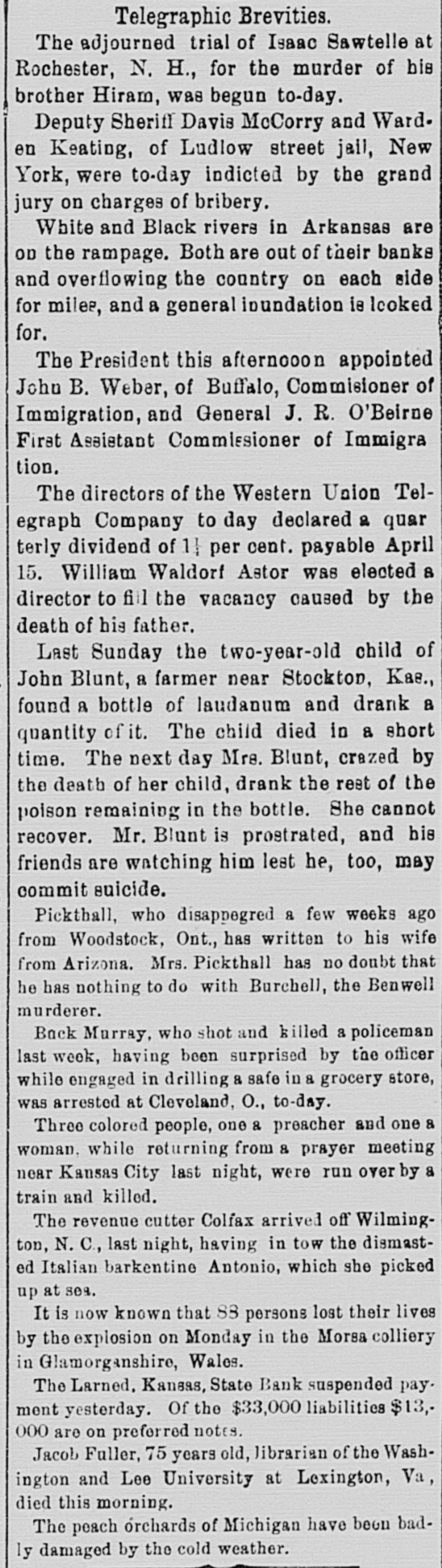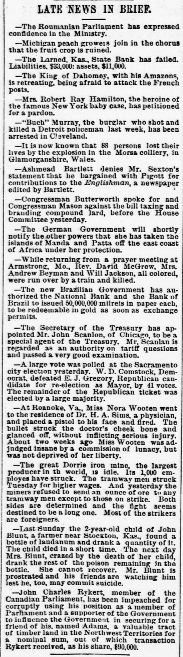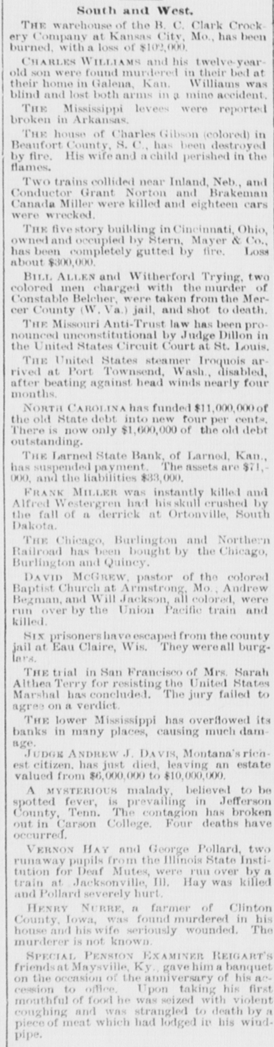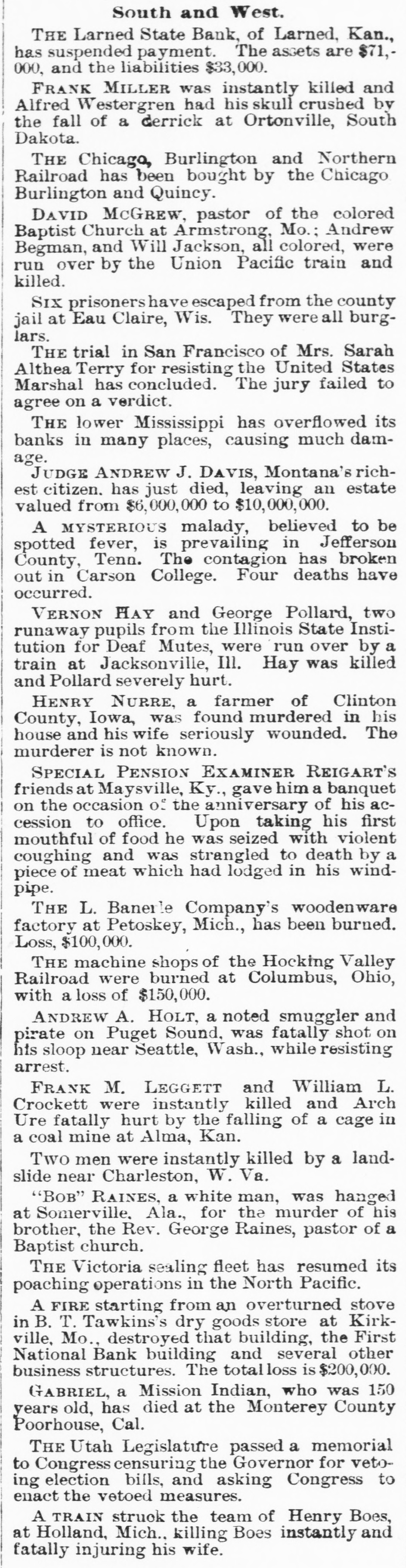 South and West. THE Larned State Bank, of Larned, Kan., has suspended payment. The assets are $71,000, and the liabilities $33,000. FRANK MILLER was instantly killed and Alfred Westergren had his skull crushed by the fall of a derrick at Ortonville, South Dakota. THE Chicago, Burlington and Northern Railroad has been bought by the Chicago Burlington and Quincy. DAVID MCGREW, pastor of the colored Baptist Church at Armstrong, Mo.; Andrew Begman, and Will Jackson, all colored, were run over by the Union Pacific train and killed. Six prisoners have escaped from the county jail at Eau Claire, Wis. They wereall burglars. THE trial in San Francisco of Mrs. Sarah Althea Terry for resisting the United States Marshal has concluded. The jury failed to agree on a verdict. THE lower Mississippi has overflowed its banks in many places, causing much damage. JUDGE ANDREW J. DAVIS, Montana's richest citizen. has just died, leaving an estate valued from $6,000,000 to $10,000,000. A MYSTERIOUS malady, believed to be spotted fever, is prevailing in Jefferson County, Tenn. The contagion has broken out in Carson College. Four deaths have occurred. VERNON HAY and George Pollard, two runaway pupils from the Illinois State Institution for Deaf Mutes, were run over by a train at Jacksonville, Ill. Hay was killed and Pollard severely hurt. HENRY NURRE, a farmer of Clinton County, Iowa, was found murdered in his house and his wife seriously wounded. The murderer is not known. SPECIAL PENSION EXAMINER REIGART'S friends: Maysville, Ky., gave him a banquet on the occasion of the anniversary of his accession to office. Upon taking his first mouthful of food he was seized with violent coughing and was strangled to death by a piece of meat which had lodged in his windpipe. THE L. Banerle Company's woodenware factory at Petoskey, Mich., has been burned. Loss, $100,000. THE machine shops of the Hocking Valley Railroad were burned at Columbus, Ohio, with a loss of $150,000. ANDREW A. HOLT, a noted smuggler and pirate on Puget Sound, was fatally shot on his sloop near Seattle, Wash., while resisting arrest. FRANK M. LEGGETT and William L. Crockett were instantly killed and Arch Ure fatally hurt by the falling of a cage in a coal mine at Alma, Kan. Two men were instantly killed by a landslide near Charleston, W. Va. "BoB" RAINES. a white man, was hanged at Somerville, Ala., for the murder of his brother, the Rev. George Raines, pastor of a Baptist church. THE Victoria sealing fleet has resumed its poaching operations in the North Pacific. A FIRE starting from an overturned stove in B. T. Tawkins's dry goods store at Kirkville, Mo., destroyed that building, the First National Bank building and several other business structures. The total loss is $200,000. GABRIEL, a Mission Indian, who was 150 years old, has died at the Monterey County Poorhouse, Cal. THE Utah Legislature passed a memorial to Congress censuring the Governor for vetoing election bills, and asking Congress to enact the vetoed measures. A TRAIN struck the team of Henry Boes, at Holland, Mich.. killing Boes instantly and fatally injuring his wife.