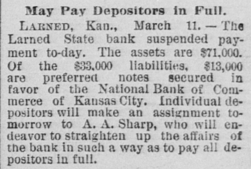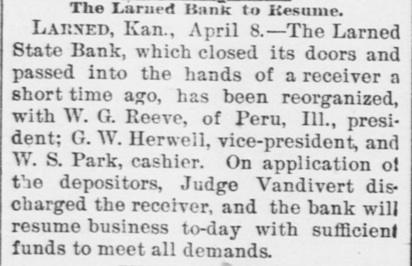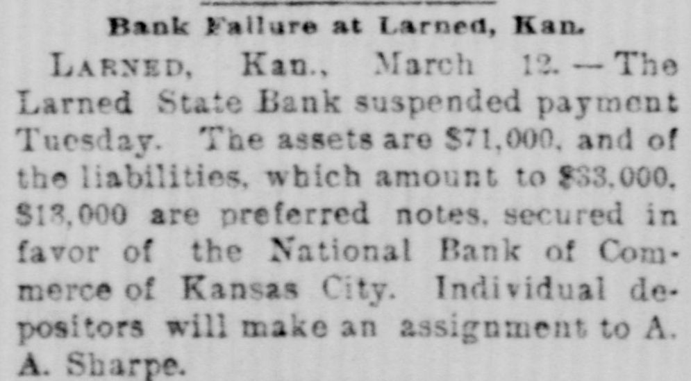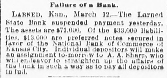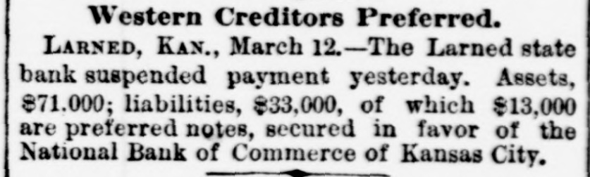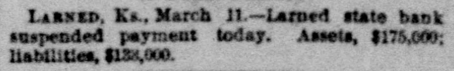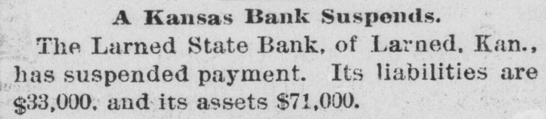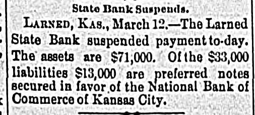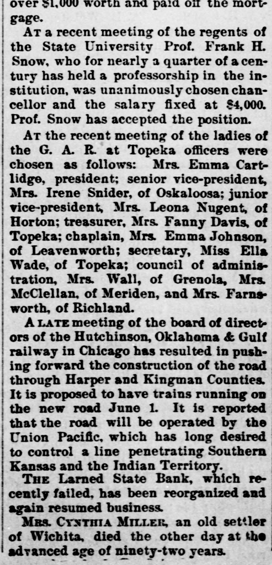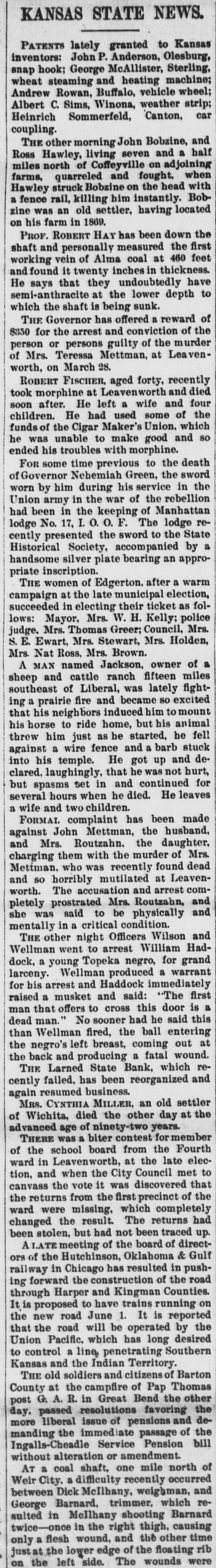 South and West. THE Larned State Bank, of Larned, Kan., has suspended payment. The assets are $71,000, and the liabilities $33,000. FRANK MILLER was instantly killed and Alfred Westergren had his skull crushed by the fall of a derrick at Ortonville, South Dakota. THE Chicago, Burlington and Northern Railroad has been bought by the Chicago Burlington and Quincy. DAVID MCGREW, pastor of the colored Baptist Church at Armstrong, Mo.; Andrew Begman, and Will Jackson, all colored, were run over by the Union Pacific train and killed. Six prisoners have escaped from the county jail at Eau Claire, Wis. They wereall burglars. THE trial in San Francisco of Mrs. Sarah Althea Terry for resisting the United States Marshal has concluded. The jury failed to agree on a verdict. THE lower Mississippi has overflowed its banks in many places, causing much damage. JUDGE ANDREW J. DAVIS, Montana's richest citizen. has just died, leaving an estate valued from $6,000,000 to $10,000,000. A MYSTERIOUS malady, believed to be spotted fever, is prevailing in Jefferson County, Tenn. The contagion has broken out in Carson College. Four deaths have occurred. VERNON HAY and George Pollard, two runaway pupils from the Illinois State Institution for Deaf Mutes, were run over by a train at Jacksonville, Ill. Hay was killed and Pollard severely hurt. HENRY NURRE, a farmer of Clinton County, Iowa, was found murdered in his house and his wife seriously wounded. The murderer is not known. SPECIAL PENSION EXAMINER REIGART'S friends: Maysville, Ky., gave him a banquet on the occasion of the anniversary of his accession to office. Upon taking his first mouthful of food he was seized with violent coughing and was strangled to death by a piece of meat which had lodged in his windpipe. THE L. Banerle Company's woodenware factory at Petoskey, Mich., has been burned. Loss, $100,000. THE machine shops of the Hocking Valley Railroad were burned at Columbus, Ohio, with a loss of $150,000. ANDREW A. HOLT, a noted smuggler and pirate on Puget Sound, was fatally shot on his sloop near Seattle, Wash., while resisting arrest. FRANK M. LEGGETT and William L. Crockett were instantly killed and Arch Ure fatally hurt by the falling of a cage in a coal mine at Alma, Kan. Two men were instantly killed by a landslide near Charleston, W. Va. "BoB" RAINES. a white man, was hanged at Somerville, Ala., for the murder of his brother, the Rev. George Raines, pastor of a Baptist church. THE Victoria sealing fleet has resumed its poaching operations in the North Pacific. A FIRE starting from an overturned stove in B. T. Tawkins's dry goods store at Kirkville, Mo., destroyed that building, the First National Bank building and several other business structures. The total loss is $200,000. GABRIEL, a Mission Indian, who was 150 years old, has died at the Monterey County Poorhouse, Cal. THE Utah Legislature passed a memorial to Congress censuring the Governor for vetoing election bills, and asking Congress to enact the vetoed measures. A TRAIN struck the team of Henry Boes, at Holland, Mich.. killing Boes instantly and fatally injuring his wife.