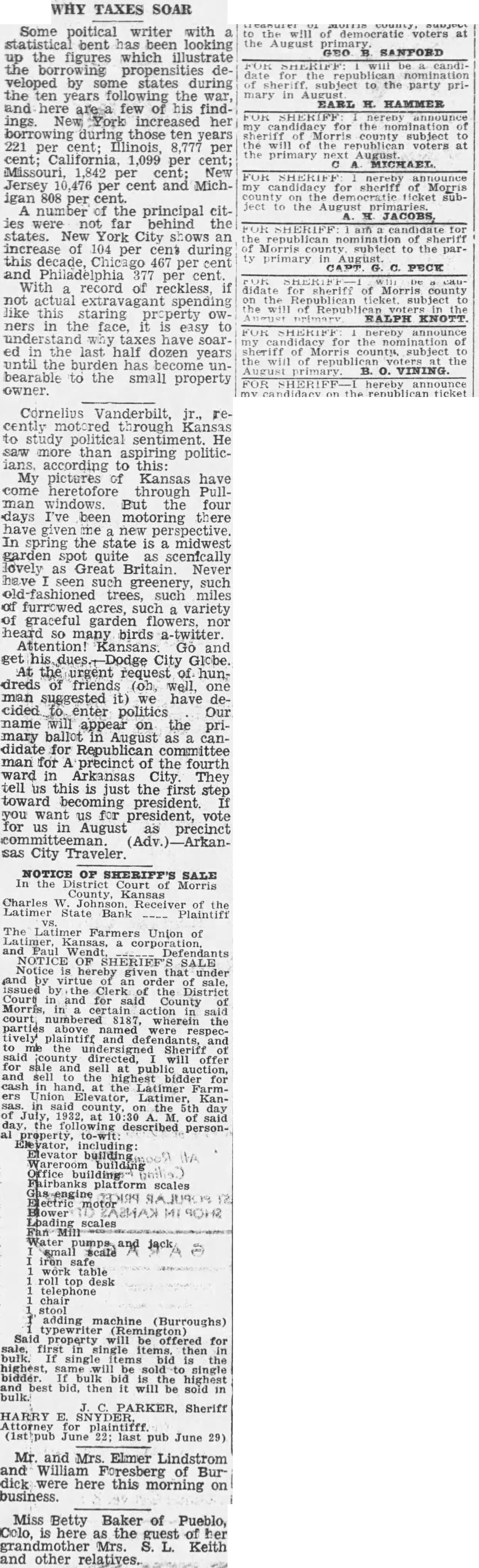 Cornelius Vanderbilt, jr., recently motored through Kansas to study political sentiment. He saw more than aspiring politicians. according to this: My pictures of Kansas have come heretofore through Pullman windows. But the four days I've been motoring there have given me new perspective. In spring the state is a midwest garden spot quite as scenically lovely as Great Britain Never have seen such greenery, such old-fashioned trees, such miles of furrowed acres, such a variety of graceful garden flowers, nor heard so many birds a-twitter. Attention! Kansans. Go and get City Globe. At the urgent request of hundreds of friends (oh, well, one man suggested it) we have decided enter politics Our name will appear on the primary ballot in August as a candidate for Republican committee man for A precinct of the fourth ward in Arkansas City They tell us this is just the first step toward becoming president. If you want us for president, vote for us in August as precinct committeeman. (Adv.) Arkansas City Traveler.