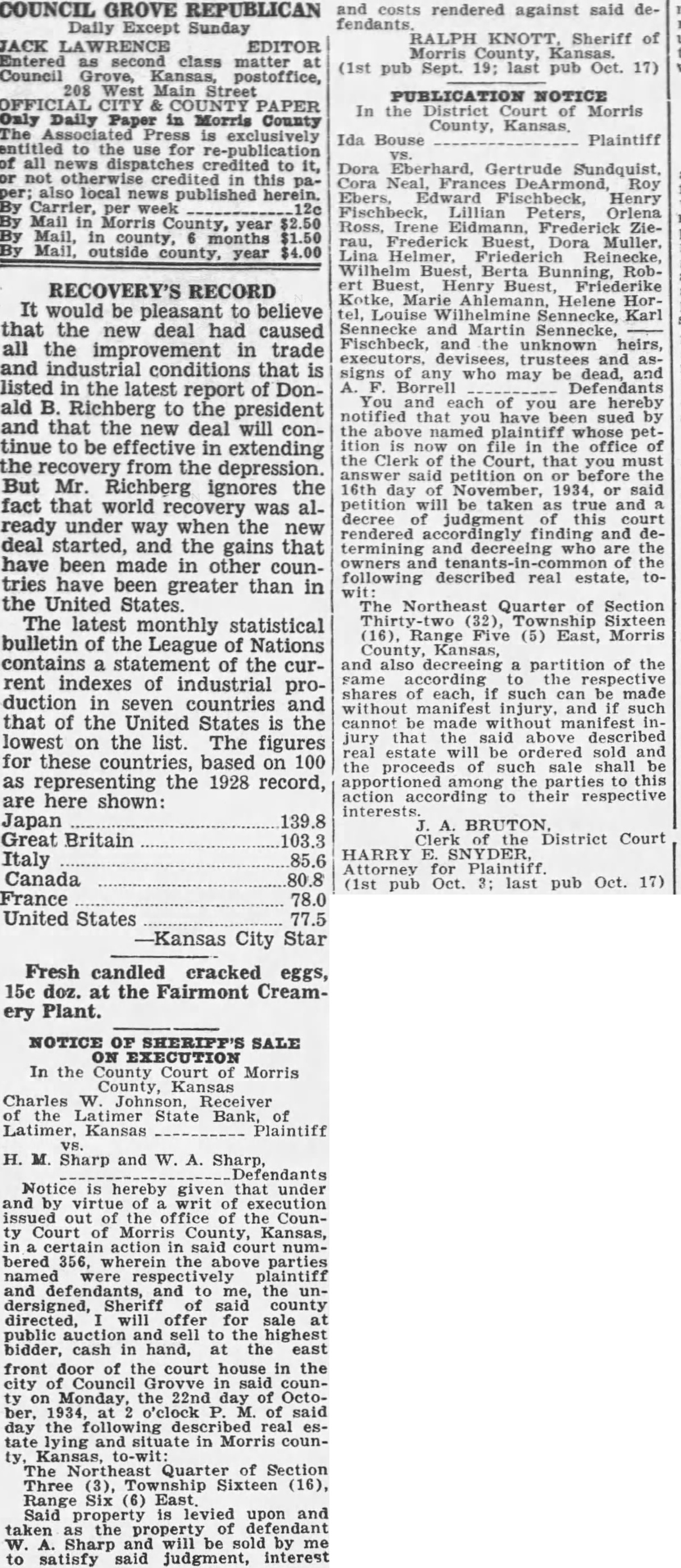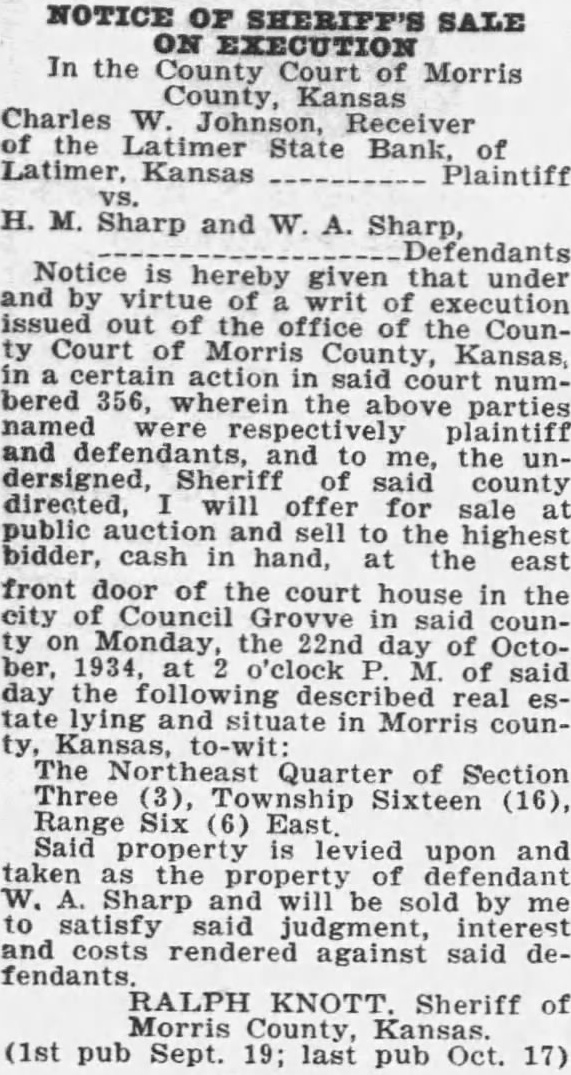 NOTICE OF SHERIFF'S SALE In the County Court Morris County, Charles W. Johnson, Receiver Latimer State Bank, Latimer. Kansas Plaintiff H. M. Sharp and W. A. Sharp, Defendants Notice is hereby given that under and by writ of execution out the office County Court of Morris County, Kansas, action in said court numbered 356, wherein the above parties named were respectively plaintiff to the undersigned, Sheriff said county directed, will offer for sale public auction and sell to the highest bidder, cash in hand, at the east front door of the court house in the Council Grovve in said counthe 22nd October, o'clock of said day the real estate lying and situate in Morris counKansas, to-wit: The Quarter of Section Three Sixteen (16), Range Six (6) East. Said property is levied upon and taken as the property of defendant Sharp be sold by me satisfy said judgment, interest and costs rendered against said defendants RALPH KNOTT, Sheriff of Morris (1st pub Sept. 19; last pub Oct. 17)