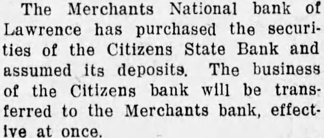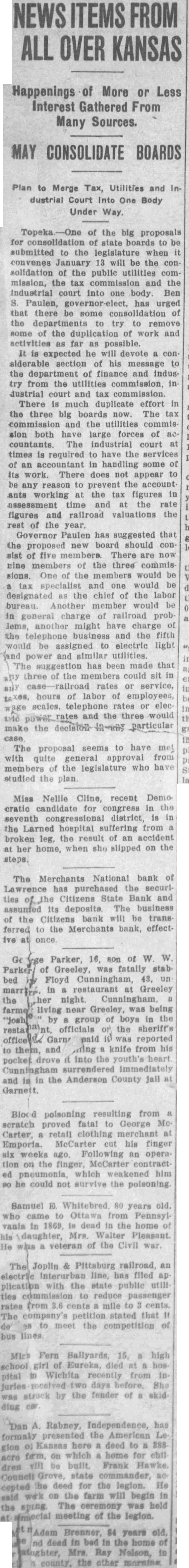 FROM KANSAS Happenings of More or Less Interest Gathered From Many Sources. MAY CONSOLIDATE BOARDS Plan to Merge Tax, Utilities and Industrial Court Into One Body Under Way. of the big proposals for consolidation of state boards to be submitted the legislature when convenes January will the consolidation the public utilities commission, the tax commission and the industrial court into one body Ben Paulen, has urged that there some consolidation of the departments try to remove some the duplication of work and far as possible. It expected he will devote con siderable section his message the department of finance and industry from the utilities commission, in dustrial court and commission. There is much duplicate effort in the three big boards now. The tax commission and utilities commission both have large forces of countants. The industrial court at times is required to have the services of an accountant in handling some Its work. There does not appear to any reason prevent the account working the figures in assessment time and the rate figures and railroad valuations the the Governor Paulen has suggested that proposed new board should con five members. There are now nine members of the three commis sions. One of the members would and one would be designated the chief of the labor bureau. Another would be general charge railroad prob lems, another might have charge the telephone business and the fifth would assigned electric light power and similar utilities. suggestion has been made that three of the could sit rates or service, hours of labor of employees, scales, rates elecand the three would particular make the The proposal seems to have with quite general from members of the legislature who have studied the plan Miss Nellie Cline, recent Democratic candidate for congress in the seventh district, in the Larned hospital from broken leg, the result of an accident when slipped on the her home, steps. The Merchants National bank of Lawrence purchased the securities Citizens State Bank and its deposite The business the Citizens bank be trans ferred the Merchants bank, effectonce. Parker, 16, son of Greeley, was fatally stab bed Floyd Cunningham, 43, un in restaurant at Greeley the night near Greeley, being group boys in the officials the sheriff's was reported and knife from drove into the heart pocket immediately and in the Anderson County jall Garnett. poisoning resulting from scratch proved fatal to George Carter, retail clothing merchant at Emporia. McCarter cut his finger six weeks ago. an operation the finger, McCarter contract which him he could not survive the poisoning Samuel Whitebred 80 years old. who came from Pennsylvania in 1869, dead in the home \daughter, Mrs. Walter Pleasant He veteran of the Civil war. Joplin Pittsburg railroad, line, has filed plication with the state public utill commission reduce passenger rates from 3.6 cents mile cents. The company's petition stated that the competition Fern Ballyards 15, high school girl Eureka, died Wichita recently from days She struck by the fender of ding Rabney, Independence, has formaly the American Kansas here deed to home Frank Council Grove, state commander, deed for the legion. cepted werk the farm will begin The ceremony was held meeting of the legion. years dead in bed the home Mrs. Ray the other