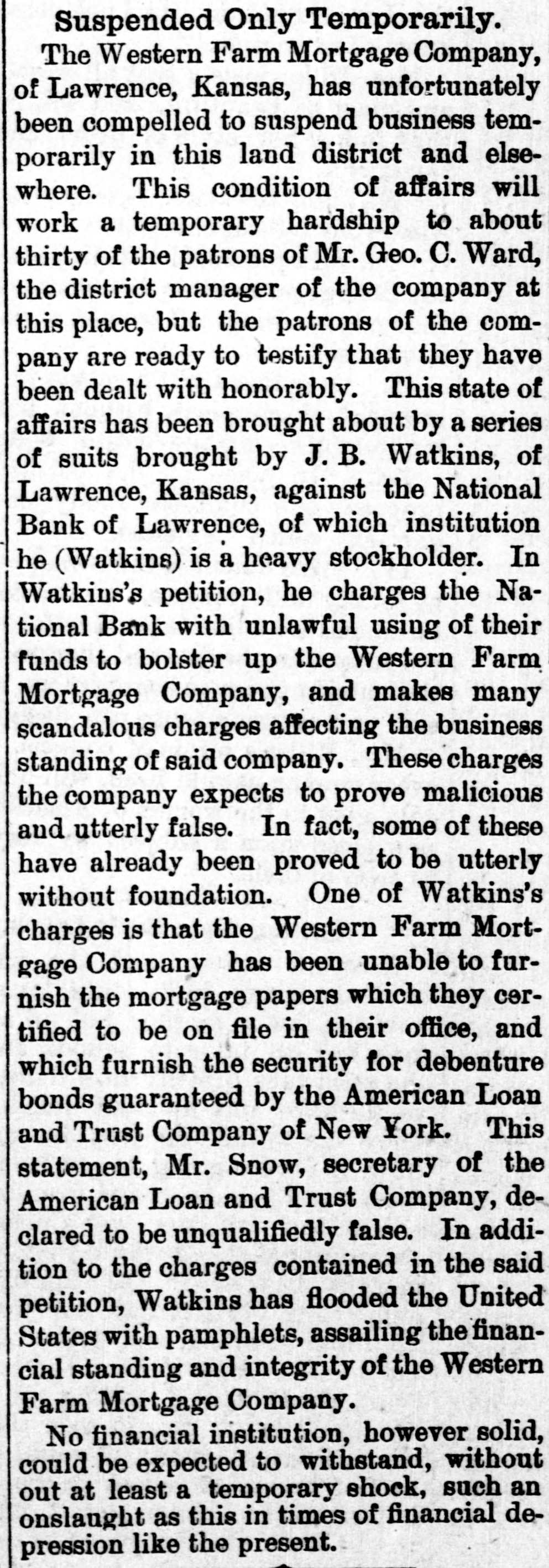 Suspended Only Temporarily. The Western Farm Mortgage Company, of Lawrence, Kansas, has unfortunately been compelled to suspend business temporarily in this land district and elsewhere. This condition of affairs will work a temporary hardship to about thirty of the patrons of Mr. Geo. C. Ward, the district manager of the company at this place, but the patrons of the company are ready to testify that they have been dealt with honorably. This state of affairs has been brought about by a series of suits brought by J. B. Watkins, of Lawrence, Kansas, against the National Bank of Lawrence, of which institution he (Watkins) is a heavy stockholder. In Watkins's petition, he charges the National Bank with unlawful using of their funds to bolster up the Western Farm Mortgage Company, and makes many scandalous charges affecting the business standing of said company. These charges the company expects to prove malicious and utterly false. In fact, some of these have already been proved to be utterly without foundation. One of Watkins's charges is that the Western Farm Mortgage Company has been unable to furnish the mortgage papers which they certified to be on file in their office, and which furnish the security for debenture bonds guaranteed by the American Loan and Trust Company of New York. This statement, Mr. Snow, secretary of the American Loan and Trust Company, declared to be unqualifiedly false. In addition to the charges contained in the said petition, Watkins has flooded the United States with pamphlets, assailing the financial standing and integrity of the Western Farm Mortgage Company. No financial institution, however solid, could be expected to withstand, without out at least a temporary shock, such an onslaught as this in times of financial depression like the present.