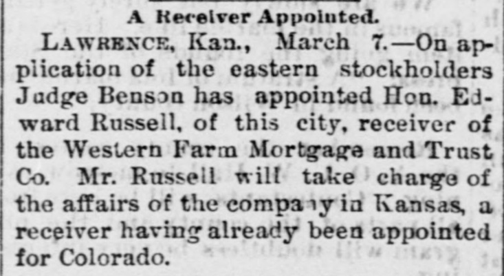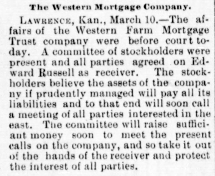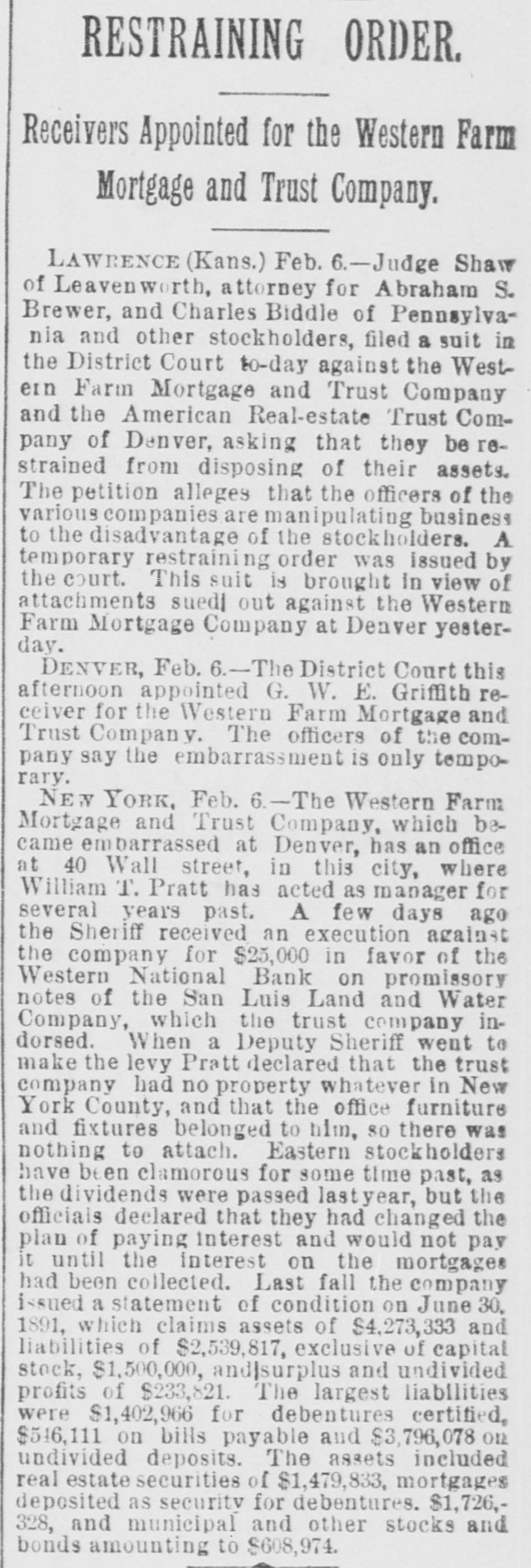 RESTRAINING ORDER. Receivers Appointed for the Western Farm Mortgage and Trust Company. LAWRENCE (Kans.) Feb. 6.-Judge Shaw of Leavenworth, attorney for Abraham S. Brewer, and Charles Biddle of Pennsylvania and other stockholders, filed a suit in the District Court to-day against the Westein Farm Mortgage and Trust Company and the American Real-estate Trust Company of Denver, asking that they be restrained from disposing of their assets. The petition alleges that the officers of the various companies are manipulating business to the disadvantage of the stockholders. A temporary restraining order was issued by the court. This suit is brought In view of attachments sued| out against the Western Farm Mortgage Company at Denver yesterday. DENVER, Feb. -The District Court this afternoon appointed G. W. E. Griffith receiver for the Western Farm Mortgage and Trust Company. The officers of the company say the embarrassment is only temporary. NEW YORK, Feb. 6. - -The Western Farm Mortgage and Trust Company, which became embarrassed at Denver, has an office at 40 Wall street, in this city, where William T. Pratt has acted as manager for several years past. A few days ago the Sheriff received an execution against the company for $25,000 in favor of the Western National Bank on promissory notes of the San Luis Land and Water Company, which the trust company indorsed. When a Deputy Sheriff went to make the levy Pratt declared that the trust company had no property whatever in New York County, and that the office furniture and fixtures belonged to him, 80 there was nothing to attach. Eastern stockholders have been clamorous for some time past, as the dividends were passed lastyear, but the officials declared that they had changed the plan of paying interest and would not pay it until the interest on the mortgages had been collected. Last fall the company issued a statement of condition on June 30, 1891, which claims assets of $4,273,333 and liabilities of $2,539,817, exclusive of capital stock, $1,500,000, and/surplus and undivided profits of $233,821. The largest liabilities were $1,402,966 for debentures certified, $546,111 on bills payable and $3,796,078 on undivided deposits. The assets included real estate securities of $1,479,833, mortgages deposited as security for debentures. $1,726,328, and municipal and other stocks and bonds amounting to $608,974.