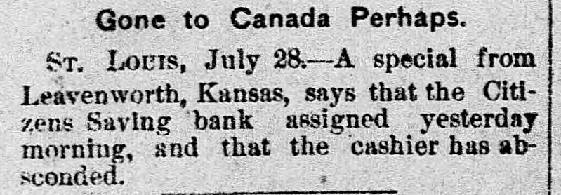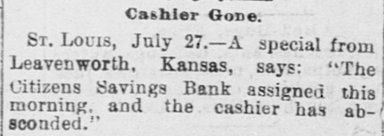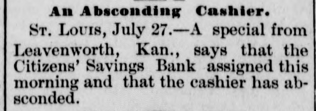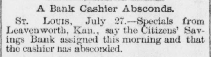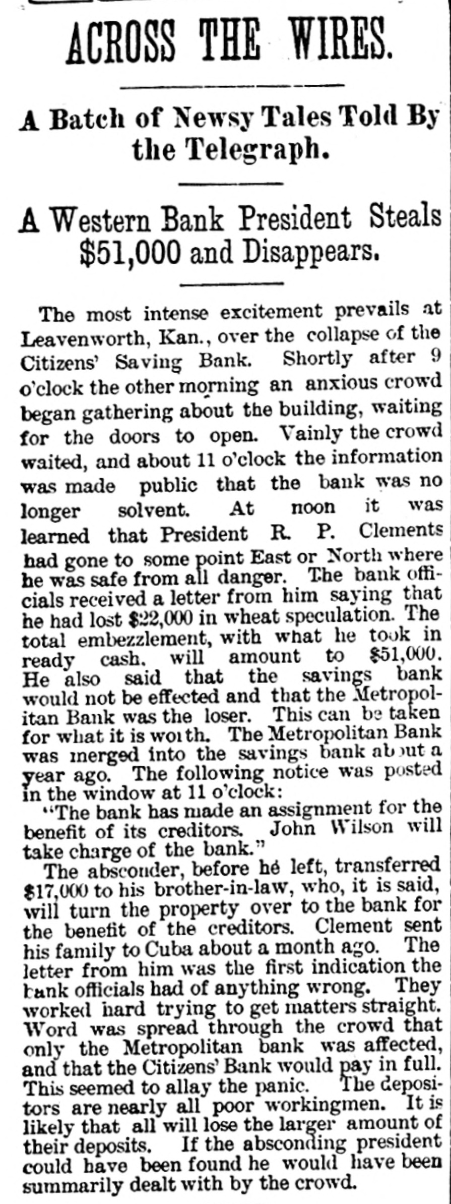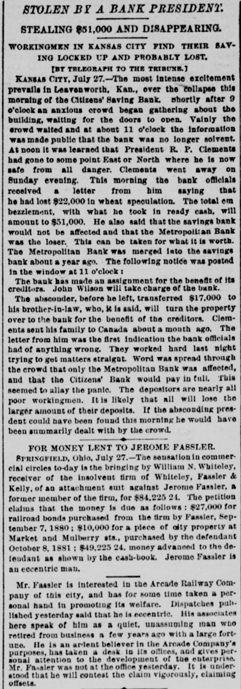 STOLEN BY A BANK PRESIDENT. STEALING $51,000 AND DISAPPEARING. WORKINGMEN IN KANSAS CITY FIND THEIR BAVING LOCKED UP AND PROBABLY LOST. [BY TELEGRAPH TO THE TRIBUNE.) KANSAS CITY, July 27.-The most intense excitement prevails in Leavenworth, Kan., over the collapse this morning of the Citizens' Saving Bank. shortly after 9 o'clock an anxious crowd began gathering about the building, waiting for the doors to open. Vainly the crowd waited and at about 11 o'clock the information was made public that the bank was no longer solvent. At noon it was learned that President R. P. Clements had gone to some point East or North where he is now safe from all danger. Clements went away on Sunday evening. This morning the bank officials received a letter from him saying that he had lost $22,000 in wheat speculation. The total em bezzlement, with what he took in ready cash. will amount to $51,000. He also said that the savings bank would not be affected and that the Metropolitan Bank was the loser. This can be taken for what it is worth. The Metropolitan Bank was merged into the savings bank about a year ago. The following notice was posted in the window at 11 o'clock: The bank has made an assignment for the benefit of its creditors. John Wilson will take charge of the bank. The absconder, before he left, transferred $17,000 to his brother-in-law, who, It is said, will turn the property over to the bank for the benefit of the creditors. Clements sent his family to Canada about a month ago. The letter from him was the first indication the bank officials had of anything wrong. They worked hard last night trying to get matters straight. Word was spread through the crowd that only the Metropolitan Bank was affected, and that the Citizens' Bank would pay in full. This seemed to allay the panic. The depositors are nearly all poor workingmen. It is likely that all will lose the larger amount of their deposits. If the absconding presdent could have been found this morning he would have been summarily dealt with by the crowd. FOR MONEY LENT TO JEROME FASSLER. SPRINGFIELD, Ohio, July 27.-The sensation in commercial circles to-day is the bringing by William N. Whiteley, receiver of the insolvent firm of Whiteley, Fassler & Kelly, of an attachment suit against Jerome Fassler, a former member of the firm, for $84,225 24. The petition claims that the money is due as follows: $27,000 for railroad bonds purchased from the firm by Fassier. September 7. 1880; $10,000 for a piece of city property at Market and Mulberry sts., purchased by the defendant October 8, 1881 : $49,225 24 money advanced to the defendant as shown by the cash-book. Jerome Fassier is an eccentric man. Mr. Fassier is interested in the Arcade Railway Company of this city, and has for some time taken a personal hand in promoting its welfare. Dispatches published yesterday said that he is eccentric. His associates here speak of him as a quiet, unassuming man who retired from business a few years ago with a large fortune. He is an ardent believer in the Arcade Company's purposes, has taken a desk in its offices, and gives personal attention to the development of the enterprise. Mr. Fassier was not at the office yesterday. It is understood that he will contest the claim vigorously, claiming offsets.