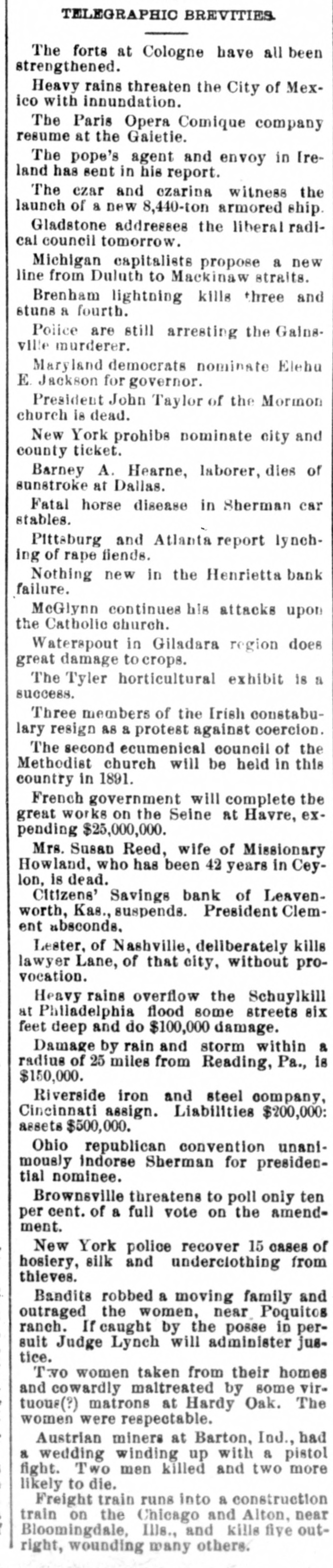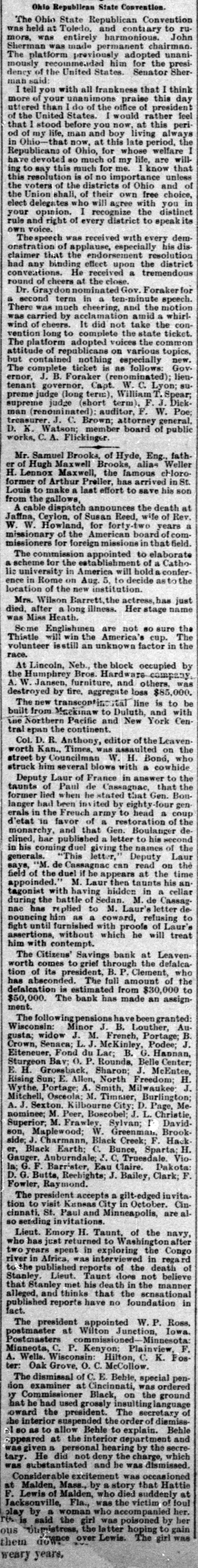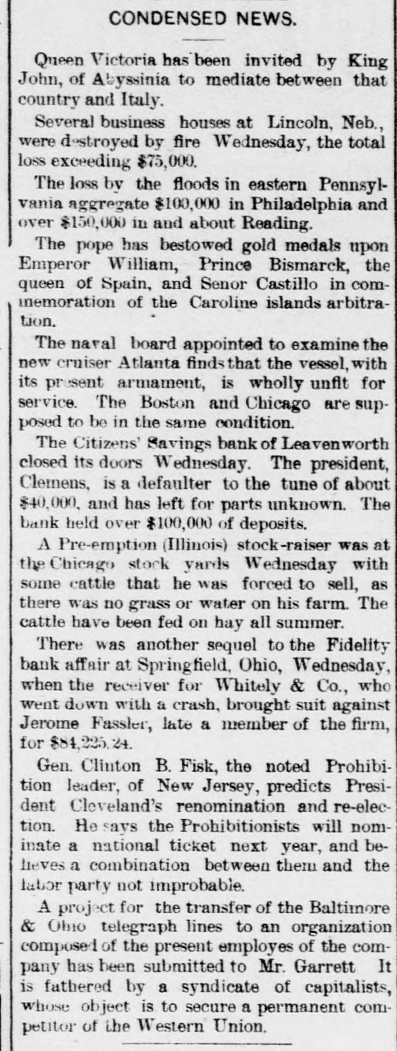 STOLEN BY A BANK PRESIDENT. STEALING $51,000 AND DISAPPEARING. WORKINGMEN IN KANSAS CITY FIND THEIR BAVING LOCKED UP AND PROBABLY LOST. [BY TELEGRAPH TO THE TRIBUNE.) KANSAS CITY, July 27.-The most intense excitement prevails in Leavenworth, Kan., over the collapse this morning of the Citizens' Saving Bank. shortly after 9 o'clock an anxious crowd began gathering about the building, waiting for the doors to open. Vainly the crowd waited and at about 11 o'clock the information was made public that the bank was no longer solvent. At noon it was learned that President R. P. Clements had gone to some point East or North where he is now safe from all danger. Clements went away on Sunday evening. This morning the bank officials received a letter from him saying that he had lost $22,000 in wheat speculation. The total em bezzlement, with what he took in ready cash. will amount to $51,000. He also said that the savings bank would not be affected and that the Metropolitan Bank was the loser. This can be taken for what it is worth. The Metropolitan Bank was merged into the savings bank about a year ago. The following notice was posted in the window at 11 o'clock: The bank has made an assignment for the benefit of its creditors. John Wilson will take charge of the bank. The absconder, before he left, transferred $17,000 to his brother-in-law, who, It is said, will turn the property over to the bank for the benefit of the creditors. Clements sent his family to Canada about a month ago. The letter from him was the first indication the bank officials had of anything wrong. They worked hard last night trying to get matters straight. Word was spread through the crowd that only the Metropolitan Bank was affected, and that the Citizens' Bank would pay in full. This seemed to allay the panic. The depositors are nearly all poor workingmen. It is likely that all will lose the larger amount of their deposits. If the absconding presdent could have been found this morning he would have been summarily dealt with by the crowd. FOR MONEY LENT TO JEROME FASSLER. SPRINGFIELD, Ohio, July 27.-The sensation in commercial circles to-day is the bringing by William N. Whiteley, receiver of the insolvent firm of Whiteley, Fassler & Kelly, of an attachment suit against Jerome Fassler, a former member of the firm, for $84,225 24. The petition claims that the money is due as follows: $27,000 for railroad bonds purchased from the firm by Fassier. September 7. 1880; $10,000 for a piece of city property at Market and Mulberry sts., purchased by the defendant October 8, 1881 : $49,225 24 money advanced to the defendant as shown by the cash-book. Jerome Fassier is an eccentric man. Mr. Fassier is interested in the Arcade Railway Company of this city, and has for some time taken a personal hand in promoting its welfare. Dispatches published yesterday said that he is eccentric. His associates here speak of him as a quiet, unassuming man who retired from business a few years ago with a large fortune. He is an ardent believer in the Arcade Company's purposes, has taken a desk in its offices, and gives personal attention to the development of the enterprise. Mr. Fassier was not at the office yesterday. It is understood that he will contest the claim vigorously, claiming offsets.