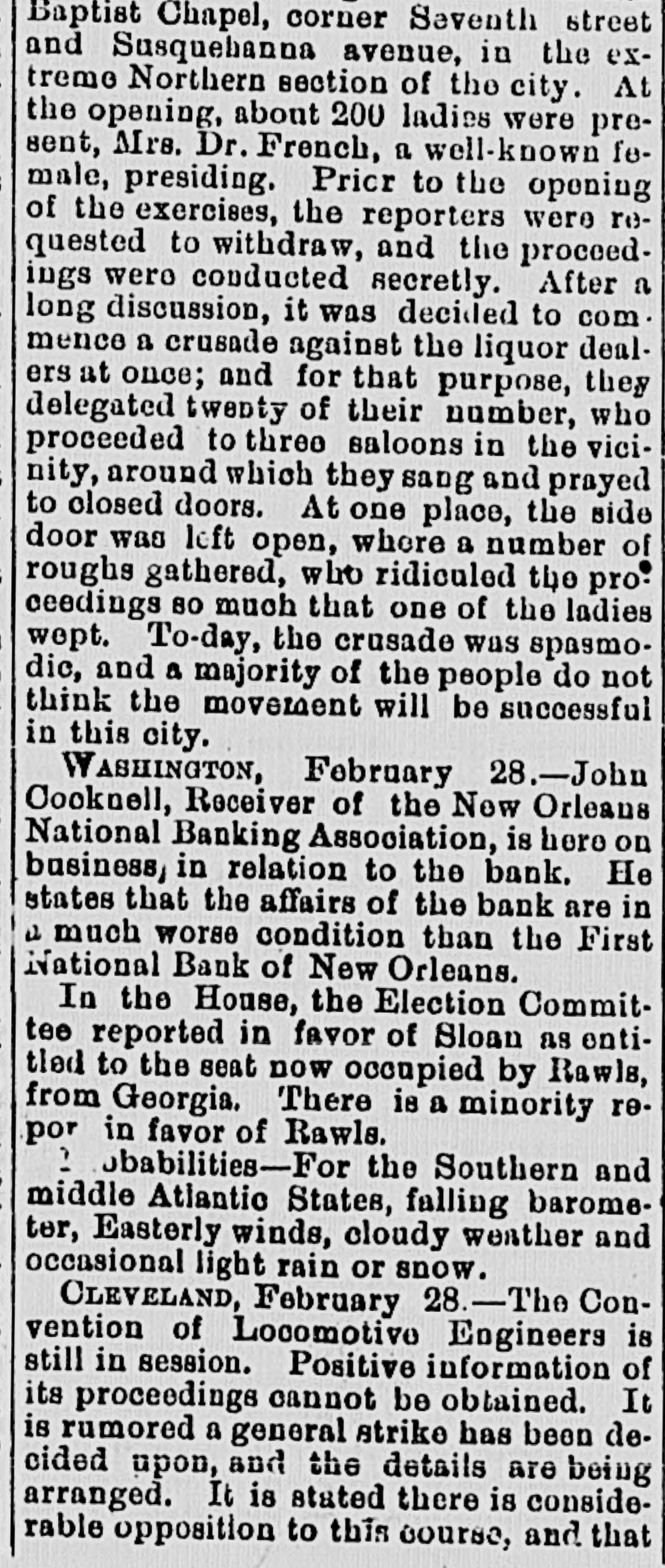 Baptist Chapel, corner Seventh street and Susquehanna avenue, in the extreme Northern section of the city. At the opening, about 200 ladies were present, Mrs. Dr. French, a well-known female, presiding. Pricr to the opening of the exercises, the reporters were requested to withdraw, and the proceedings wero conducted secretly. After a long discussion, it was decided to com. mence a crusade against the liquor dealers at once; and for that purpose, they delegated twenty of their number, who proceeded to three saloons in the vicinity, around which they sang and prayed to closed doors. At one place, the side door was left open, where a number of roughs gathered, who ridiculed the pro. ceedings 80 much that one of the ladies wept. To-day, the crusade was spasmodic, and a majority of the people do not think the movement will be successful in this city. WASHINGTON, February 28.-John Cooknell, Receiver of the Now Orleans National Banking Association, is here on business, in relation to the bank. He states that the affairs of the bank are in a much worse condition than the First National Bank of New Orleans. In the House, the Election Committee reported in favor of Sloan as entitled to the seat now occupied by Rawls, from Georgia. There is a minority repor in favor of Rawls. 2 obabilities-For the Southern and middle Atlantic States, falling barometer, Easterly winds, cloudy weather and occasional light rain or snow. CLEVELAND, February 28.-The Convention of Locomotive Engineers is still in session. Positive information of its proceedings cannot be obtained. It is rumored a general strike has been decided upon, and the details are being arranged. It is stated there is considerable opposition to this course, and that