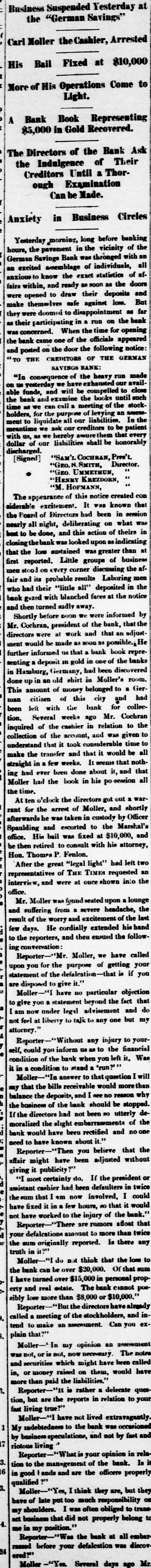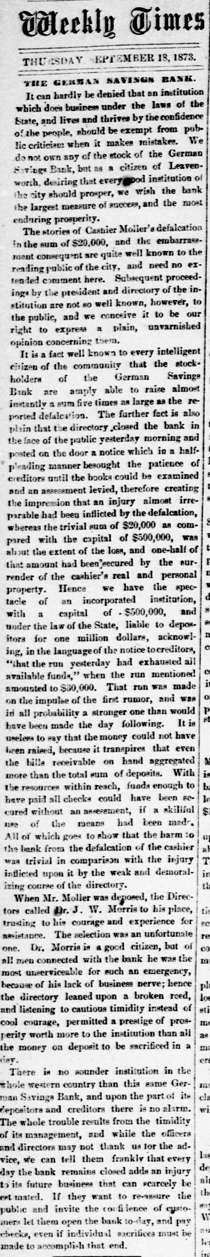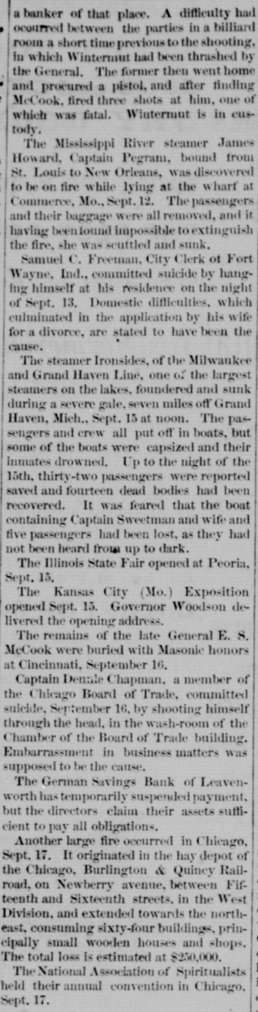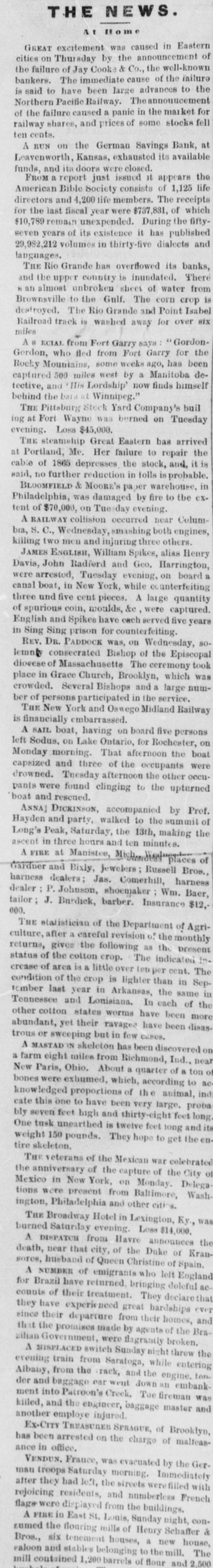 THE NEWS. AI Bomo GREAT excitement was caused in Eastern cities on Thursday by the announcement of the failure of Jay Cooke & Co., the well-known bankers. The immediate cause of the failure is said to have been large advances to the Northern Pacific Railway. The announcement of the failure caused a panic in the market for railway shares, and prices of some stocks fell ten cents. A RUN on the German Savings Bank, at Leavenworth, Kansas, exhausted its available funds, and its doors were closed. FROM a report just issued it appears the American Bible Society consists of 1,125 life directors and 4,200 life members. The receipts for the last fiscal year were $737,881, of which $10,789 remain unexpended. During the fiftyseven years of its existence it has published 29,982,212 volumes in thirty-five dialects and languages. THE Rio Grande has overflowed its banks, and the upper country is inundated. There A an almost unbroken sheet of water from Brownsville to the Gulf. The corn crop is destroyed. The Rio Grande and Point Isabel Railroad track is washed away for over six miles A ECIAL from Fort Garry says " Gordon Gordon, who fled from Fort Garry for the Rocky Mountains, some weeks ago, has been captured 500 miles west by a Manitoba detective, and 'His Lordship' now finds himself behind the bata at Winnipeg." THE Pittsburg Stock Yard Company's buil ing at Fort Wayne was borned on Tuesday evening. Loss $45,000. THE steamship Great Eastern has arrived at Portland, Me. Her failure to repair the cable of 1865 depresses the stock, and, it is said, no further reduction in tolls is probable. BLOOMFIELD & MOORE'S paper warehouse, in Philadelphia, was damaged by fire to the extent of $70,000, on Tuesday evening. A RAILWAY collision occurred near Columbia, S. C., Wednesday, smashing both engines, killing two men and injuring three others. JAMES ENGLISH, William Spikes, alias Henry Davis, John Radford and Geo. Harrington, were arrested, Tuesday evening, on board a canal boat, in New York, while counterfeiting three und five cent pieces, A large quantity of spurious coin, moulds, &e were captured. English and Spikes have each served five years in Sing Sing prison for counterfeiting. Rev. DR. PADDOCK was, on Wednesday, solemply consecrated Bishop of the Episcopal dioeese of Massachusette The ceremony took place in Grace Church, Brooklyn, which was crowded. Several Bishops and a large number of persons participated in the service. THE New York and Oswego Midland Railway is financially embarrassed. A SAIL boat, having on board five persons left Sodus, on Lake Ontario, for Rochester, on Monday morning. That afternoon the boat capsized and three of the occupants were drowned. Tuesday afternoon the other occupants were found clinging to the upturned boat and resened. ANNA] DICKINSON, accompanied by Prof. Hayden and party, walked to the summit of Long's Peak, Saturday, the 13th, making the ascent in three hours and ten minutes. A FIRE at Manistee, of Gardner and Bixly, jewelers ; Russell Bros., harness dealers Jas. Comerhill, harness dealer P. Johnson, shoemaker Wm. Baer, tailor: J. Burdick, barber. Insurance $12,000. THE statistician of the Department of Agriculture, after a careful revision of the monthly returns, gives the following as the present status of the cotton crop. The indicated increase of area is a little over ten per cent. The condition of the crop is lighter than in September last year in Arkansas, the same in Tennessee and Louisiana. In each of the other cotton states worms have been more abundant, yet their ravaged have been disas trous or sweeping but in few cases. A MASTAD IN skeleton has been discovered on a farm eight miles from Richmond, Ind., near New Paris, Ohio. About a quarter of a ton o bones were exbumed, which, according to ac knowledged proportions of the animal, ind cate this one to have been very large. proba bly seven feet high and thirty-eight feet long One tusk unearthed is twelve feet long and its weight 150 pounds. They hope to get the entire skeleton. THE veterans of the Mexican war celebrated the anniversary of the capture of the City of Mexico in New York, on Monday. Delega tions were present from Baltimore, Wash ington, Philadelphia and other citi 8. THE Broadway Hotel in Lexington, Ky., was burned Saturday evening. Loss $14,000. A DISPATCH from Havre announces the death, near that city, of the Duke of Kransores, hueband of Queen Christine of Spain. A NUMBER of emigrants who left England for Brazil have returned. bringing doleful accounts of their treatment. They declare they have experie need great hardships ever since their departure from their homes, and that the promises made by agents of the Brazilian Government, were flagrantly broken. A MISPLACED switch Sunday night threw the evening train from Saratoga, while entering Albany, from the rack, and the engine. ten der and baggage ear went down an embank ment into Patroon's Creek, Tue fireman was killed, and the engineer, baggage master and another employee injured. Ex-CITY TREASURER SPRAGUE, of Brooklyn has been arrested on the charge of malfeasance in office. VENDUN, France, was evacuated by the Germau troops Saturday morning. Immediately after they had left, the streets were filled with rejoicing residents, and numberless French flage were displayed from the buildings. A FIRE in East St. Louis, Sunday night, conzumed the flouring mills of Henry Schaffer & Bros., six tenement houses, a new house, raloon and stables belonging to the mill. The mill contained 1,200 barrels of flour and 2,500