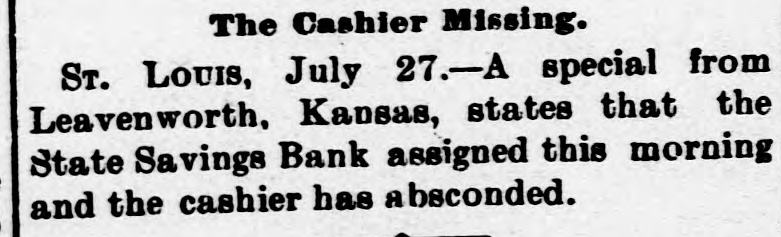 The Cashier Missing. Sr. LOUIS, July 27.-A special from Leavenworth, Kansas, states that the State Savings Bank assigned this morning and the cashier has a beconded.