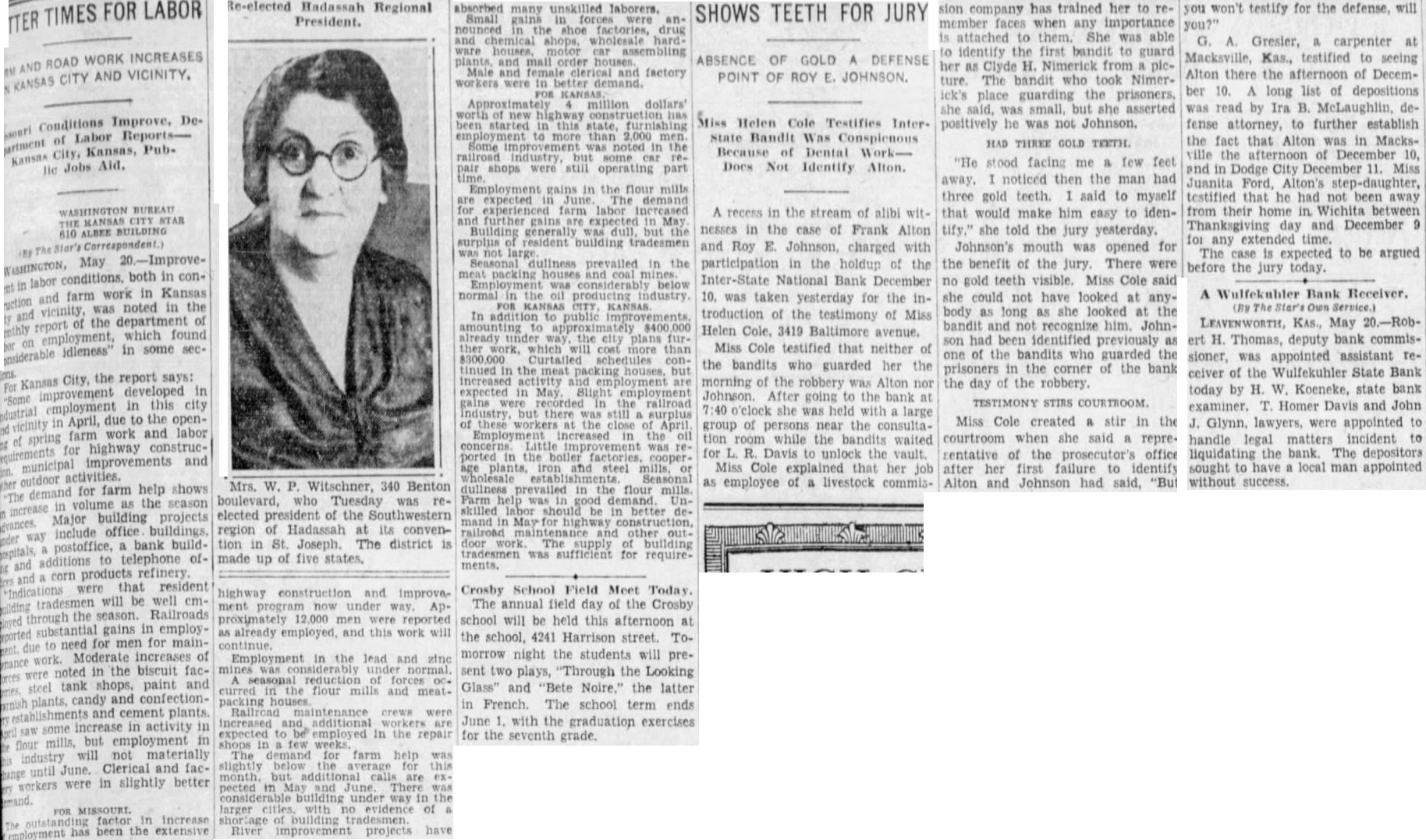 TIMES FOR LABOR WORK INCREASES ROAD AND AND VICINITY. CITY Conditions Improve, Deof Labor partment Kansas, City, Kansas Jobs Aid. WASHINGTON BUREAU KANSAS CITY ALBEE BUILDING May 20.-ImproveWASHINGTON, labor conditions, both in Kansas in confarm work and was noted in the and the department of report of which found in some considerable Kansas City, the report says: "Some improvement developed in employment in this city d vicinity in April, due to the openfarm work and construc- labor for highway euirements improvements and municipal activities. for farm help shows demand volume as the season increase Major building projects include office way postoffice, bank buildadditions to telephone ofcorn products refinery. were that resident Indications will be well tradesmen the season. Railroads gains in employneed for men for maindue to Moderate increases of noted in the biscuit factank paint and plants, candy and confectionand cement plants. some increase in activity but employment in will not materially industry June. Clerical and facwere in slightly better workers increase employment has been the extensive Re-elected Hadassah Regional President. Mrs. W. P. Witschner, 340 Benton boulevard, who Tuesday was elected president of the Southwestern region of Hadassah at its convention in St. Joseph. The district 18 made up of five states. ment now under proximately 12,000 men were reported as already employed and this work Employment in and normal seasonal reduction forces curred the flour mills and meat. houses maintenance crews increased additional expected employed in the repair few The demand for farm help below the for this but additional are pected May considerable under way with no evidence of building River improvement projects ABSENCE OF GOLD A DEFENSE POINT OF ROY E. JOHNSON. absorbed many unskilled laborers. SHOWS TEETH FOR JURY gains forces were nounced the shoe drug and chemical shops, wholesale hardcar assembling order houses. Male and clerical and factory workers were in better demand. FOR Approximately million dollars' new highway has Miss Helen Cole Testifies Interbeen started in this furnishing to more than 2,000 State Bandit Was Conspienous noted in the Because of Dental Workrailroad Industry, but some shops were still operating part Does Not Identify Alton. Employment gains in the flour mills expected in The demand experienced farm labor A recess in the stream of alibi witfurther gains are expected May Building was dull but the nesses in the case of Frank Alton surplus resident building tradesmen and Roy E. Johnson, charged with was not large Seasonal dullness prevailed in the participation in the holdup of the packing houses and coal Inter-State National Bank December was considerably below normal oil producing industry 10. was taken yesterday for the inKANSAS In addition to public troduction of the testimony of Miss to approximately $400,000 Helen Cole. 3419 Baltimore avenue. the further which cost Miss Cole testified that neither of Curtailed the bandits who guarded her the in the meat packing houses, activity employment morning of the robbery was Alton nor Johnson After going to the bank at recorded the railroad there 40 o'clock she was held with large was workers the close April group of persons near the consultaEmployment increased the tion room while the bandits waited Little was for L. R. Davis to unlock the vault. the plants, iron and steel or Miss Cole explained that her job Seasonal as employee of a livestock commisdullness the flour mills. help was skilled should be in better demand May railroad and other work The tradesmen was sufficient supply for building requirements. sion company has trained her to remember faces when any importance is attached to them. She was able to identify the first bandit to guard her as Clyde H. Nimerick from picture. The bandit who took Nimerick's place guarding the prisoners, she said, was small. but she asserted positively he was not Johnson. HAD THREE GOLD TEETH. "He stood facing me a few feet away. I noticed then the man had three gold teeth. I said to myself that would make him easy to identify." she told the jury yesterday. Johnson's mouth was opened for the benefit of the jury. There were no gold teeth visible. Miss Cole said she could not have looked at anybody as long as she looked at the bandit and not recognize him. Johnson had been identified previously as one of the bandits who guarded the prisoners in the corner of the bank the day of the robbery. TESTIMONY STIRS COURTROOM. Miss Cole created a stir in the courtroom when she said representative of the prosecutor's office after her first failure to identify Alton and Johnson had said, "But you won't testify for the defense, will you?" G. A. Gresier, a carpenter at Macksville, Kas., testified to seeing Alton there the afternoon of December 10. A long list of depositions was read by Ira B. McLaughlin, defense attorney, to further establish the fact that Alton was in Macksville the of December 10, and in Dodge City December 11. Miss Juanita Ford, Alton's step-daughter, testified that he had not been away from their home in Wichita between Thanksgiving day and December 9 for any extended time. The case is expected to be argued before the jury today. A Wulfekubler Bank Receiver. (BM The Star's Own Service.) LEAVENWORTH, KAS., May 20.-Robert H. Thomas, deputy bank commissioner, was appointed assistant receiver of the Wulfekuhler State Bank today by H. W. Koeneke, state bank examiner. T. Homer Davis and John J. Glynn. lawyers, were appointed to handle legal matters incident to liquidating the bank. The depositors sought to have local man appointed without success. Crosby School Field Meet Today The annual field day of the Crosby school will be held this afternoon at the school, 4241 Harrison street. Tomorrow night the students will present two plays, "Through the Looking Glass" and "Bete Noire." the latter in French. The school term ends June with the graduation exercises for the seve