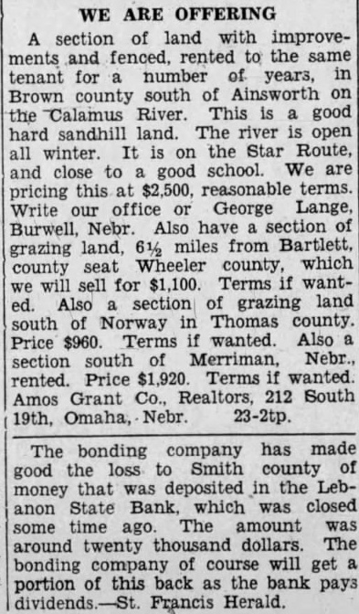 WE ARE OFFERING A section of land with improvements and fenced, rented to the same tenant for a number of years, in Brown county south of Ainsworth on the Calamus River. This is a good hard sandhill land. The river is open all winter. It is on the Star Route, and close to a good school. We are pricing this at $2,500, reasonable terms. Write office or George Lange, Burwell, Nebr. Also have section of grazing land, 61/2 miles from Bartlett. county seat Wheeler county, which we will sell for $1,100. Terms if wanted. Also section of grazing land south of Norway in Thomas county. Price $960. Terms if wanted. Also a section south of Merriman, Nebr. rented. Price $1,920. Terms if wanted Amos Grant Co., Realtors, 212 South 19th, Omaha, Nebr. 23-2tp. The bonding company has made good the loss to Smith county of money that was deposited in the Lebanon State Bank, which was closed some time ago. The amount was around twenty thousand dollars. The bonding company of course will get a portion of this back as the bank pays dividends.-St. Francis Herald.