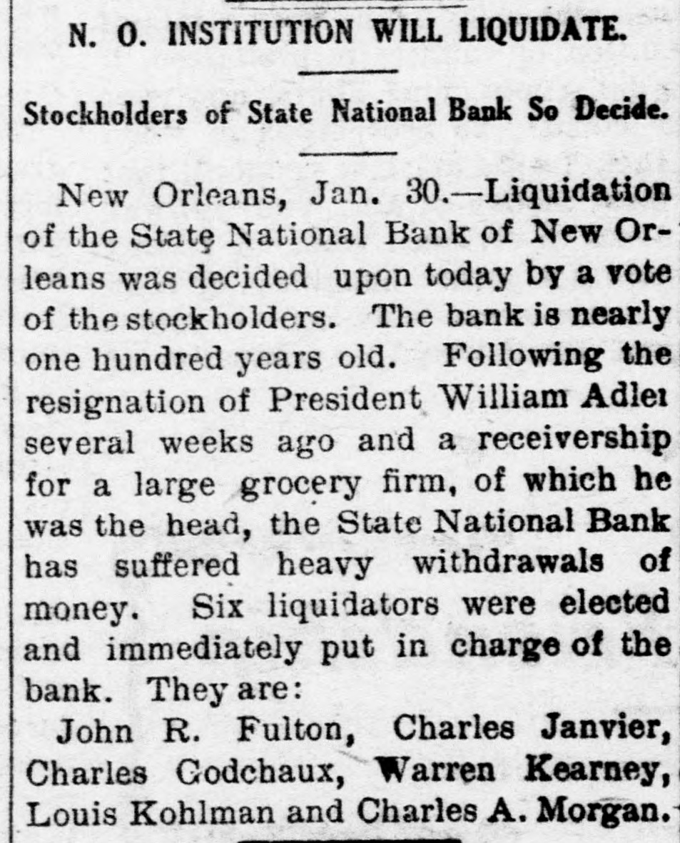 Bank Will Liquidate. Liquidation of t he State National Bank of New Orleans was decided upon by a vote of the stockholders. This bank is nearly 100 years old. Following the resignation of President William Adler several weeks ago and a receivership for a large grocery firm of which he was head, the State National Bank suffered heavy withdrawals of money.