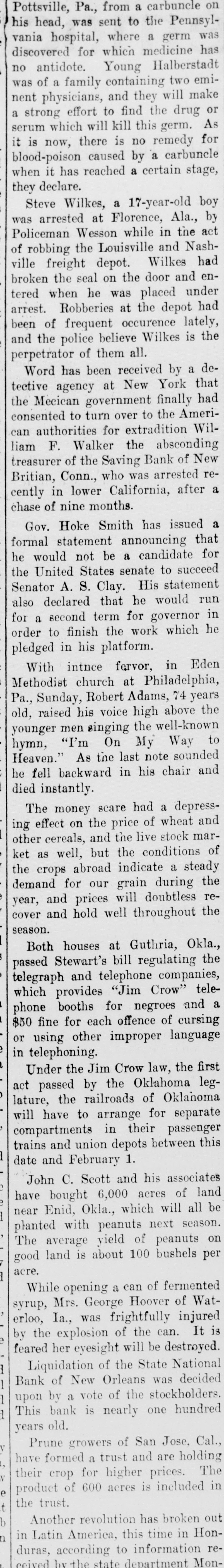 on Pottsville, Pa., from a carbuncle Pennsylhis head, was sent to the was vania hospital, where a germ has discovered for which medicine antidote. Young Halberstadt emino of a family containing two make nent was physicians, and they will or strong effort to find the drug As a which will kill this germ. for serum is now, there is no remedy it blood-poison caused by a carbuncle stage, when it has reached a certain they declare. Wilkes, a 17-year-old boy by Steve arrested at Florence, Ala., act Policeman was Wesson while in the Nashof robbing the Louisville and had ville freight depot. Wilkes enthe seal on the door and under broken when he was placed had tered arrest. Robberies at the depot of frequent occurence lately, the been and the police believe Wilkes is perpetrator of them all. Word has been received by a that detective agency at New York had Mecican government finally Amerithe to turn over to the for consented authorities extradition absconding Wilcan F. Walker the New liam treasurer of the Saving Bank of reBritian, Conn., who was arrested after a cently in lower California, chase of nine months. Gov. Hoke Smith has issued that a statement announcing not be a States senate to formal he would United candidate succeed for the Senator A. S. Clay. His statement run also declared that he would in second term for governor he order for a to finish the work which pledged in his platform. With intnce fervor, in Eden Methodist church at Philadelphia, Pa., Sunday, Robert Adams, 74 years the raised his voice high above old, men ginging the well-known to younger hymn, "I'm On My Way sounded As the last note and he Heaven." fell backward in his chair died instantly. money scare had a depress- and The effect on the price of wheat marother ing cereals, and the live stock of as well, but the conditions the ket crops abroad indicate a steady the demand for our grain during and prices will doubtless the reyear, hold well throughout houses at Guthria, Stewart's bill season. passed cover Both and regulating companies, Okla., the telegraph and telephone telewhich provides "Jim Crow" and a phone booths for negroes $50 fine for each offence of cursing or using other improper language in telephoning. Under the Jim Crow law, the first legpassed by the Oklahoma lature, act the railroads of Oklanoma will have to arrange for separate compartments in their passenger this trains and union depots between date and February 1. John C. Scott and his associates land have bought 6,000 acres of be I Enid, Okla., which will all planted near with peanuts next season. on ' The average yield of peanuts good land is about 100 bushels per a acre. While opening a can of fermented WatMrs. George Hoover of was is erloo, syrup, Ia., frightfully injured It by the explosion of the can. feared her eyesight will be destroyed. I Liquidation of the State National I of New Orleans was decided 1 Bank by a vote of the stockholders. hundred 1 This upon bank is nearly one years old. v Prune growers of San Jose, Cal., have formed a trust and are holding The v their crop for higher prices. in e product of 600 acres is included the trust. t b Another revolution has broken out n Latin America, this time in Honduras, in according to information received by the state department Mon-