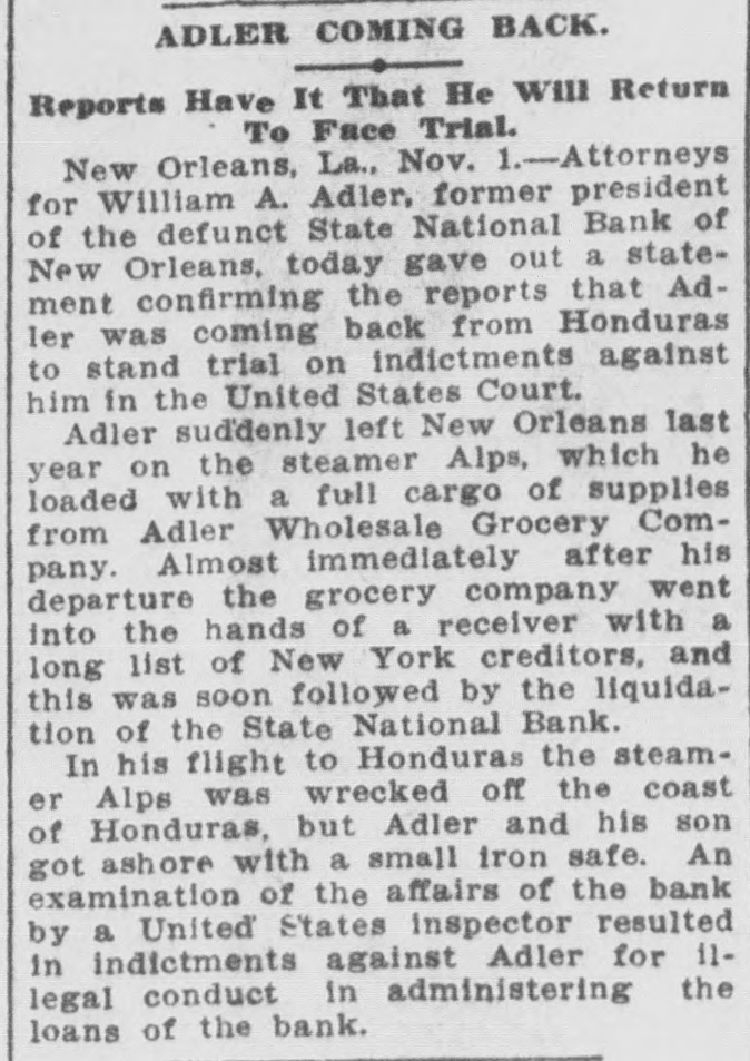 ADLER COMING BACK. Reports Have It That He Will Return To Face Trial. New Orleans, La., Nov. 1.-Attorneys for William A. Adler, former president of the defunct State National Bank of New Orleans, today gave out a statement confirming the reports that AdIer was coming back from Honduras to stand trial on indictments against him in the United States Court. Adler suddenly left New Orleans last year on the steamer Alps, which he loaded with a full cargo of supplies from Adler Wholesale Grocery Company. Almost immediately after his departure the grocery company went into the hands of a receiver with a long list of New York creditors, and this was soon followed by the liquidation of the State National Bank. In his flight to Honduras the steamer Alps was wrecked off the coast of Honduras, but Adler and his son got ashore with a small iron safe. An examination of the affairs of the bank by a United States inspector resulted in indictments against Adler for 11legal conduct in administering the loans of the bank.