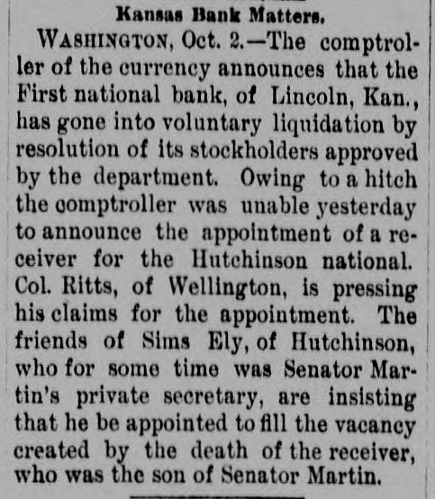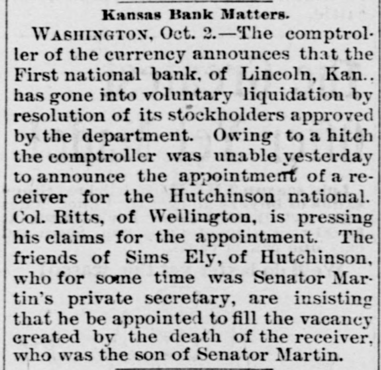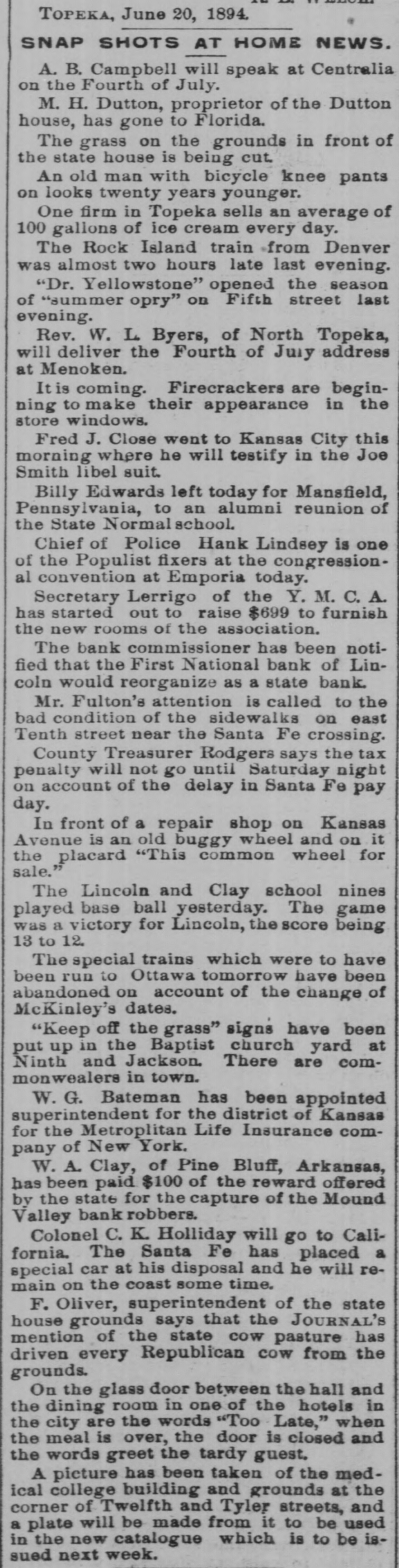 TOPEKA, June 20, 1894. SNAP SHOTS AT HOME NEWS. A. B. Campbell will speak at Centralia on the Fourth of July. M. H. Dutton, proprietor of the Dutton house, has gone to Florida. The grass on the grounds in front of the state house is being cut. An old man with bicycle knee pants on looks twenty years younger. One firm in Topeka sells an average of 100 gallons of ice cream every day. The Rock Island train from Denver was almost two hours late last evening. "Dr. Yellowstone" opened the season of "summer opry" on Fifth street last evening. Rev. W. L Byers, of North Topeka, will deliver the Fourth of July address at Menoken. It is coming. Firecrackers are beginning to make their appearance in the store windows. Fred J. Close went to Kansas City this morning where he will testify in the Joe Smith libel suit. Billy Edwards left today for Mansfield, Pennsylvania, to an alumni reunion of the State Normal school. Chief of Police Hank Lindsey is one of the Populist fixers at the congressional convention at Emporia today. Secretary Lerrigo of the Y. M. C. A. has started out to raise $699 to furnish the new rooms of the association. The bank commissioner has been notified that the First National bank of Lincoln would reorganize as a state bank. Mr. Fulton's attention is called to the bad condition of the sidewalks on east Tenth street near the Santa Fe crossing. County Treasurer Rodgers says the tax penalty will not go until Saturday night on account of the delay in Santa Fe pay day. In front of a repair shop on Kansas Avenue is an old buggy wheel and on it the placard "This common wheel for sale." The Lincoln and Clay school nines played base ball yesterday. The game was a victory for Lincoln, the score being 13 to 12. The special trains which were to have been run to Ottawa tomorrow have been abandoned on account of the change of McKinley's dates. "Keep off the grass" signs have been put up in the Baptist church yard at Ninth and Jackson. There are commonwealers in town. W. G. Bateman has been appointed superintendent for the district of Kansas for the Metroplitan Life Insurance company of New York. W. A. Clay, of Pine Bluff, Arkansas, has been paid $100 of the reward offered by the state for the capture of the Mound Valley bank robbers. Colonel C. K. Holliday will go to California. The Santa Fe has placed a special car at his disposal and he will remain on the coast some time. F. Oliver, superintendent of the state house grounds says that the JOURNAL'S mention of the state cow pasture has driven every Republican COW from the grounds. On the glass door between the hall and the dining room in one of the hotels in the city are the words "Too Late," when the meal is over, the door is closed and the words greet the tardy guest. A picture has been taken of the medical college building and grounds at the corner of Twelfth and Tyler streets, and a plate will be made from it to be used in the new catalogue which is to be issued next week.