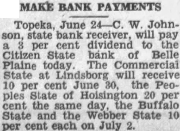 MAKE BANK PAYMENTS Topeka, June 24-C. W Johnson, state bank receiver, will pay a per cent dividend to the Citizen State bank of Belle Plaine today. The Commercial State at Lindsborg will receive 10 per cent June 30, the Peoples State of Hoisington 20 per cent the same day, the Buffalo State and the Webber State 10 per cent each on July 2.