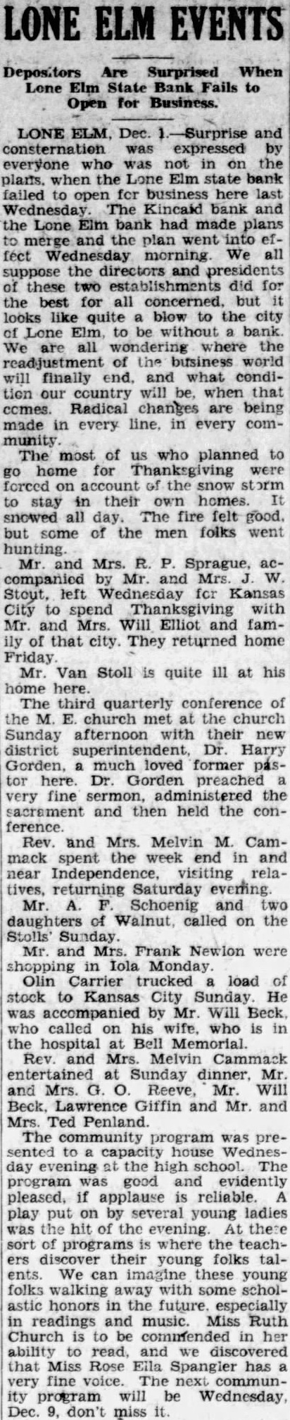 LONE ELM Are Surprised When Lone Elm State Bank to Open for Business. LONE and consternation was expressed by everyone who was not in on the when the Lone Elm state bank failed to open for business here last Wednesday The Kincaid bank and the Lone Elm bank had made plans the plan went into fect Wednesday morning We all suppose the directors and presidents these two did for the best for all but looks like quite blow to the city Lone Elm, to be without bank We all wondering where the readjustment of the business world will finally end, and what condiour country will when that comes Radical changes are being made in every in every community The most of us who planned to home for were forced on account stay their own homes. snowed all day. The fire felt good. some of the men folks went Mr. Mrs. Sprague, companied by Mr. and Mrs. Stout, left Wednesday Kansas City to spend Thanksgiving with Mr and Mrs. Will Elliot and famof that city. They returned home Friday Mr. Van Stoll is quite ill at home here. The third quarterly the church met the church Sunday afternoon with their new district superintendent, Harry Gorden, much loved former pastor here. Dr. Gorden preached fine sermon, the sacrament and then held the conference. Rev. and Mrs. Melvin M. Cammack spent the week end and near Independence, visiting returning Saturday everning. Mr. Schoenig and two daughters of Walnut, called on the Stolls' Sunday. Mr. and Mrs. Frank Newlon were shopping in Iola Monday Olin Carrier trucked load stock to Kansas City Sunday He accompanied by Mr. Will Beck called on his wife. who is the hospital Bell Memorial Rev. Mrs. Melvin Cammack entertained Sunday dinner, Mr. and Mrs. Mr. Will Beck, Lawrence Giffin and Mr. and Mrs. Ted Penland. The community program was presented capacity house Wednesevening the high school. The program good and evidently pleased, applause is reliable. play put on by several young ladies the hit the evening At there of where the teachtheir young folks talents. We these young folks walking with some scholastic honors in the future. especially in readings and music. Miss Ruth Church commended in her ability read, and that Miss Rose Ella Spangler has very fine voice. The next ity program will be Wednesday, Dec. don't miss