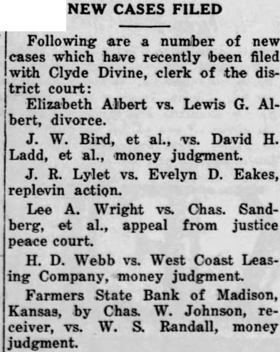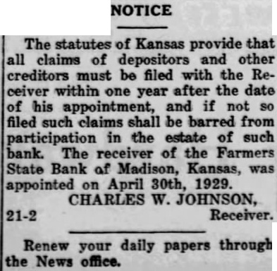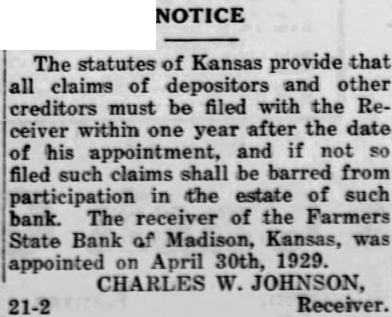 NOTICE The statutes of Kansas provide that all claims of depositors and other creditors must be filed with the Receiver within one year after the date his and if not appointment, filed such claims be barred from in the estate of such participation bank. The receiver of the Farmers State Bank of Madison, Kansas, April 30th, 1929. appointed CHARLES JOHNSON, 21-2 Receiver.