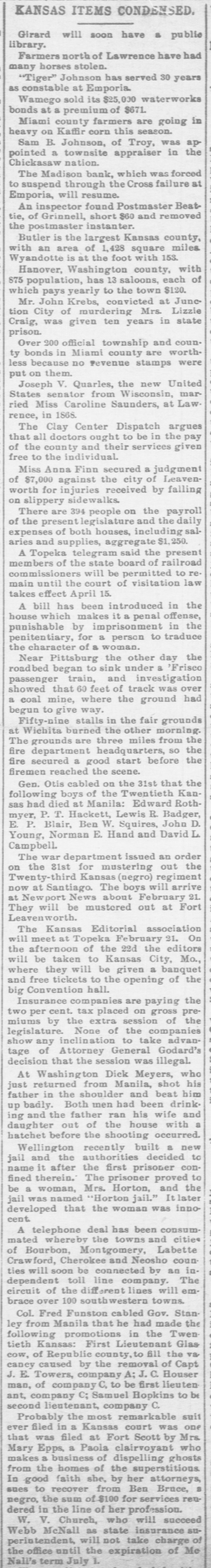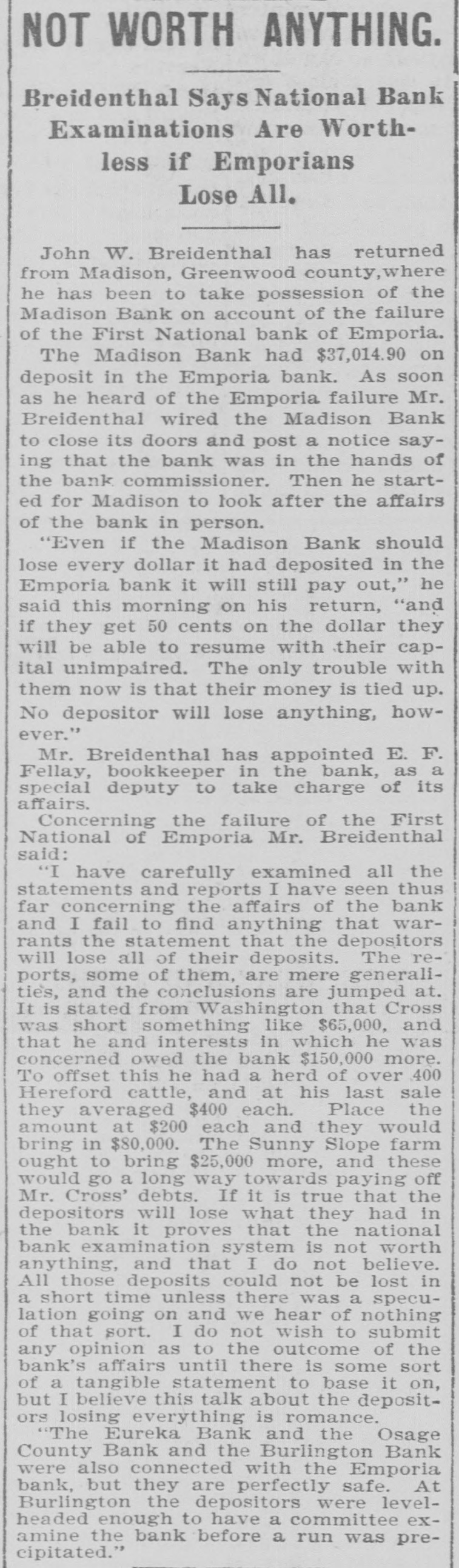 NOT WORTH ANYTHING. Breidenthal Says National Bank Examinations Are Worthless if Emporians Lose All. John W. Breidenthal has returned from Madison, Greenwood county, where he has been to take possession of the Madison Bank on account of the failure of the First National bank of Emporia. The Madison Bank had $37,014.90 on deposit in the Emporia bank. As soon as he heard of the Emporia failure Mr. Breidenthal wired the Madison Bank to close its doors and post a notice saying that the bank was in the hands of the bank commissioner. Then he started for Madison to look after the affairs of the bank in person. "Even if the Madison Bank should lose every dollar it had deposited in the Emporia bank it will still pay out," he said this morning on his return, "and if they get 50 cents on the dollar they will be able to resume with their capital unimpaired. The only trouble with them now is that their money is tied up. No depositor will lose anything, however." Mr. Breidenthal has appointed E. F. Fellay, bookkeeper in the bank, as a special deputy to take charge of its affairs. Concerning the failure of the First National of Emporia Mr. Breidenthal said: "I have carefully examined all the statements and reports I have seen thus far concerning the affairs of the bank and I fail to find anything that warrants the statement that the depositors will lose all of their deposits. The reports, some of them, are mere generalities, and the conclusions are jumped at. It is stated from Washington that Cross was short something like $65,000, and that he and interests in which he was concerned owed the bank $150,000 more. To offset this he had a herd of over 400 Hereford cattle, and at his last sale they averaged $400 each. Place the amount at $200 each and they would bring in $80,000. The Sunny Slope farm ought to bring $25,000 more, and these would go a long way towards paying off Mr. Cross' debts. If it is true that the depositors will lose what they had in the bank it proves that the national bank examination system is not worth anything, and that I do not believe. All those deposits could not be lost in a short time unless there was a speculation going on and we hear of nothing of that sort. I do not wish to submit any opinion as to the outcome of the bank's affairs until there is some sort of a tangible statement to base it on, but I believe this talk about the depositors losing everything is romance. the County "The Eureka Bank and Bank the Burlington and Osage Bank were also connected with the Emporia bank, but they are perfectly safe. At Burlington the depositors were levelheaded enough to have a committee examine the bank before a run was precipitated."