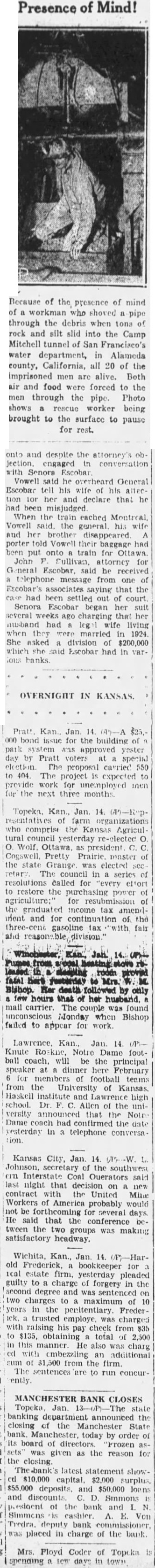 Presence of Mind! Because of the presence of mind of a workman who shoved a pipe through the debris when tons of rock and silt slid into the Camp Mitchell tunnel of San Francisco's water department, in Alameda county, California, all 20 of the imprisoned men are alive. Both air and food were forced to the men through the pipe. Photo shows a rescue worker being brought to the surface to pause for rest. onto and despite the attorney's obJection. engaged in conversation with Senora Escobar Vowell said he overheard General Escobar tell his wife of his allection for her and declare that he had been misjudged. When the train eached Montreal. Vowell said. the general his wife and her brother disappeared A porter told Vowell their baggage had been put onto train for Ottawa. John F. Fullivan. attorney for General Escobar. said he received telephone message from one of Escobar's associates saying that the case had been settled out of court Senora Escobar began her suit several weeks ago charging that her nusband had legal wife living when they were married in 1924 She asked a division of $200,000 which she said Escobar had in VRT- OVERNIGHT IN KANSAS. 000 bond issue for the building of park system was approved yester day by Pratt voters at special election. The proposal carried 550 to 404. The project is expected to provide work for unemployed men for the next three months. resentatives of farm organizations who comprise the Kansas Agricul tural council yesterday re-elected O O Wolf. Ottawa. as president C. C Cogswell, Pretty Prairie master of the state Grange was elected see retary The council in series of resolutions called for "every ef'ort to restore the purchasing power of agriculture;' for resubmission of the graduated income tax amendinent and for continuation of the three-cent gasoline tax "with fair and reasonable, division. fatal here yesterday to Mrs. W. M. Bishop. Her death followed by only a few hours that of her husband mail carrier. The couple was found unconscious Monday when Bishop failed to appear for work. Knute Roskne, Notro Dame football coach, will be the principal speaker at A dinner here February 6 for members of football teams from the University of Kansas. Haskell institute and Lawrence high school. Dr. F. C. Allen of the university announced that the Notr Dame coach had confirmed the date yesterday in a telephone conversa- Kansas City, Jan. 14. -W. L. Johnson, secretary of the southwest crn Interstate Coal Querators said last night that decision on a new contract with the United Mine Workers of America probably would not be forthcoming for several days He said that the conference between the two groups was making satisfactory headway. Wichita, Kan., Jan. 14. (/P)-Harold Frederick, a bookkeeper for a real estate firm, yesterday pleaded guilty to charge of forgery in the second degree and was sentenced on two charges to maximum of 10 years in the penitentiary. Frederick. trusted employe. was charged with raising his pay check from $35 to $135, obtaining a total of 2,500 in this manner. He also was charg ed with cmbezzling an additional sum of $1,500 from the firm. The sentences are to run concurently. MANCHESTER BANK CLOSES Topeka, Jan. 13-(/P)-The state banking department announced the closing of the Manchester State bank Manchester, today by order of its board of directors "Frozen assets' was given as the reason for the The-bank's latest statement showcd $10,000 capital, $2,000 surplus, $55,000 deposits. and $50,000 loans and discounts. C. D. Smmons president of the bank and I. N. Simmons is cashier. A. E. Von Tredra. deputy bank commissioner. was placed in charge of the bank. Mrs. Floyd Coder of Topcka is spending a ICW days in town