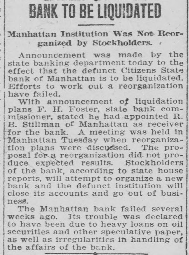 the defunct Citizens State bank of Manhattan is to be liquidated...appointed R. B. Stillman of Manhattan as receiver for the bank.
