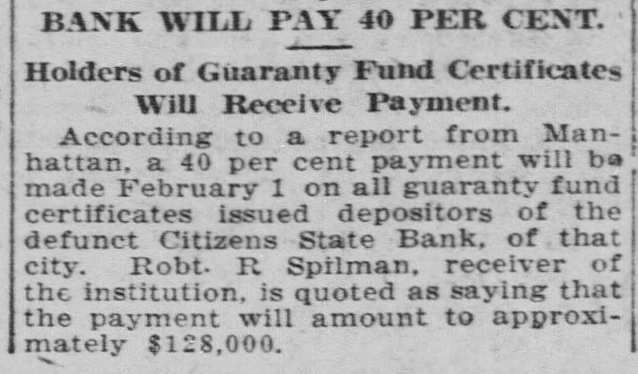 BANK WILL PAY 40 PER CENT. Holders of Guaranty Fund Certificates Will Receive Payment. According to a report from Manhattan, a 40 per cent payment will be made February 1 on all guaranty fund certificates issued depositors of the defunct Citizens State Bank, of that city. Robt. R Spilman, receiver of the institution, is quoted as saying that the payment will amount to approximately $128,000.