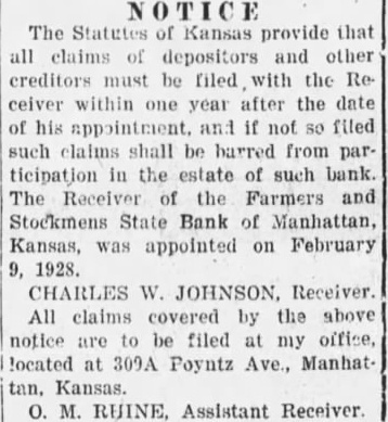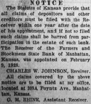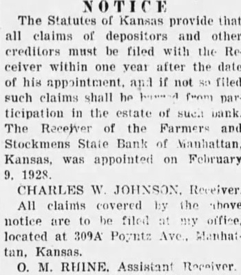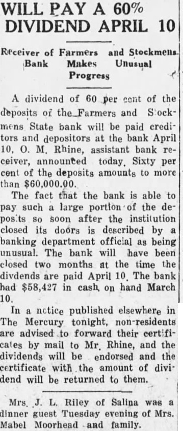 WILL PAY A 60% DIVIDEND APRIL 10 Receiver of Farmers and Stockmens Bank Makes Unusual Progress dividend of 60 cont of the deposits and State bank will be paid credit tors and depositors at the bank April Rhine, assistant bank ceiver, announced today. Sixty per cent the deposits amounts to more $60,000.00. The fact that the bank able to pay such large portion the soon after the institution closed its doors described by banking department official being unusual. The bank will have been closed two months at the time the divdends are paid April The bank had $58,427 in hand March on In notice published elsewhere in The Mercury tonight, advised forward their certifiby mail to Mr. Rhine, and the dividends will be endorsed and the certificate with the amount of dend will be returned to them. Mrs. Riley of Salina dinner guest Tuesday evening of Mrs. Mabel Moorhead and family.