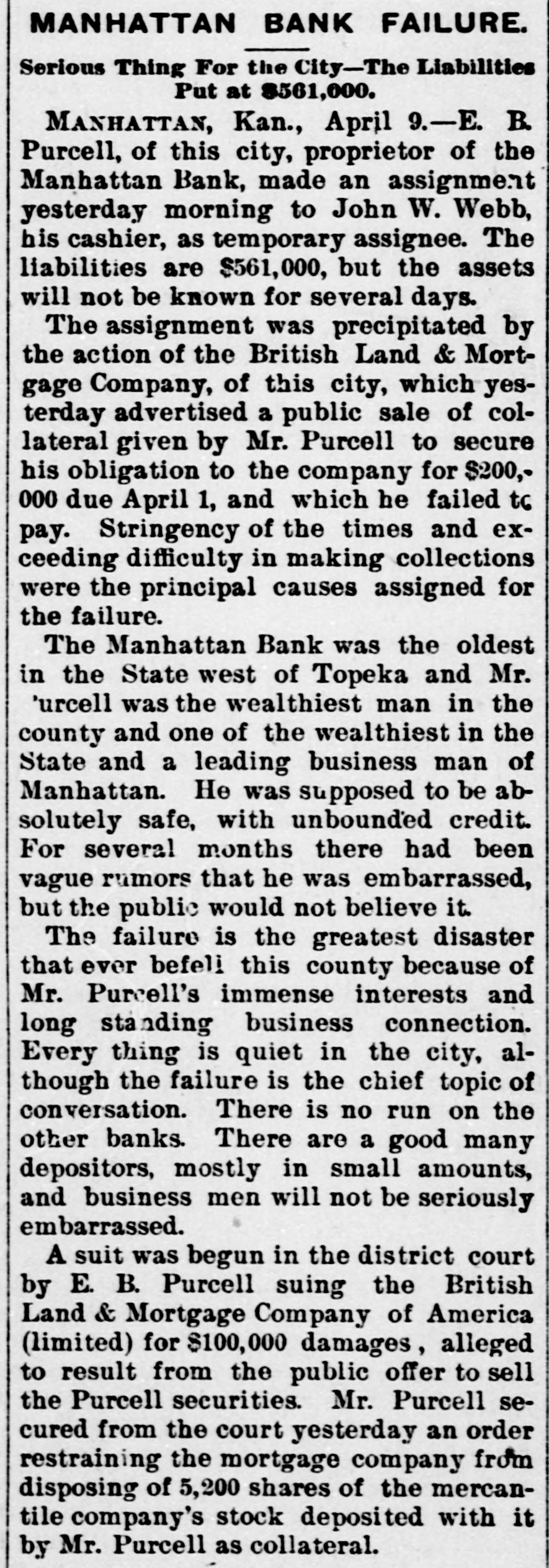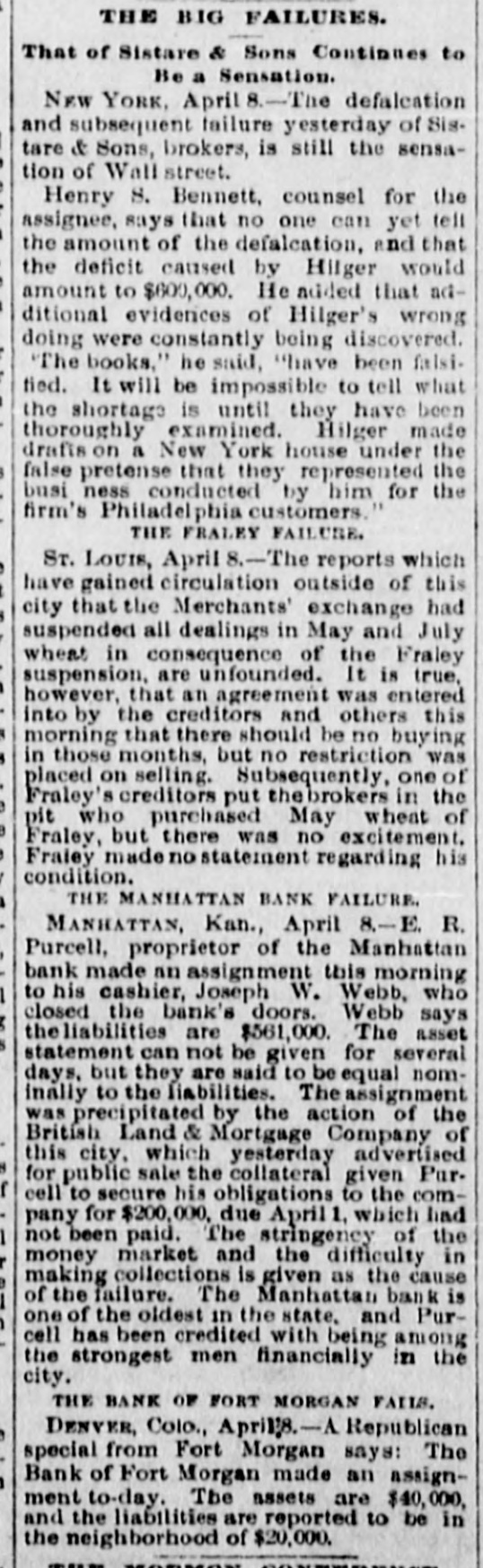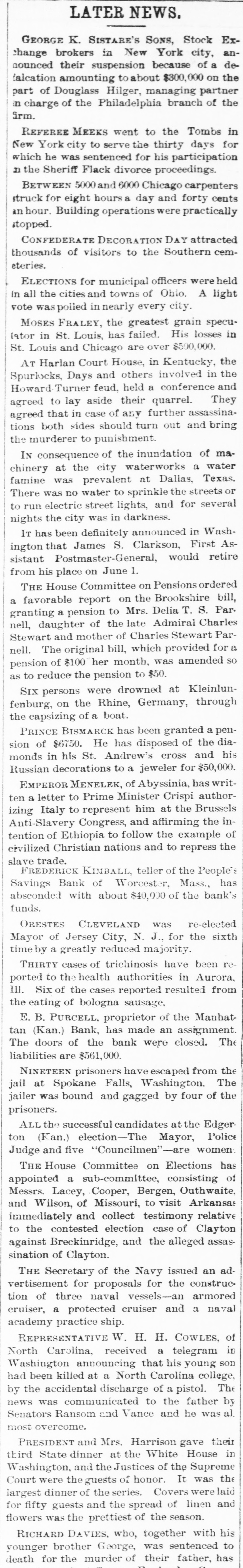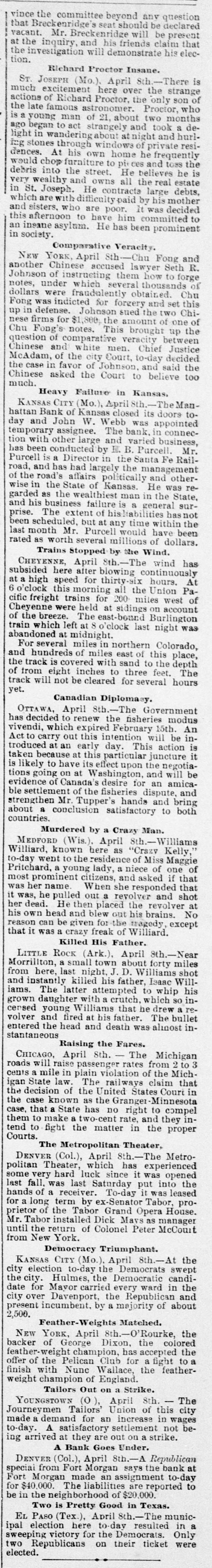 the committee beyond any question declared vince Breckenridge's seat should be present that Mr. Breckenridge will claim be that vacant. inquiry, and his friends election. the at the investigation will demonstrate his Richard Proctor Insane. ST. JOSEPH (Mo.). April 8th the There strange is excitement here over son astronomer. actions much of Richard Proctor, the Proctor, only who of the late famous man of 21. about two months a deis young to act strangely and took and hurlago light began in wandering about at night of private resistones At through his own windows home he frequently would dences. chop furniture to pit ces believes and toss he the is the street. He estate debris wealthy into and owns all the real debts. very St. Joseph. He contracts large his mother in which are with difficulty paid by decided and to have him sisters, who are poor. It committed was to in society. this an insane afternoon lum. He has been prominent Comparative Veracity. accused NEW YORK, April 8th lawyer Chu Fong Seth and R. several Johnson another Chinese of instructing them thousands how to forge 01 notes, under were which fraudulently obtained. set Chu this dollars indicted for forgery and ChiFong in was defense. Johnson sued the of two one of up nese firms for $1,800 This the amount brought up the question Chu Fong's of comparative notes. veracity Chief between Justice Chinese and white men. decided of the city Court, to-day said the McAdam, favor of Johnson. and too much. Chinese the case in asked the Court to believe Heavy Failure in Kansas. CITY (Mo.), April 8th.- doors The Man- toKANSAS Bank of Kansas closed its appointed hattan and John W. Webb was in connecday temporary assignee. The bank. varied business, with other large and Purcell. Mr. tion has been conducted Director by in H. the B. Santa Fe RailPurcell and is a has had largely the management and otherroad, road's affairs politically was reof the the State of Kansas. He the State. garded wise in as the wealthiest failure is man a general in surand his The business extent of hisliabilities within has not the prise. scheduled, but at any time have been been month Mr. Purcell would dollars. rated last as worth several millions of Trains stopped the Wind. CHEYENNE, April 8th.- The continuously wind has subsided here after for blowing thirty-six hours. Pa- At for trains at o'clock high this speed morning 200 all the miles Union west of account Cheyenne were cific freight held at sidings on Burlington breeze. The east-bound night was of train the which left at 8 o'clock last abandoned at midnight. miles in northern Colorado, place, and For several hundreds of miles with east sand of to this the depth the track is covered inches to three feet. The yet. track of from will eight not be cleared for several hours Canadian Diplomasy. April 8th. The fisheries Government modus OTTAWA, decided to renew the 15th. An has which expired February will be invivendi, Act to carry out this intention This action is troduced at an early this particular day. juncture it taken because at its effect upon the negotia- will be is likely to have on at Washington, and amications going of Canada's desire for dispute, an and evidence settlement of the fisheries and bring ble Mr. Tupper's hands to both about strengthen a conclusion satisfactory countries. Murdered by a Crazy Man. MEDFORD (Wis.). here April as "Crazy 8th.- -Williams Kelly," Williard, known the residence of Miss Maggie of most to-day went to lady, a niece of one that prominent she When Pritchard, a young citizens, and asked if that responded shot was her name. pulled out a revolver revolver and at it was, he He then placed the brains. No her dead. and blew out his except reason that it was a crazy his own can head be given freak for the of Williard. tragedy, Killed His Father. LITTLE ROCK (Ark.) April about forty miles 9th.-Near from small town shot his Morrillton, here, a last night. J. father, D. Williams Isaac Willhis and instantly The latter killed attempted to which whip so iniams. daughter with a crutch, drew arecersed grown young Williams father. that he The bullet entered stantaneous volver and the head fired and at his death was almost inRaising the Fares. CHICAGO, April 8th. rates The from Michigan 2 to 3 roads will raise passenger violation of the Michlaw. States cents a mile in plain The railways claim Court that in known to igan the decision State of the as United the Granger Minnesota compel case, the case that a State a two-cent has no rate, right and they proper inthem tend to to fight make the matter in the Courts. Metropolitan Theater, DENVER The (Col.), which April 8th.-The has experienced Metropolitan Theater, luck since it was opened some very hard last Saturday put was into leased the of hands last fall. of was a receiver. ex-Senator To-day it Tabor, prothe prietor as Mays for a long term Tabor by Grand Opera manager House. until Mr. Tabor the return installed of Dick Colonel Peter McCouit from New Democracy York. Triumphant. CITY (Mo.) April 8th.-At swept the KANSAS to-day the Democrats candicity election Hulmes, the Democratic ward in the the city. for Mayor carried the every Republican and present 2,500. date city over incumbent. Davenport, by a majority of about the Feather- Weights Matched. 'Rourke, NEW York, April Dixon, 8th.- the colored the backer weight of George champion, has accepted fight to a offer feather- of the Pelican Wallace, Club for the a featherwith Nunc England. finish weight champion of Strike. Tailors Out on a 8th The YOUNGSTOWN (0) Union April of this city made a settlement Journeymen demand Tailors for an increase in not wages beto-day. A satisfactory are out on a strike. arrived at they Under. ing A Bank Goes Republican Fort DENVER (Col.), April Morgan 8th.- says the bank to-day at Fort special Morgan from The made liabilities an assignment are reported to for $40,000. the neighborhood of $20,000. be in is Pretty Good in Texas. EL PASO day Two (Tex.), April 8th. re