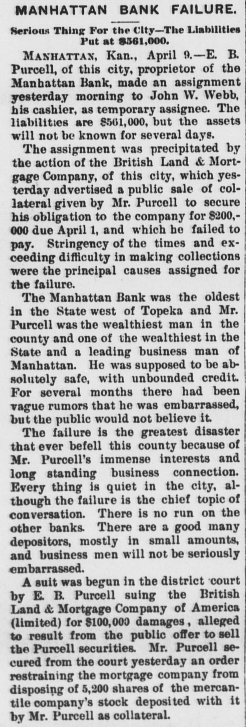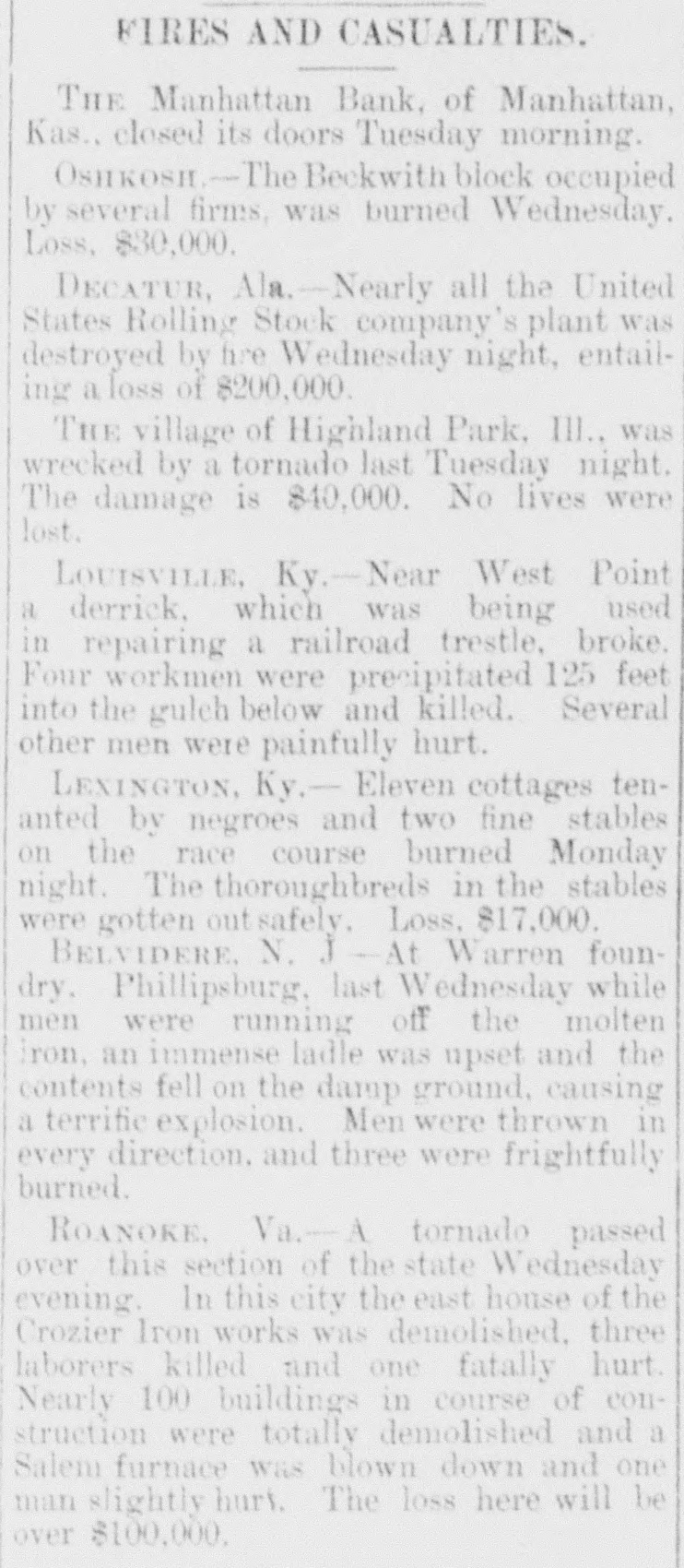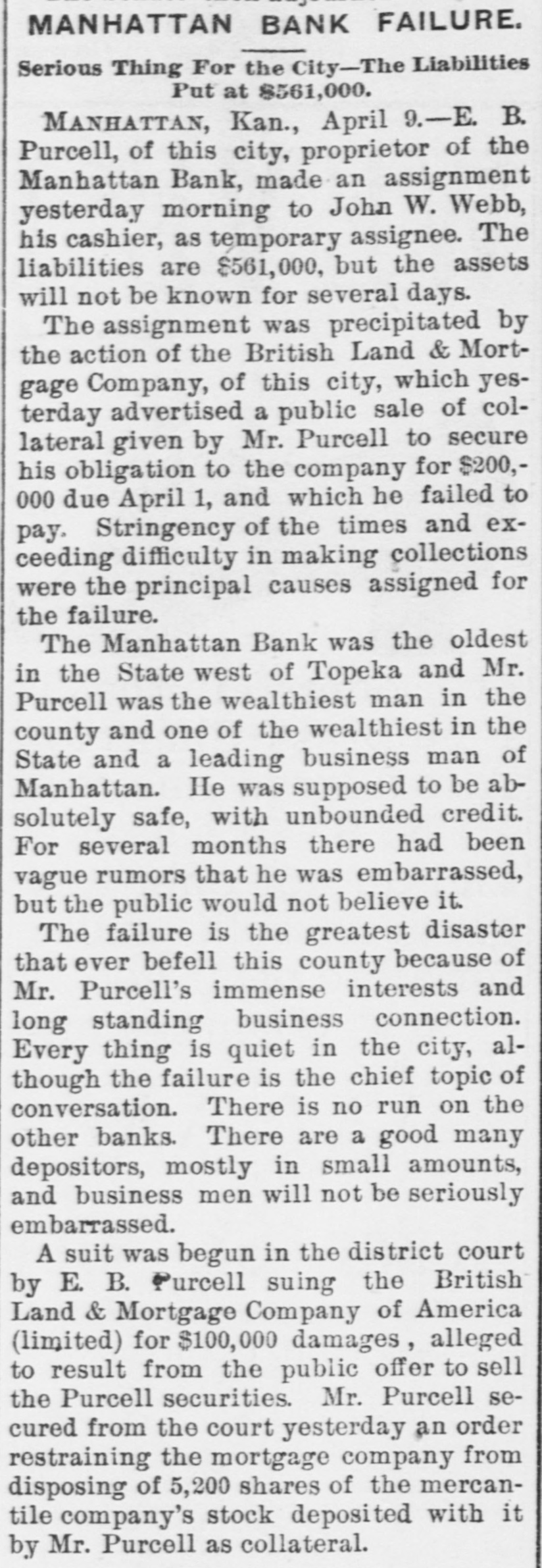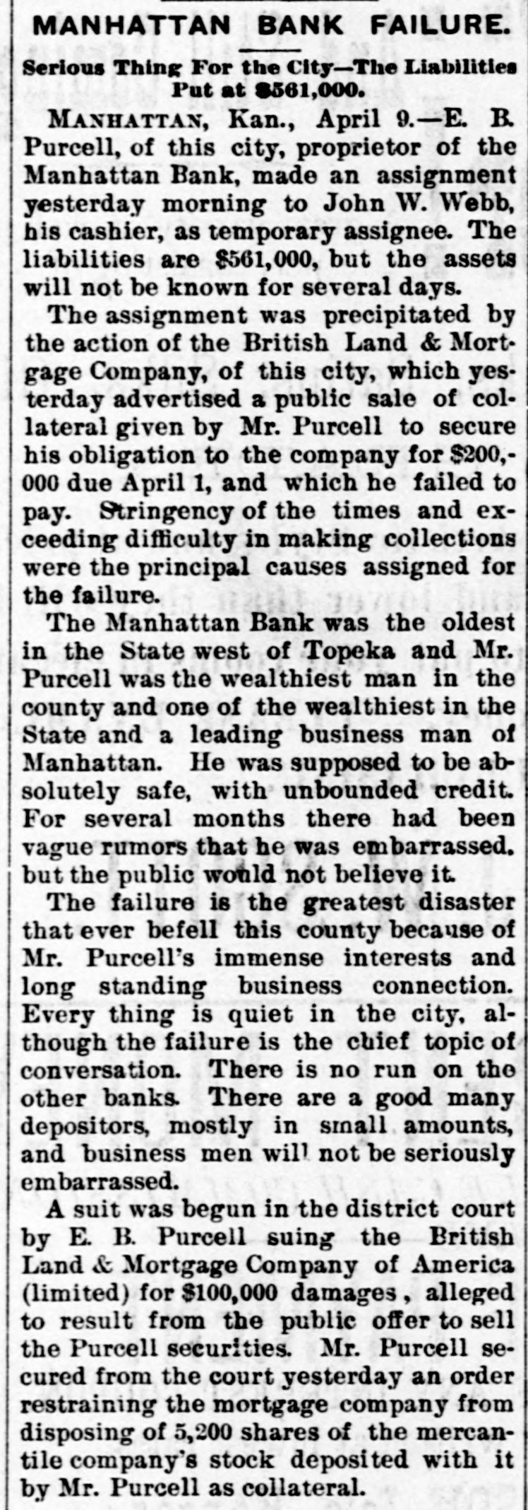 the committee beyond any question declared vince Breckenridge's seat should be present that Mr. Breckenridge will claim be that vacant. inquiry, and his friends election. the at the investigation will demonstrate his Richard Proctor Insane. ST. JOSEPH (Mo.). April 8th the There strange is excitement here over son astronomer. actions much of Richard Proctor, the Proctor, only who of the late famous man of 21. about two months a deis young to act strangely and took and hurlago light began in wandering about at night of private resistones At through his own windows home he frequently would dences. chop furniture to pit ces believes and toss he the is the street. He estate debris wealthy into and owns all the real debts. very St. Joseph. He contracts large his mother in which are with difficulty paid by decided and to have him sisters, who are poor. It committed was to in society. this an insane afternoon lum. He has been prominent Comparative Veracity. accused NEW YORK, April 8th lawyer Chu Fong Seth and R. several Johnson another Chinese of instructing them thousands how to forge 01 notes, under were which fraudulently obtained. set Chu this dollars indicted for forgery and ChiFong in was defense. Johnson sued the of two one of up nese firms for $1,800 This the amount brought up the question Chu Fong's of comparative notes. veracity Chief between Justice Chinese and white men. decided of the city Court, to-day said the McAdam, favor of Johnson. and too much. Chinese the case in asked the Court to believe Heavy Failure in Kansas. CITY (Mo.), April 8th.- doors The Man- toKANSAS Bank of Kansas closed its appointed hattan and John W. Webb was in connecday temporary assignee. The bank. varied business, with other large and Purcell. Mr. tion has been conducted Director by in H. the B. Santa Fe RailPurcell and is a has had largely the management and otherroad, road's affairs politically was reof the the State of Kansas. He the State. garded wise in as the wealthiest failure is man a general in surand his The business extent of hisliabilities within has not the prise. scheduled, but at any time have been been month Mr. Purcell would dollars. rated last as worth several millions of Trains stopped the Wind. CHEYENNE, April 8th.- The continuously wind has subsided here after for blowing thirty-six hours. Pa- At for trains at o'clock high this speed morning 200 all the miles Union west of account Cheyenne were cific freight held at sidings on Burlington breeze. The east-bound night was of train the which left at 8 o'clock last abandoned at midnight. miles in northern Colorado, place, and For several hundreds of miles with east sand of to this the depth the track is covered inches to three feet. The yet. track of from will eight not be cleared for several hours Canadian Diplomasy. April 8th. The fisheries Government modus OTTAWA, decided to renew the 15th. An has which expired February will be invivendi, Act to carry out this intention This action is troduced at an early this particular day. juncture it taken because at its effect upon the negotia- will be is likely to have on at Washington, and amications going of Canada's desire for dispute, an and evidence settlement of the fisheries and bring ble Mr. Tupper's hands to both about strengthen a conclusion satisfactory countries. Murdered by a Crazy Man. MEDFORD (Wis.). here April as "Crazy 8th.- -Williams Kelly," Williard, known the residence of Miss Maggie of most to-day went to lady, a niece of one that prominent she When Pritchard, a young citizens, and asked if that responded shot was her name. pulled out a revolver revolver and at it was, he He then placed the brains. No her dead. and blew out his except reason that it was a crazy his own can head be given freak for the of Williard. tragedy, Killed His Father. LITTLE ROCK (Ark.) April about forty miles 9th.-Near from small town shot his Morrillton, here, a last night. J. father, D. Williams Isaac Willhis and instantly The latter killed attempted to which whip so iniams. daughter with a crutch, drew arecersed grown young Williams father. that he The bullet entered stantaneous volver and the head fired and at his death was almost inRaising the Fares. CHICAGO, April 8th. rates The from Michigan 2 to 3 roads will raise passenger violation of the Michlaw. States cents a mile in plain The railways claim Court that in known to igan the decision State of the as United the Granger Minnesota compel case, the case that a State a two-cent has no rate, right and they proper inthem tend to to fight make the matter in the Courts. Metropolitan Theater, DENVER The (Col.), which April 8th.-The has experienced Metropolitan Theater, luck since it was opened some very hard last Saturday put was into leased the of hands last fall. of was a receiver. ex-Senator To-day it Tabor, prothe prietor as Mays for a long term Tabor by Grand Opera manager House. until Mr. Tabor the return installed of Dick Colonel Peter McCouit from New Democracy York. Triumphant. CITY (Mo.) April 8th.-At swept the KANSAS to-day the Democrats candicity election Hulmes, the Democratic ward in the the city. for Mayor carried the every Republican and present 2,500. date city over incumbent. Davenport, by a majority of about the Feather- Weights Matched. 'Rourke, NEW York, April Dixon, 8th.- the colored the backer weight of George champion, has accepted fight to a offer feather- of the Pelican Wallace, Club for the a featherwith Nunc England. finish weight champion of Strike. Tailors Out on a 8th The YOUNGSTOWN (0) Union April of this city made a settlement Journeymen demand Tailors for an increase in not wages beto-day. A satisfactory are out on a strike. arrived at they Under. ing A Bank Goes Republican Fort DENVER (Col.), April Morgan 8th.- says the bank to-day at Fort special Morgan from The made liabilities an assignment are reported to for $40,000. the neighborhood of $20,000. be in is Pretty Good in Texas. EL PASO day Two (Tex.), April 8th. re