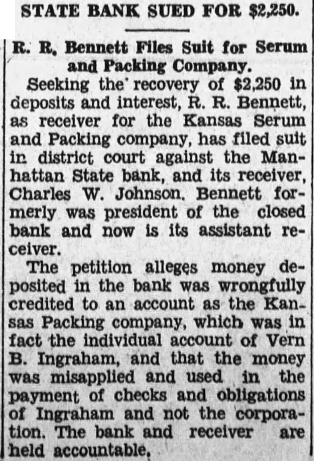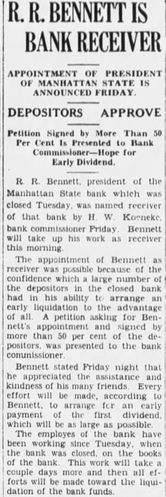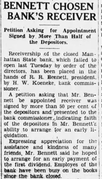 NOTICE The Statutes of Karsas provide that all claims of depositors and other creditors must be filed with the Receiver within one year after the date of his appointinent. and if not so filed such claims shall be barred from participation in the Estate of such bank The Receiver the Manhattan State Bank of Manhattan. Kansas. was appointed September 22, 1931. Charles W. Johnson, Receiver 54-2