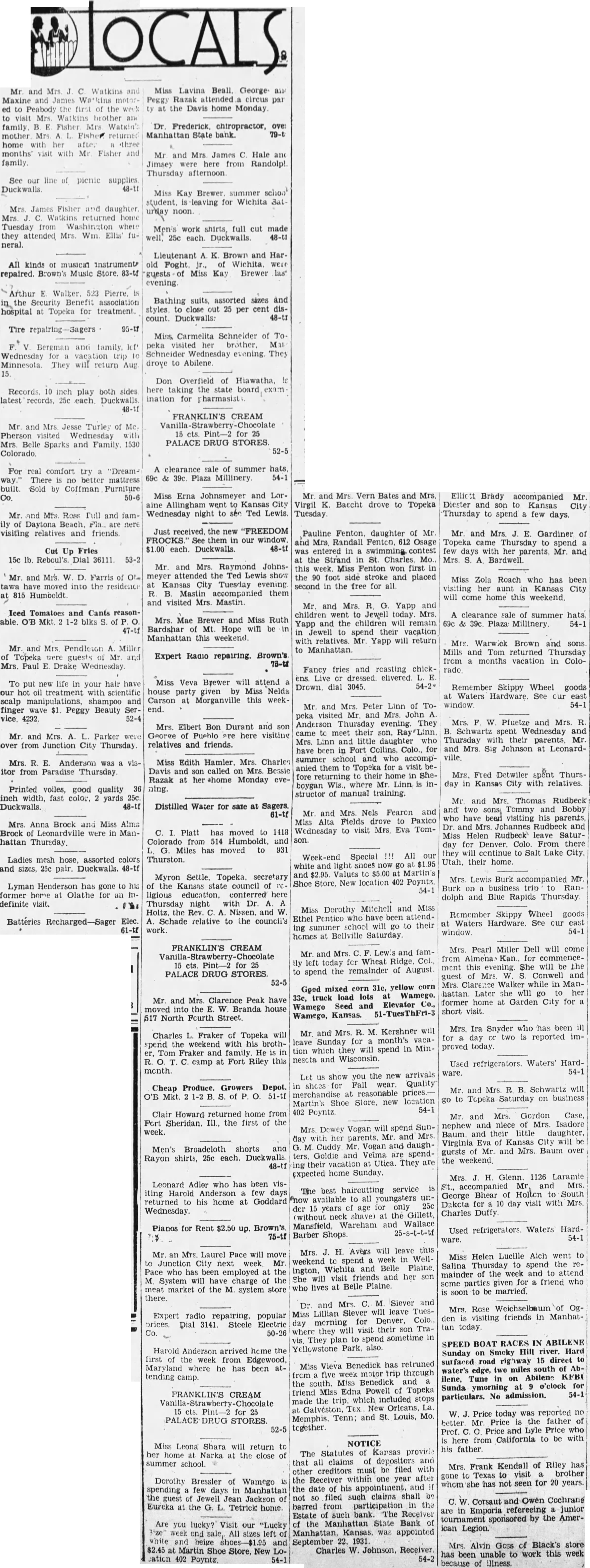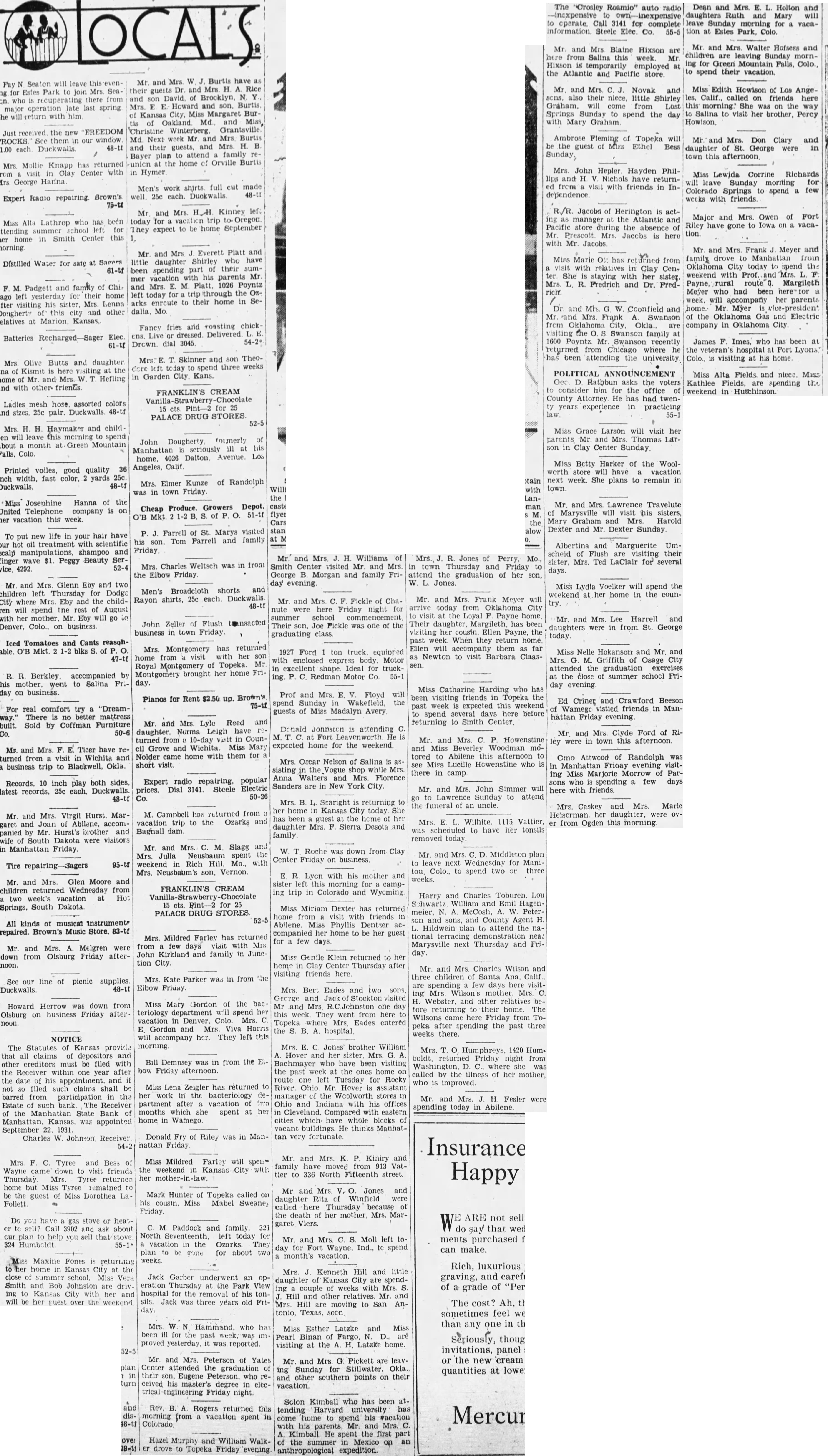 Mr. and Mrs J. Everett Platt and little daughter Shirley who have been spending part their summer vacation with his parents Mr and Mrs. E. M. Platt. 1026 Poyntz left today for trip through the Ozarks enrcute to their home in Sedalia, Mo.