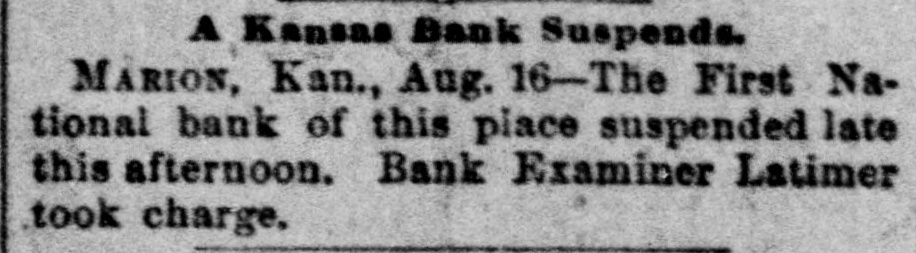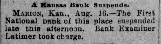 A Kansas Bank Suspends. MARION, Kan., Aug. 16-The First National bank of this place suspended late this afternoon. Bank Examiner Latimer took charge.