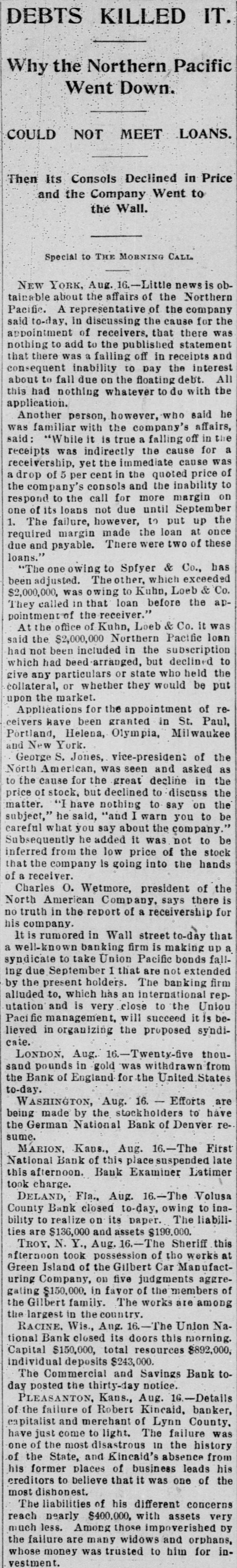 DEBTS KILLED IT. Why the Northern Pacific Went Down. COULD NOT MEET LOANS. Then Its Consols Declined in Price and the Company Went to the Wall. Special to THE MORNING CALL. NEW YORK, Aug. 16.-Little news is obtainable about the affairs of the Northern Pacific. A representative of the company said to-day, in discussing the cause for the appointment of receivers. that there was nothing to add to the published statement that there was a falling off in receipts and consequent inability to pay the interest about to fall due on the floating debt. All this had nothing whatever to do with the application. Another person, however, who said he was familiar with the company's affairs, said: "While it is true a falling off in the receipts was indirectly the cause for a receivership, yet the immediate cause was a drop of 5 per cent in the quoted price of the company's consols and the inability to respond to the call for more margin on one of its loans not due until September 1. The failure, however, to put up the required margin made the loan at once due and payable. There were two of these loans." "The one owing to Spfyer & Co., has been adjusted. Theother, which exceeded $2,000,000, was owing to Kuhn, Loeb & Co. They called in that loan before the appointmentof the receiver." At the office of Kuhn, Loeb & Co. it was said the $2,000,000 Northern Pacific loan had not been included in the subscription which had beed-arranged, but declined to give any particulars or state who held the collateral, or whether they would be put upon the market. Applications for the appointment of receivers have been granted in St. Paul, Portland, Helena, Olympia, Milwaukee and New York. George S. Jones, vice-president of the North American, was seen and asked as to the cause for the great decline in the price of stock, but declined to discuss the matter. "I have nothing to say on the subject," he said, "and I warn you to be careful what you say about the company." Subsequently he added it was not to be inferred from the low price of the stock that the company is going into the hands of a receiver. Charles O. Wetmore, president of the North American Company, says there is no truth in the report of a receivership for his company. It is rumored in Wall street to-day that a well-known banking firm is making up a syndicate to take Union Pacific bonds falling due September 1 that are not extended by the present holders. The banking firm alluded to, which has an international reputation and is very close to the Uniou Paci fic management, will succeed it is believed in organizing the proposed syndicate. LONDON, Aug. 16.-Twenty-five thousand pounds in gold was withdrawn from the Bank of England for the United States to-day. WASHINGTON, Aug. 16. Efforts are being made by the stockholders to have the German National Bank of Denver resume. MARION, Kans., Aug. 16.-The First National Bank of this placesuspended late this afternoon. Bank Examiner Latimer took charge. DELAND, Fla., Aug. 16.-The Volusa County Bank closed to-day, owing to inability to realize on its paper. The liabilities are $136,000 and assets $190,000. TROY. N. Y., Aug. 16.-The Sheriff this afternoon took posséssion of the works at