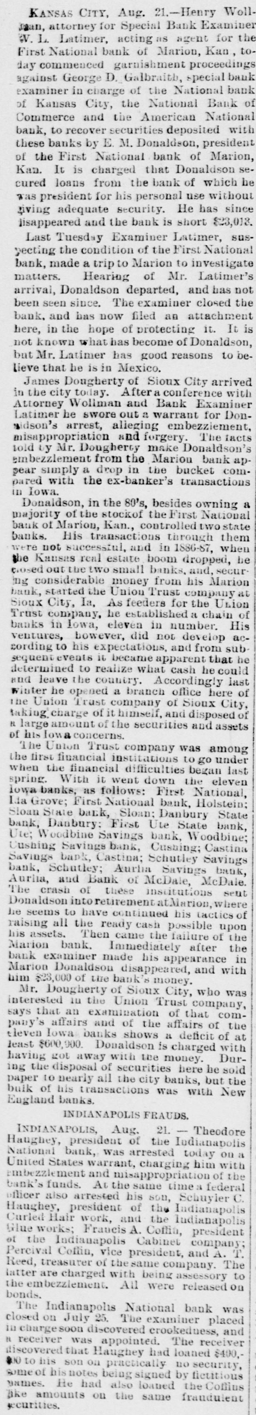 # FEATHERED HIS NEST. E. M. Donaldson Loots Many Banks in Kansas, Missouri and Iowa and Flees to Mexico with About $800,000 in Ill-Gotten Gains. KANSAS CITY, Mo., Aug. 22. From school-teacher to Napoleon of finance and thence to a defaulter is the story of E. M. Donaldson, late of this city, secretary and manager of the Union Trust company of Sioux City, Ia., president of the First national bank of Marion, Kan., and of eleven Iowa banks, who fled Tuesday, presumably to Mexico, and left behind him a record as an artistic looter of banks that is seldom surpassed All of the institutions he was connected with are in receivers hands. He is supposed to have taken with him about $800,000 of other people's money. From the Union Trust company alone he took $600,000. From the Kansas and Iowa banks $200,000 is a conservative estimate of his stealings. Forgery is one of the many charges against him, and a deputy marshal is now on his trail in Mexico armed with a warrant for his arrest for erasing his in-dorsement to a note for $5,000. Donaldson's story is unique. It begins in 1885 when he left school teaching to go into the real estate business in Marion, Kan. Associating himself with prominent men of the city he was soon coining money for them, as Kansas was then in the height of its boom. Eastern people became interested with him, notably Joseph L. Hosmer, of Suncook, N. H., who established a branch office in New Hampshire and began placing loans with New England people for them. In 1887 Donaldson organized the Union Trust & Mortgage company of Marion, Kan., with a capital of $150,000, which began business successfully. Up to this time Donaldson was honest and successful, and his marked abilities and smooth tongue carried everything before him, but the bottom began to drop out of the Kansas boom and that started his troubles. But he never lost his nerve. He got his eastern backers to help him organize banks to relieve the situation. The Union Banking company, capital $250,000, was started, and with its money the First national bank of Marion was bought, and the Union Banking company of Greensburg, Kan., Union Banking company of Jetmore, Kan., Union Banking company of Holt, Kan., were organized as branches of the First national of Marion. But this scheme failed. His business began to dwindle. So he went to Sioux City, organized the Union Trust company in the latter part of 1888 with an authorized capital of $1,000,000, paid up $600,000, with Hosmer as president and himself secretary. This company succeeded to all the assets and liabilities of the Kansas concerns. In connection with this company the following Iowa banks were organized: First national bank, Ida Grove; First national bank, Holstein; Sloan state bank, Sloan; Danbury state bank, Danbury; First Ute bank, Ute; Woodbine savings bank, Woodbine; Cushing savings bank, Cushing; Castana savings bank, Castana; Schaller savings bank, Schaller; Aurelia savings bank, Aurelia; Bank of Modale, Modale. At first this scheme was successful, but like his Kansas venture it, too, began to fail. Then he started a big ranch near Marion, Kan., and spent thousands of dollars on it. This broke the Union Trust company. About this time Donaldson began to see that ruin was inevitable. So he moved here and organized his cattle company into a branch of the Union Trust company. Then he began to plunder. Two of the Iowa banks were sold and an attempt was made to sell the others, but the financial stringency stopped him. Thereupon he laid hands on all the assets of all the banks and the trust company and disposed of them. Within the last ninety days all of the banks and the trust company have gone into receivers' hands. James Doughty, of Sioux City, was appointed receiver for the trust company and the Iowa banks about June 28. In July the First national bank of Marion was closed and Special Bank Examiner W. A. Latimer took charge last Tuesday. The same day Donaldson fled. The examiner says he is $24,000 short at that bank. INDIANAPOLIS, Ind., Aug. 22-Monday afternoon Theodore P. Haughey, president of the wrecked Indianapolis national bank, was arrested at his home near this city on a warrant sworn out by Receiver Hawkins charging him with embezzlement and misappropriation of funds and credits of the bank from January 1, 1892, until July 24, 1893. Simultaneously with the arrest of President Haughey the federal officers arrested his son, Schuyler C. Haughey, president of the Indianapolis curled hair works and the Indianapolis glue works. A little later Francis A. Coffin, president of the Indianapolis Cabinet company; Percival Coffin, vice president of the company, and A. T. Reed, treasurer of the same concern, were gathered in. Young Haughey, the Coffins and Reed were charged with having aided and abetted the elder Haughey in the embezzlements and misappropriation of credits charged against him. The arrests were made as quietly as possible and the arrested men were taken before United States Commissioner Van Buren, who released them on bonds furnished as follows: Theo-