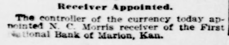 Receiver Appointed. The controller of the currency today apnointed N. C. Morris receiver of the First National 4a Bank of Marion, Kan.