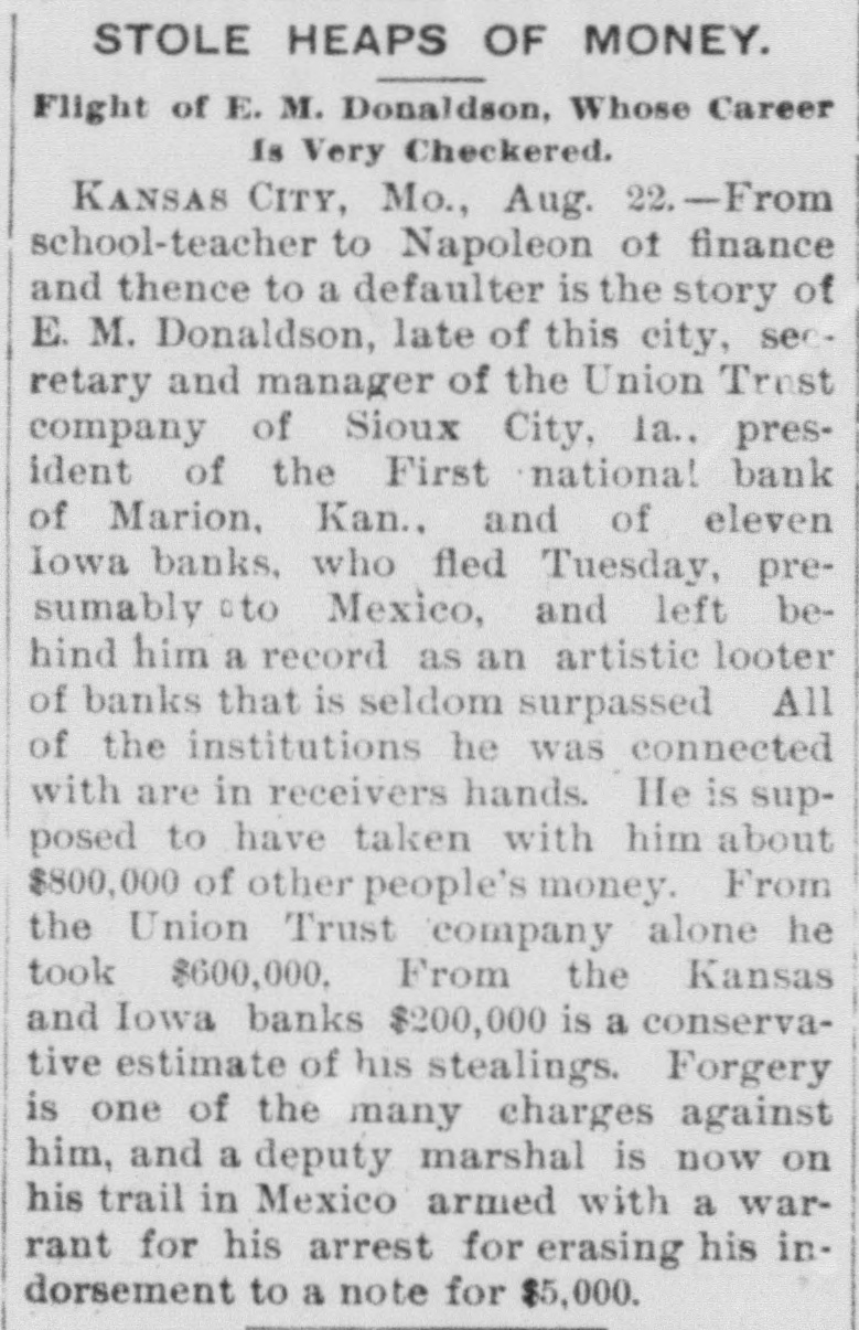 STOLE HEAPS OF MONEY. Flight of E. M. Donaldson, Whose Career Is Very Checkered. KANSAS CITY, Mo., Aug. 22.-From school-teacher to Napoleon of finance and thence to a defaulter is the story of E. M. Donaldson, late of this city, secretary and manager of the Union Trust company of Sioux City, la., president of the First national bank of Marion, Kan., and of eleven Iowa banks, who fled Tuesday, presumably sto Mexico, and left behind him a record as an artistic looter of banks that is seldom surpassed All of the institutions he was connected with are in receivers hands. He is supposed to have taken with him about $800,000 of other people's money. From the Union Trust company alone he took $600,000. From the Kansas and Iowa banks $200,000 is a conservative estimate of his stealings. Forgery is one of the many charges against him, and a deputy marshal is now on his trail in Mexico armed with a warrant for his arrest for erasing his indorsement to a note for $5,000.