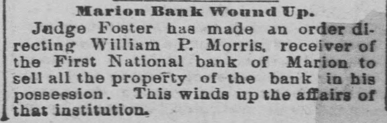 # Marion Bank Wound Up. Judge Foster has made an order directing William P. Morris, receiver of the First National bank of Marion to sell all the property of the bank in his possession. This winds up the affairs of that institution.