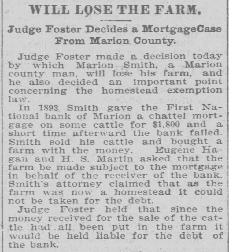 WILL LOSE THE FARM. Judge Foster Decides a MortgageCase From Marion County. Judge Foster made a decision today by which Marion Smith, a Marion county man, will lose his farm, and he also decided an important point concerning the homestead exemption law. In 1893 Smith gave the First National bank of Marion a chattel mortgage on some cattle for $1,800 and a short time afterward the bank failed. Smith sold his cattle and bought a farm with the money. Eugene Hagan and H. S. Martin asked that the farm be made subject to the mortgage in behalf of the receiver of the bank. Smith's attorney claimed that as the farm was now a homestead it could not be taken for the debt. Judge Foster held that since the money received for the sale of the cattle had all been put in the farm it would be held liable for the debt of the bank.