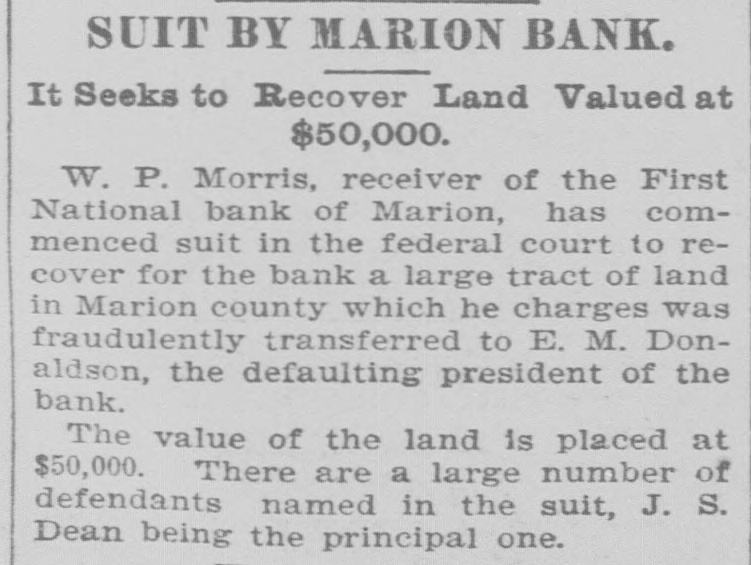 SUIT BY MARION BANK. It Seeks to Recover Land Valued at $50,000. W. P. Morris, receiver of the First National bank of Marion, has commenced suit in the federal court to recover for the bank a large tract of land in Marion county which he charges was fraudulently transferred to E. M. Donaldson, the defaulting president of the bank. The value of the land is placed at $50,000. There are a large number of defendants named in the suit, J. S. Dean being the principal one.