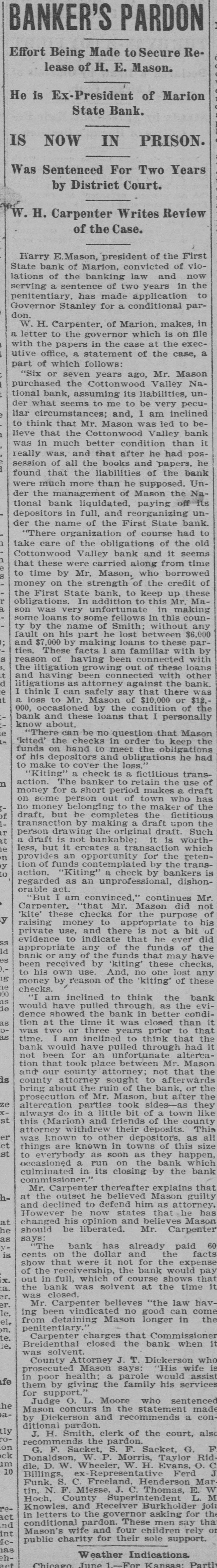 BANKER'S PARDON Effort Being Made to Secure Release of H. E. Mason. He is Ex-President of Marion State Bank. IS NOW IN PRISON. Was Sentenced For Two Years by District Court. the W. H. Carpenter Writes Review of the Case. Harry E Mason, president of the First State bank of Marion, convicted of violations of the banking law and now serving a sentence of two years in the penitentiary, has made application to Governor Stanley for a conditional pardon. W. H. Carpenter, of Marion, makes, in a letter to the governor which is on file with the papers in the case at the executive office, a statement of the case, a part of which follows: 'Six or seven years ago, Mr. Mason purchased the Cottonwood Valley National bank, assuming its liabilities, under what seems to me to be very peculiar circumstances; and, I am inclined to think that Mr. Mason was led to believe that the Cottonwood Valley bank was in much better condition than it really was, and that after he had possession of all the books and papers, he found that the liabilities of the bank were much more than he supposed. Under the management of Mason the National bank liquidated, paying off its depositors in full, and reorganizing under the name of the First State bank "There organization of course had to take care of the obligations of the old Cottonwood Valley bank and it seems that these were carried along from time to time by Mr. Mason, who borrowed money on the strength of the credit of the First State bank. to keep up these obligations. In addition to this Mr. Mason was very unfortunate in making some loans to some fellows in this county by the name of Smith without any fault on his part he lost between $6,000 and $7,000 by making loans to these parties. These facts I am familiar with by reason of having been connected with the litigation growing out of these loans and having been connected with other litigations as attorney against the bank I think can safely say that there was a loss to Mr. Mason of $10,000 or $12.000. occasioned by the condition of the bank and these loans that I personally know about. "There can be no question that Mason e 'kited' the checks in order to keep the funds on hand to meet the obligations of his depositors and obligations he had to make to cover the loss. "Kiting" a check is a fictitious transaction. The banker to retain the use of n money for short period makes draft on some person out of town who has no money belongi: to the maker of the of draft, but he completes the fictitious transaction by making a draft upon the person drawing the original draft Such r at a draft is not bankable; it is worthless, but it creates a transaction which provides an opportunity for the retenn tion of funds contemplated by the transto action. "Kiting" a check by bankers is regarded as an unprofessional, dishonorable act. But I am convinced,' continues Mr Carpenter, 'that Mr. Mason did not 'kite' these checks for the purpose of y raising money to appropriate to his private use, and there is not a bit of evidence to indicate that he ever did appropriate any of the funds of the ld bank or any of the funds that may have been received by 'kiting' these checks, to his own use. And, no one lost any g money by reason of the "kiting" of these checks. 00 am inclined to think the bank would have pulled through as the evide dence showed the bank in better condition at the time it was closed than it was two or three years prior to that time. am inclined to think that the bank would have pulled through had it not been for an unfortunate altercation that took place between Mr. Mason and our county attorney; not that the is county attorney sought to afterwards bring about the ruin of the bank. or the prosecution of Mr. Mason, but after the ze altercation parties took sides -as they always do in a little bit of a town like st this (Marion and friends of the county attorney withdrew their deposits This was known to other depositors, as all ct things are known in towns of this size st to everybody as soon as they happen occasioned a run on the bank which culminated in its closing by the bank commissioner." Mr. Carpenter thereafter explains that hat the outset he believed Mason guilty and declined to defend him as attorney However he now states that he has at changed his opinion and believes Mason he should be liberated. Mr. Carpenter says: as "The bank has already paid 60 is cents on the dollar and the facts show that were it not for the expense of the eivership the bank would pay x out in full, which of course shows that a. the bank was solvent at the time it closed. was Mr. Carpenter believes "the law hav le. ing been vindicated no good can come the el. from detaining Mason longer in penitentiary n. te. Carpenter charges that Commissione le. Breidenthal closed the bank when was solvent. County Attorney J. T Dickerson who prosecuted Mason says: 'His wife is in poor health; a parole would assist fe them by giving the family his services for support. Judge O. L. Moore who sentenced he Mason concurs in the statement made aby Dickerson and recommends a conditional pardon. tly J. H. Smith, clerk of the court, also recommends the pardon F on G. F. Sacket. F. Sacket. G. ck Donaldson, W. P Morris, Taylor Rid im dle, D. W. Wheeler, W H Evans, O. 10 Billings, ex -Representative Ferd Funk, S. C. Freeland, Henderson Mar W tin, N.F. Miesse, J. C. Thomas. E M Hoch, County Superintendent L reKnowles. and Receiver Burkholder joir act in letters to the governor asking for the nd conditional pardon. These men say that int Mason's wife and four children rely or public charity for their sole support. Weather Indications June -For Kansas: