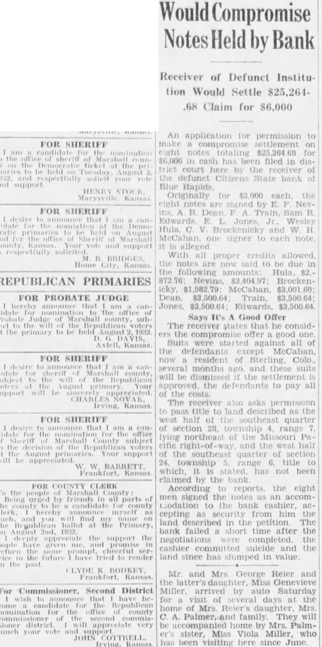 Compromise by Bank Receiver of Defunct Institution Would Settle $25,264.68 Claim for $6,000 An application for permission to FOR SHERIFF make compromise settlement on candidate nomination eight notes totaling for $6,000 in cash has been filed in district court here the receiver August solicit the defunct Citizens State bank support Blue HENRY Originally for the Marysville Kansas eight notes are signed by NevFOR SHERIFF R Dean Train, Sam R desire Wesley didate the Hula, Brockenicky and W signer to each note, County, Your and support alleged With all proper credits allowed, Home the notes are now said to be due in City, the following amounts Hula, REPUBLICAN PRIMARIES Nevins, Brockenicky, McCahan, FOR PROBATE JUDGE $3,500.64 Edwards, Says It's Good Offer Probate Judge the The receiver states that he considthe primary to be August ers the compromise offer good one Suits were started all of Axtell, Kansas. the defendants except McCahan, FOR SHERIFF now resident of Sterling, Colo., several months ago and these suits will be dismissed the subject the the defendants to pay support will the of costs. The receiver asks permission Irving, to pass title to land as the FOR SHERIFF west half southeast quarter of section 28. township range lying northeast of the Missouri PaMarshall County subject cific and west half decision August primaries. Your support of the southeast quarter of section 24, township range 6, title to W. it stated. has not been Frankfort, claimed by the bank FOR COUNTY CLERK According to reports, the eight the Marshall men signed the notes as an accomurged friends candidate county modation to the bank cashier, myself cepting security from him the and find land described in the petition The the ballot Primary, August bank failed short time after the deeply appreciate the support negotiations completed, the pople given cashier committed suicide and the return future have tried to render land since has slumped in value. Mr and Mrs. George Reier and the Miss Genevieve Miller, arrived by auto Saturday for visit several days at the home of Mrs. Reier's daughter, Mrs. A. family. They will be accompanied home by Mrs. Palmsister, Miss Viola Miller, who been visiting here since June.