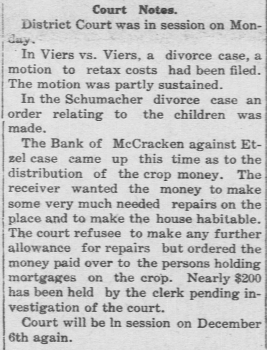 Court Notes. District Court was in session on Monday. In Viers vs. Viers, a divorce case, a motion to retax costs had been filed. The motion was partly sustained. In the Schumacher divorce case an order relating to the children was made. The Bank of McCracken against Etzel case came up this time as to the distribution of the crop money. The receiver wanted the money to make some very much needed repairs on the place and to make the house habitable. The court refusee to make any further allowance for repairs but ordered the money paid over to the persons holding mortgages on the crop. Nearly $200 has been held by the clerk pending investigation of the court. Court will be In session on December 6th again.