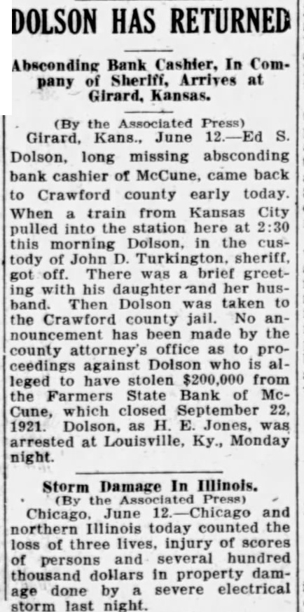 DOLSON HAS RETURNED Absconding Bank Cashier, In Company Sherlff, Arrives at Girard, Kansas. the Associated Press) Girard, Kans., June Dolson, long missing absconding bank cashier of McCune, came back to Crawford county early today. When train from Kansas City pulled into the station here this morning Dolson, in the custody of John sheriff, There was brief greetwith his daughter and her husband. Then Dolson taken the Crawford county jail. No anhas been made by the county office as ceedings against Dolson who leged have stolen $200,000 from the Farmers State Bank of McCune, which closed September 1921. Dolson, as arrested at Louisville, Ky., Monday night. Storm Damage In Illinois. June and northern Illinois today the three lives, injury of scores loss of of and hundred persons thousand dollars in property damdone by severe electrical age storm last night.