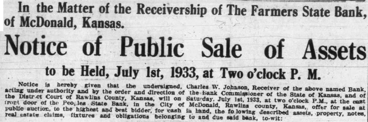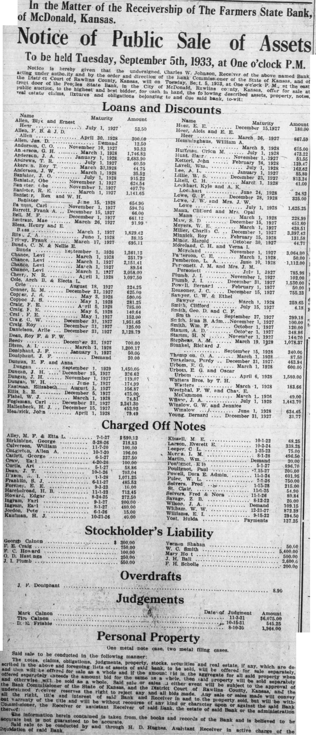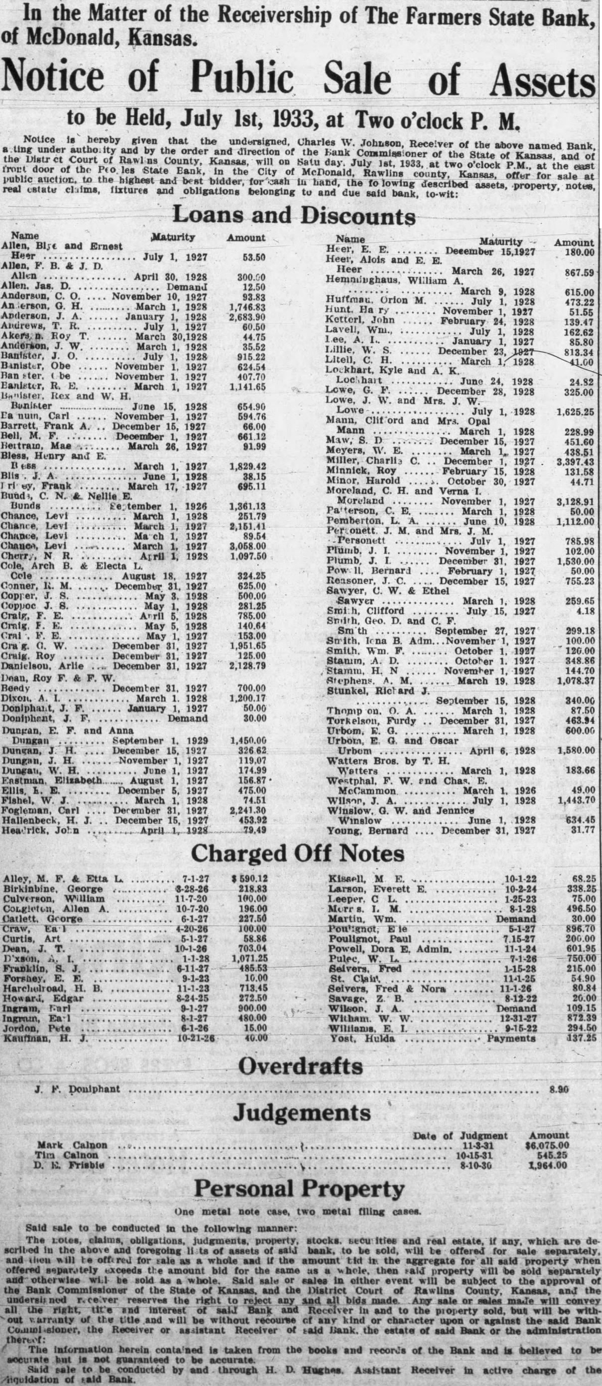 In the Matter of the Receivership of The Farmers State Bank, of McDonald, Kansas. Notice of Public Sale of Assets to be Held, July 1st, 1933, at Two o'clock P. M. Notice is hereby given that the undersigned, Charles W. Johnson, Receiver of the above named Bank, a ting under authority and by the order and direction of the Bank Commissioner of the State of Kansas, and of the Distr ct Court of Rawln County, Kansas, will on Satu day. July 1st, 1933, at two o'clock P.M., at the east front door of the Peo les State Bank, in the City of McDonald, Rawlins county, Kansas, offer for sale at public auction, to the highest and best bidder, for cash in hand, the fo lowing described assets, property, notes, real estate claims, fixtures and obligations belonging to and due said bank, to-wit: Loans and Discounts Overdrafts Said sale to be conducted in the following manner: The Lotes, claims, obligations, judgments, property, stocks. secu ities and real estate, if any, which are described in the above and foregoing ts of assets of said bank, to be sold, will be offered for sale separately, and then will be offered for sale as a whole and if the amount tid in the aggregate for all said property when offered separately exceeds the amount bid for the same as a whole, then said property will be sold separately and otherwise will be sold as whole. Said sale or sales in either event will be subject to the approval of the Bank Commissioner of the State of Kansas, and the District Court of Rawlins County, Kansas, and the undersis ned receiver reserves the right to reject any and all bids made. Any sale or sales made will convey all the right, tit'e and interest of said Bank and Receiver in and to the property sold, but will be without warranty of the title and will be without recourse of any kind or character upon or against the said Bank Commissioner, the Receiver or assistant Receiver of said Bank. the estate of said Bank or the administration thereof: The information herein contained is taken from the books and records of the Bank and is believed to be but is not guaranteed to be accurate. Said sale to be conducted by and through H. D. Hughes. Assistant Receiver in active charge of the liquidation of said Bank. Name Maturity Amount Name Maturity Amount Allen, Blse and Ernest Heer, E. E. December 15,1927 180.00 July 1, 1927 53.50 Heer, Alois and E. E. Allen, F. B. & J. D. Heer March 26, 1927 867.59 Allen April 30. 1928 300.00 Hemminghaus, William A. Allen. Jas. D. Demand 12.50 March 9, 1928 615.00 Anderson, C. O. November 10, 1927 93.83 Huftman. Orion M. July 1, 1928 473.22 An erson, G. H. March 1, 1928 1,746.83 Hunt. Ha ry November 1927 51.55 Anderson. J. A. January 1928 2,683.90 Ketterl, John February 24, 1928 139.47 Andrews, T. R. July 1, 1927 60.50 Lavell, Wm., July 1, 1928 162.62 Akers.n. Roy T. March 30,1928 44.75 January 1, 1927 85.80 Anderson, J. W. March 1, 1928 35.52 Lillie, W. S. December 23, 1927 813.34 Banister, J. O. July 1928 915.22 Litell, C. H. March 1, 1928 41.00 Banister, Obe November 1927 624.54 Lockhart. Kyle and A. K. Ban ster. be November 1. 1927 407.70 Lockhart June 24, 1928 24.82 Banister, R. E. March 1, 1927 1,141.65 Lowe, G. F. December 28, 1928 325.00 Banister. Rex and W. H. Lowe, J. W. and Mrs. J. W. Bunister June 15, 1928 654.90 Lowe July 1928 1, 1,625.25 Ea num, Carl November 1927 594.76 Mann, Clifford and Mrs. Opal Barrett, Frank A. December 15, 1927 66.00 Mann March 1, 1928 228.99 Bell, M. F. December 1, 1927 661.12 Maw, S. D December 15, 1927 451.60 March 26, 1927 91.99 Meyers, W. E. March 1, 1927 438.51 Bless, Henry and E. Miller, Charlis C. December 1, 1927 3,397.43 March 1, 1927 1,829.42 Minnick. Roy February 15, 1928 131.58 Blis A. June 1, 1928 38.15 Minor, Harold October 30, 1927 44.71 March 17, 1927 695.11 Moreland, C. H. and Verna I. Bunds, C. N. Nellie E. Moreland November 1, 1927 3,128.91 Bunds September 1, 1926 1,361.13 Patterson, C. E. March 1928 50.00 Chance, Levi March 1, 1928 251.79 Pemberton. L. A. June 10, 1928 1,112.00 Chance, Levi March 1, 1927 2,151.41 Personett J. M. and Mrs. M. Chance, Levi Ma ch 1, 1927 89.54 Personett July 1, 1927 785.98 Chance, Levi March 1, 1927 3,058.00 Plumb. J. I. November 1, 1927 102.00 Cherry, N R. April 1928 1,097.50 Plumb, J. I. December 31, 1927 1,530.00 Cole, Arch B. & Electa L. Pow 11. Bernard February 1, 1927 50.00 Cole August 18, 1927 324.25 Reasoner. J. C. December 15, 1927 755.23 Conner, R. M. December 31, 1927 625.00 Sawyer, C. W. & Ethel Copper, J. S. May 3. 1928 500.00 Sawyer March 1, 1928 259.65 Coppoe S. May 1928 281.25 Smi h, Clifford July 15, 1927 4.18 Craig, F. E. Anril 5. 1928 785.00 Smith, Geo. D. and C. F. Craig F. E. May 5, 1928 140.64 Sm th September 27, 1927 299.18 Crai F. E. May 1927 153.00 Smith, Iona B. Adm. November 1, 1927 100.00 Cra G. W. December 31, 1927 1,951.65 Smith. Wm. F. October 1. 1927 120.00 Craig. Roy December 31, 1927 125.00 Stamm, A. D. October 1. 1927 348.86 Danielson. Arlie December 31, 1927 2,128.79 Stamm. H. N November 1927 144.70 Dean, Roy F. & F. W. Stephens. A. M. March 19. 1928 1,078.37 Beedy December 31. 1927 700.00 Stunkel, Rich ard J. Dixon. March 1928 1,200.17 September 15, 1928 340.00 Doniphant, J. F. January 1927 50.00 Thomp on. O. A. March 1, 1928 87.50 Doniphent, J. F. Demand 30.00 463.94 Torkelson, Furdy December 31, 1927 Dungan, E. F. and Anna Urbom. E. G. March 1, 1928 600.00 Dungan September 1. 1929 1,450.00 Urbom, E. G. and Oscar Dungan, H. December 15, 1927 326.62 Urbom April 6, 1928 1,580.00 Dungan, J. H. November 1927 119.07 Watters Bros. by T. H. Dungan, W. H. June 1, 1927 174.99 Watters March 1, 1928 183.66 Eastman. Elizabeth August 1927 156.87 Westphal. F. W. and Chas. E. Ellis, h. E. December 5. 1927 475.00 McCammon March 1. 1926 49.00 Fishel, W. J. March 1, 1928 74.51 Wilson, J. A. July 1, 1928 1,443.70 Fogleman, Carl December 31, 1927 2,241.30 Winslow. G. W. and Jennice Hallenbeck, H. J. December 15, 1927 453.92 Winslow June 1, 1928 634.45 Headrick, John April