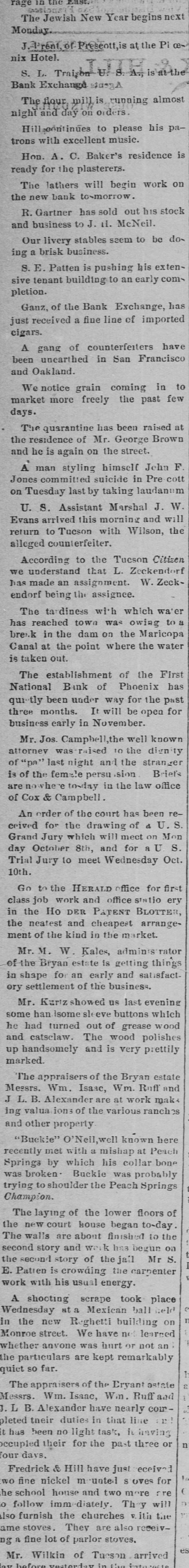The Jewish New Year begins next Monday J.Prent of Preseott,is at the Pl cen nix Hotel. S. L. Trais A., is the Bank Exchange WassA The flour mill is running almost night and day on orders. to please his patrons with excellent music. Hon. A. C. Baker's residence is ready for the plasterers. The lathers will begin work on the new bank to-morrow. R. Gartner has sold out his stock and business to J. 11. McNeil. Our livery stables seem to be dos ing a brisk business. S. E. Patten is pushing his extensive tenant building to an early coms pletion. Ganz, of the Bank Exchange, has just received a fine line of imported cigars. A gang of counterfeiters have been unearthed in San Francisco and Oakland. We notice grain coming in to market more freely the past few days. The quarantine has been raised at the residence of Mr. George Brown and he is again on the street. A man styling himself John F. Jones committed suicide in Pre cott on Tuesday last by taking laudanum U. S. Assistant Marshal J. W. Evans arrived this morning and will return to Tucson with Wilson, the alleged counterfeiter. According to the Tucson Citizen we understand that L. Zeckendorf has made an assignment. W. Zeckendorf being the assignee. The tardiness with which wa'er has reached town was owing to a break in the dam on the Maricopa Canal at the point where the water is taken out. The establishment of the First National Bank of Phoenix has qui-tly been under way for the past three months. It will be open for business early in November. Mr. Jos. Campbell,the well known attorney waseraised 10 the dignity of "pa" last night and the stran_er is of the female persu sion Briefs arenowhere tosday in the law office of Cox & Campbell. An order of the court has been received for the drawing of d U. S. Grand Jury which will meet on Mon day October 8th, and for a U S. Trial Jury to meet Wednesday Oct. 10th. Go to the HERALD office for first class job work and office statio ery in the Ho DER PATENT BLOTTER, the neatest and cheapest arrangement of the kind in the market. Mr. M. W. Kales, adminis rator of the Bryan estate is getting things in shape for an early and satisfact. ory settlement of the business. Mr. Kuriz showed us last evening some han Isome sle eve buttons which he had turned out of grease wood and catsclaw. The wood polishes up handsomely and is very prettily marked. The appraisers of the Bryan estate Messrs. Wm. Isaac, Wm. Ruff and J L. B. Alexander are at work maks ing valua ions of the various ranches and other property "Buckie" O'Neil,well known here recently met with a mishap at Peach Springs by which his collar bone was broken Buckie was probably trying to shoulder the Peach Springs Champion. The laying of the lower floors of the new court house began to-day. The walls are about finished to the second story and work has begun on the second story of the jail Mr S. E. Patien is crowding the carpenter work with his usual energy. A shooting scrape took place e Wednesday at a Mexican ball held n in the new Reghetti building on Monroe street. We have not learned whether anvone was hurt or not an the particulars are kept remarkably quiet so far. 1: The appraisers of the Eryant estate a Messrs. Wm. Isaac, Win. Ruff and J.L B. Alexander have nearly cor pleted their duties in that line has been no light task, it having n occupied their for the past three or four days. Fredrick & Hill have just eceived le wo fine nickel mounted S oves for ( he school house and two more are c follow immediately. They will lso furnish the churches ith the ame stoves. They are also receiva fine lot of parlor stoves, es Mr. Wilkin of Tueson arrived